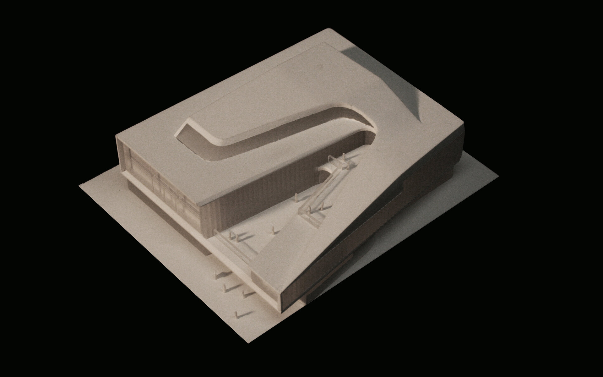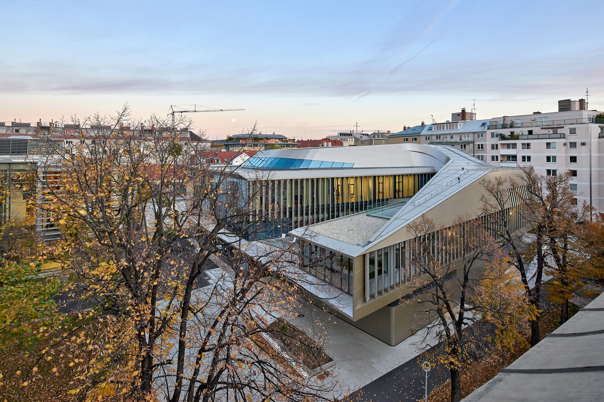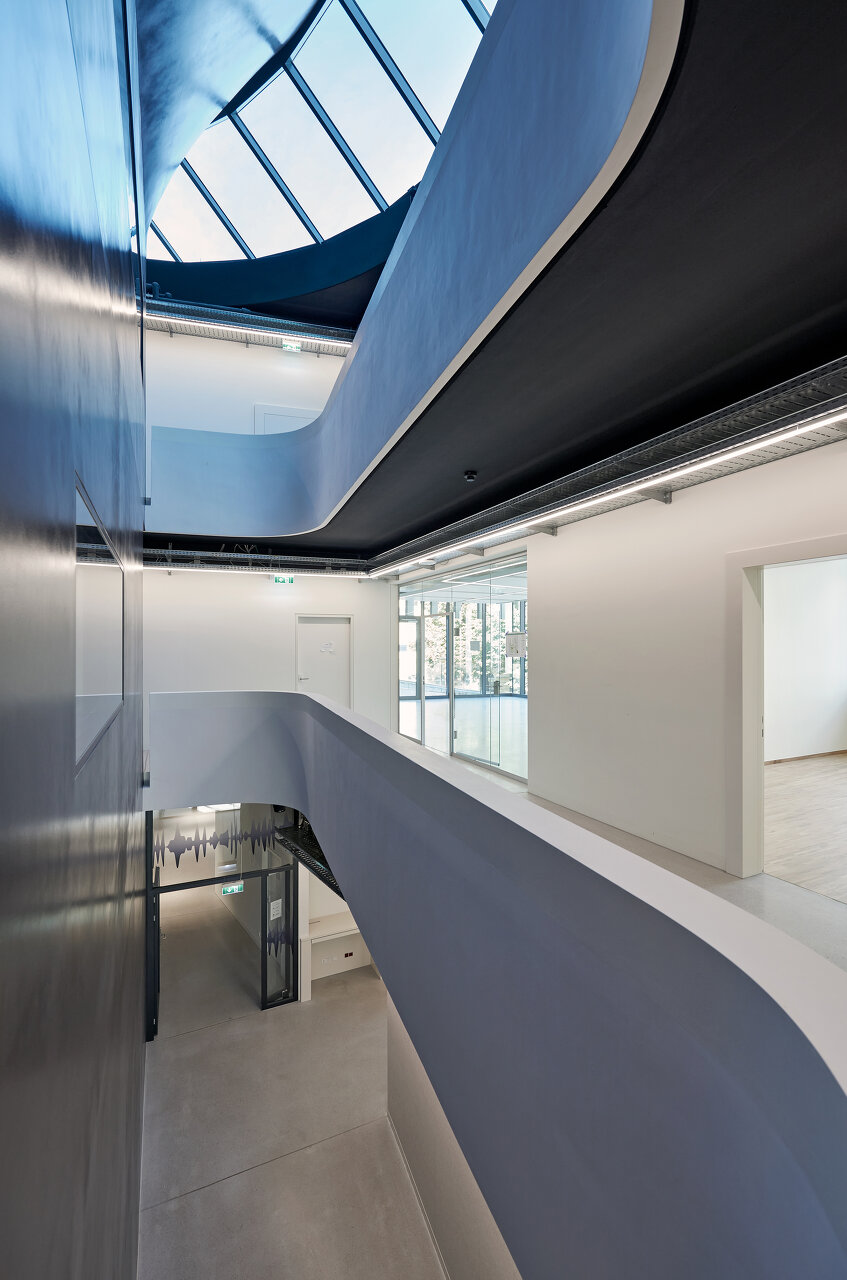 Das Bauwerk kommt mit drei oberirdischen Geschoßen aus, die so ineinander verschachtelt sind, dass jeder Raum die nötige Höhe bekommt. Die innere Organisation ist auf die funktionalen und bauakustischen Anforderungen abgestimmt: kompakt und gleichzeitig mit maximaler Tageslichtexposition. Das Institut für Elektroakustik und Komposition mit großvolumigen Sälen, Klangtheater und Aufnahmesaal ist deshalb im ersten Untergeschoß angesiedelt, mit großzügigen Foyerzonen. Über einen versenkten Hof sind diese Unterrichtsräume dennoch von Osten natürlich belichtet. Die zugehörigen, administrativen Räumlichkeiten befinden sich ostseitig im Erdgeschoß. Das Art House Kino ist direkt vom Foyer erreichbar. Die untere Ebene des Kinosaals verbindet sich mit einem in den Luftraum des Untergeschoßes eingeschobenen Zwischenniveau, das die Seminarräume beinhaltet. Die Filmakademie, das flächenmäßig größte Institut nimmt das gesamte 1. Obergeschoß ein. Der tiefe Einschnitt, geführt in Linie einer Sinuskurve vom Dachgeschoß beginnend, bringt Licht in die Tiefe des Hauses und erzeugt zugleich in beiden Stockwerken Terrassen, die den Institutsräumen vorgelagert sind. Dem Institut für Tasteninstrumente ist das zurückweichende 2. Obergeschoß vorbehalten. Es gruppiert sich ebenfalls um seinen Nukleus, dem Konzertsaal. Mit dessen Raumhöhe wird das baurechtlich mögliche Dachvolumen genützt und er ist ebenfalls natürlich belichtet.