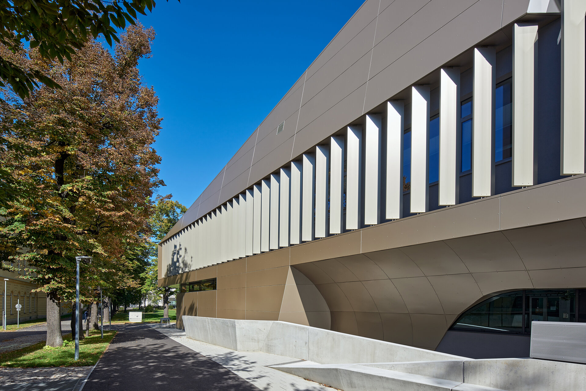 Die Sonnenschutzlamellen spielen auch in der architektonischen Durchbildung Rolle. Auf der dem Campus zugewandten Nordfassade ist eine zweite, sonnenschutzbeschichtete Glasebene vorgeblendet. Insgesamt erhält das Gebäude damit ein markantes, offenes Erscheinungsbild in seiner Hauptansicht. (Text: Architekten, bearbeitet)