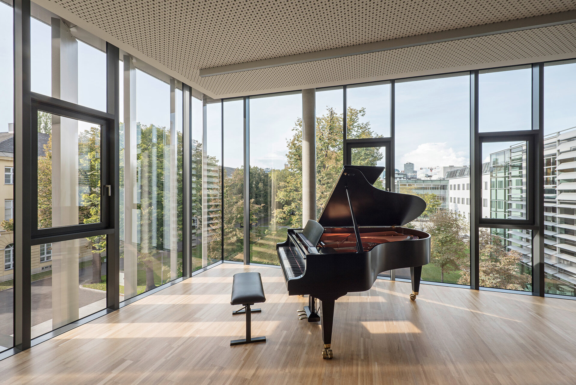 Für alle Räume und Säle mit sehr hohen akustischen Anforderungen ist eine Raum-in-Raum-Bauweise vorgesehen. Es ist daher die äußere Stahlbeton-Tragstruktur von der inneren vollkommen entkoppelt und auf einem Masse-Feder-System gelagert. Ergänzend ist das gesamte Institut für Tasteninstrumente auf einer eigenen, schwimmenden Stahlbetonplatte, unabhängig von der primären Stahlbetondecke, aufgesetzt. Darüberhinaus gibt es Pufferbereiche wie Flure und Zwischenräume. Zwei wesentliche Konstruktionsprinzipien dienen ferner der Raumakustik: Diffusität – über Wand- und Deckenverkleidungen, wie z.B. konvexe Elemente – und Raumbedämpfung, mit schallabsorbierenden Vorhängen.