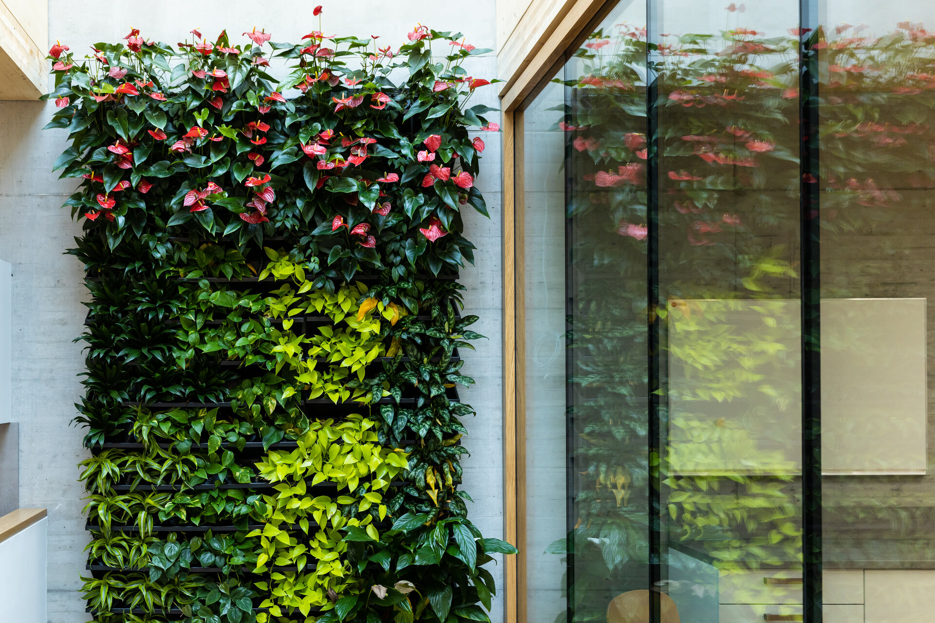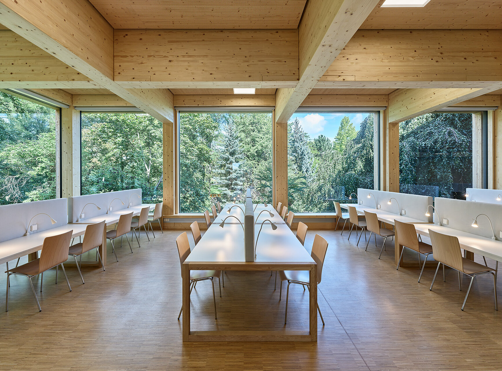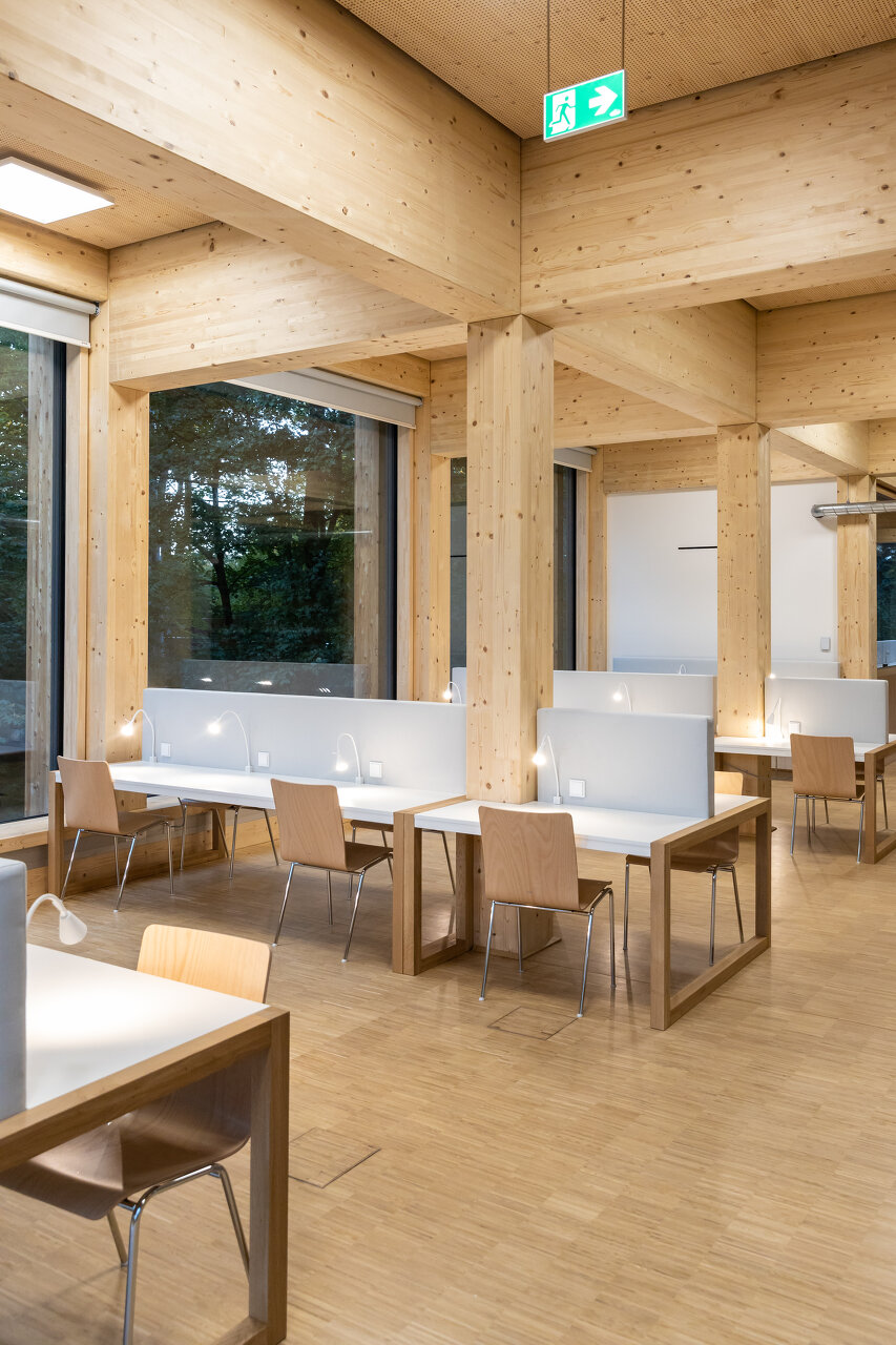 Beim Wettbewerb für den Neubau am zentralen Standort – benannt nach der ersten Dissertantin der Universität Ilse-Wallentin-Haus – konnte sich dasselbe Team gegen eine Konkurrenz von 60 Teilnehmern durchsetzen. Das Projekt ist perfekt auf die geforderte Nutzung zugeschnitten: ein teilweise ins Gelände eingegrabenes Sockelgeschoß mit Seminarräumen, darüber ein Eingangsgeschoß mit Foyer und zwei großen Vortragsräumen, dann die Bibliotheksräume und in den beiden obersten Geschoßen die Institutsräume. Ein kleines Atrium, das die Sozialräume der beiden Institutsgeschoße verbindet, bringt zusätzliches Licht in die Mitte des Baukörpers. An der Fassade ist diese Gliederung klar ablesbar: Foyer und Bibliothek haben Fenster im beachtlichen Format von 3,4 mal 3,4 Metern, die den Benutzern das Gefühl vermitteln, zwischen den Bäumen der Umgebung zu sitzen. Dass die Fensterbänke genau auf Sitzhöhe liegen, ist ein Angebot, das von den Nutzern gerne angenommen wird. Konstruktiv sind die Geschoße unterschiedlich aufgebaut: das Untergeschoß und alle erdberührenden Teile aus Stahlbeton, die beiden ersten Geschoße als Holzskelettkonstruktion und die Bürogeschoße aus verleimten KLH-Massivholzplatten. Ein Kern aus Stahlbeton, der Treppen, Lift und Sanitärräume aufnimmt, gibt der Konstruktion Stabilität.