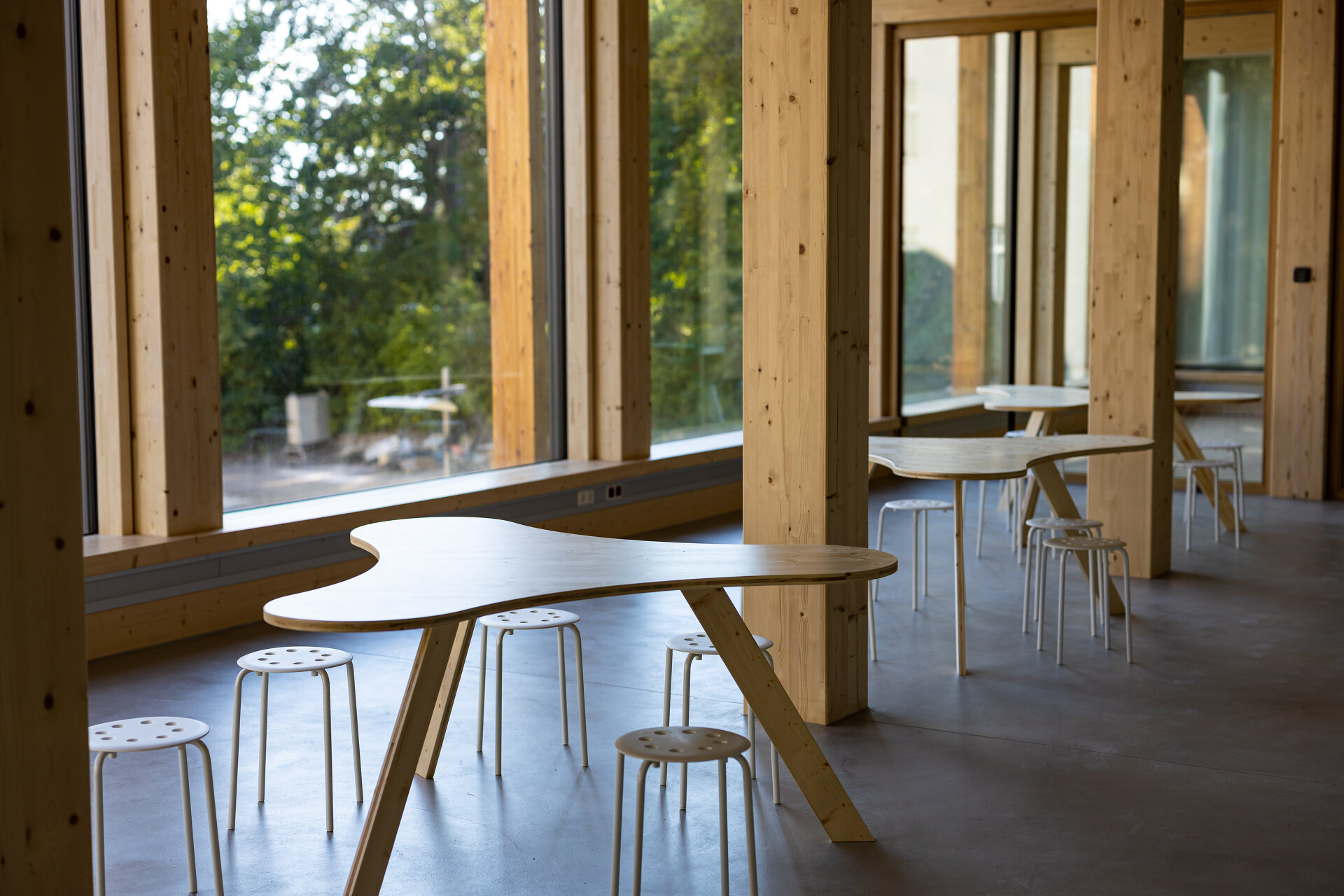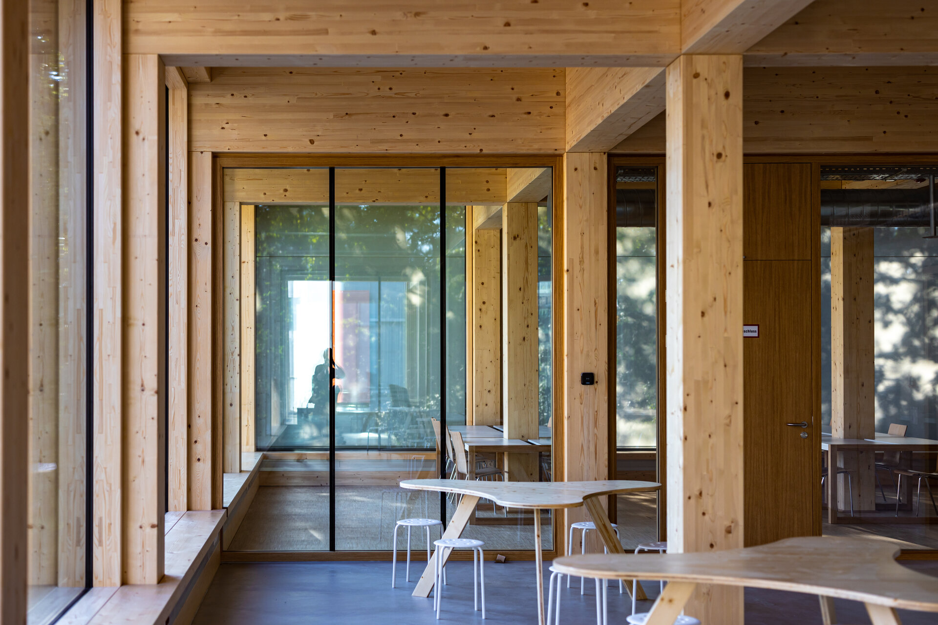 Dass die Konstruktion „leicht“ wirkt, liegt an einem einfachen Kunstgriff. Was an der Fassade als zarte vertikale und horizontale Tragkonstruktion erscheint, ist nur Dekor. Das ist besonders auffällig in der überdeckten Kolonnade vor dem Eingang: Die Stützenreihe trägt nicht, sondern hält sich gewissermaßen am auskragenden Deckentragwerk des ersten Geschoßes an. Ist diese „Scheinfassade“ deshalb überflüssig? Nein. Sie zu entfernen hätte denselben verstörenden Effekt wie aus einem Gesicht die Augenbrauen zu rasieren. Mit ihrer Erfahrung im Holzbau sind SWAP Architekten inzwischen auch international erfolgreich. Gerade haben sie einen Wettbewerb für ein Innovationslabor für „Grüne Chemie“ an der TU Berlin gewonnen, ein massives Gerüst mit viel Transparenz, das durch Vorfertigung und kurze Bauzeit punktet.