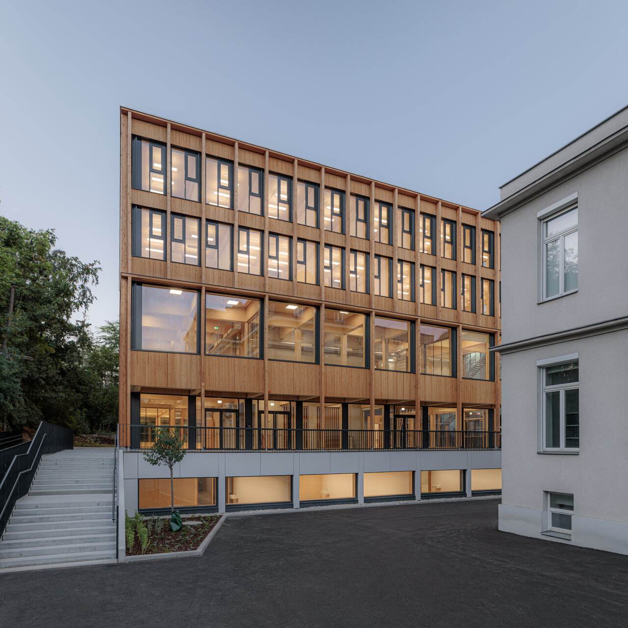Unmittelbar neben diesem Gebäude war allerdings noch Platz für einen Zubau, ein leicht geböschtes Areal, umgeben von alten Bäumen. Hier sollten zusätzliche Flächen für Institutsräume sowie ein Seminarzentrum und eine Erweiterung der Bibliothek errichtet werden. In der Ausschreibung für den Architekturwettbewerb im Jahr 2017 war explizit ein konstruktiver Holzbau gefordert. Dass eine Universität, die der Land- und Forstwirtschaft ihre Gründung verdankt, aus diesem Material auch bauen möchte, ist naheliegend. Bereits 2014 hatte sie sich beim Wettbewerb für eine neues, 200 Meter stadteinwärts gelegenes Institutsgebäude für einen Entwurf des Büros Baumschlager-Hutter entschieden, bei dem immerhin die Fassade aus vertikalen Holzlamellen besteht. Dass man diesmal einen Schritt weiter gehen und auch das Tragsystem aus Holz errichten wollte, hing nicht zuletzt mit den guten Erfahrungen zusammen, die man bei einer Außenstelle der Universität in Tulln gemacht hatte. Dort hatte das Architekturbüro SWAP in Kooperation mit Delta Projektconsult ein Laborgebäude in Holzkonstruktion errichtet, der 2018 in der Kategorie „Öffentlicher Bau“ den österreichischen Holzbaupreis erhielt.