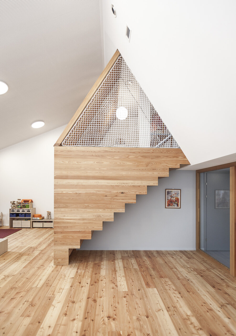Die beiden Gruppenräume sind Richtung Osten, zur benachbarten, landwirtschaftlich genutzten Grünfläche orientiert. Die über eine Holzfalttreppe erreichbaren, als „Haus im Haus“ konzipierten Rückzugsbereiche im Galeriegeschoss erweitern die Gruppenräume nach oben und erlauben so vielgestaltige Spielmöglichkeiten in alle Richtungen. Die inneren Raumfolgen sind spannungsvoll und abwechslungsreich. Eine wohnliche Architektur ohne jeden überheblichen Gestus, die eine hohe Aufenthaltsqualität und vielfältige Ein- und Ausblicke bietet. (Text: Architekt:innen, bearbeitet)