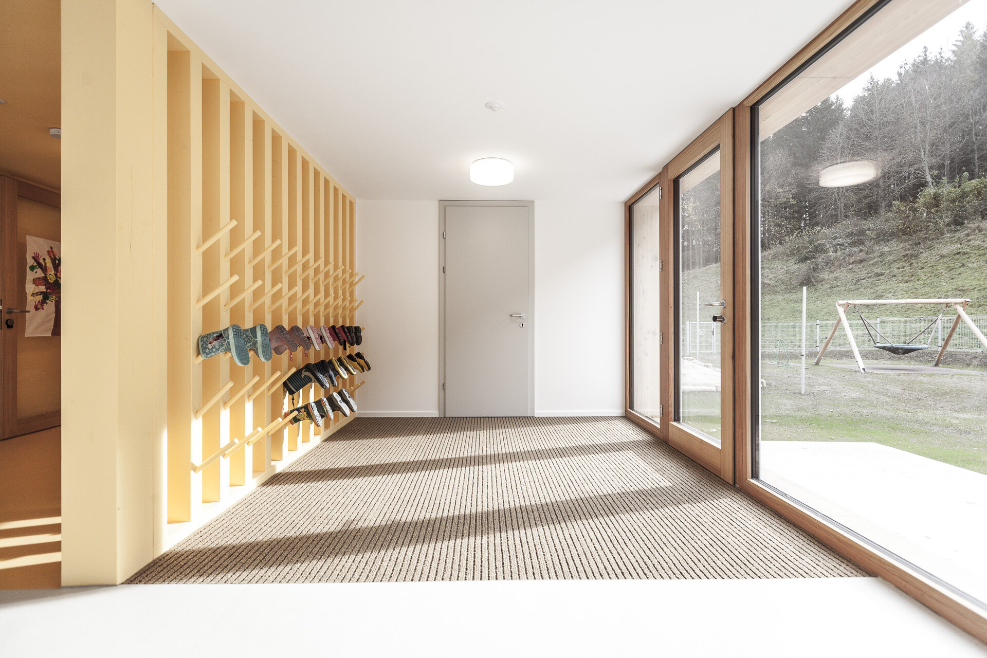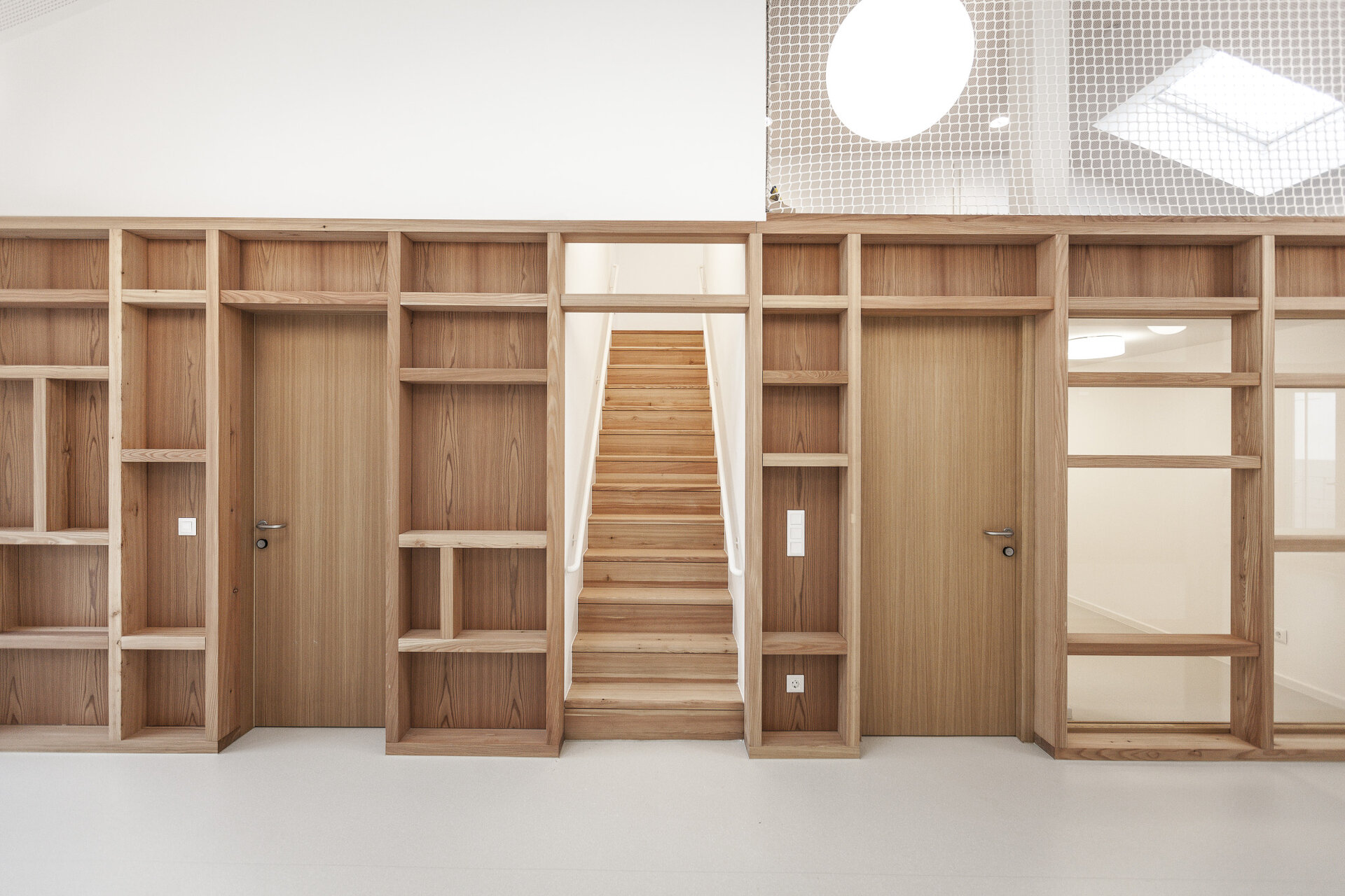 Über einen Windfang betritt man einen großzügigen Aula- und Ankunftsbereich – ein multifunktionales Inneres. Über die gesamte Tiefe des Raumes verläuft ein aus Lärchenholz gefertigter Setzkasten, der als Ausstellungsregal für Kunstwerke der Kinder dient. Er bildet zudem eine Art Raumteiler zu den dahinterliegenden Räumlichkeiten wie Multifunktionsraum, Küche und Personalraum. Darüber, im Galeriegeschoss, befindet sich ein zur Aula hin offen gestalteter Lesebereich.