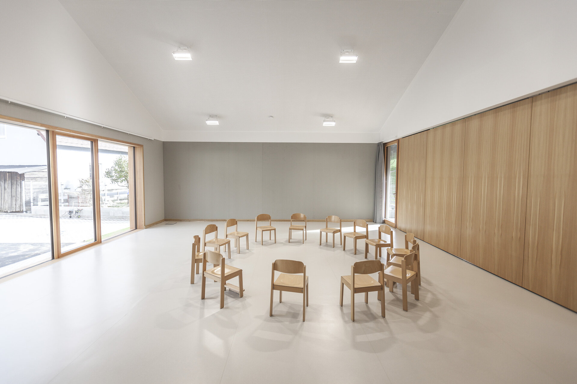 Unmittelbar gegenüber dem Setzkasten findet sich der zum Vorplatz hin orientierte Bewegungsraum, der mittels einer mobilen Trennwand zum Foyer hin erweiterbar ist. Eine großzügige Öffnung dient hier als „Fenster zum Dorf“ und erlaubt gegenseitige Blickbeziehungen.