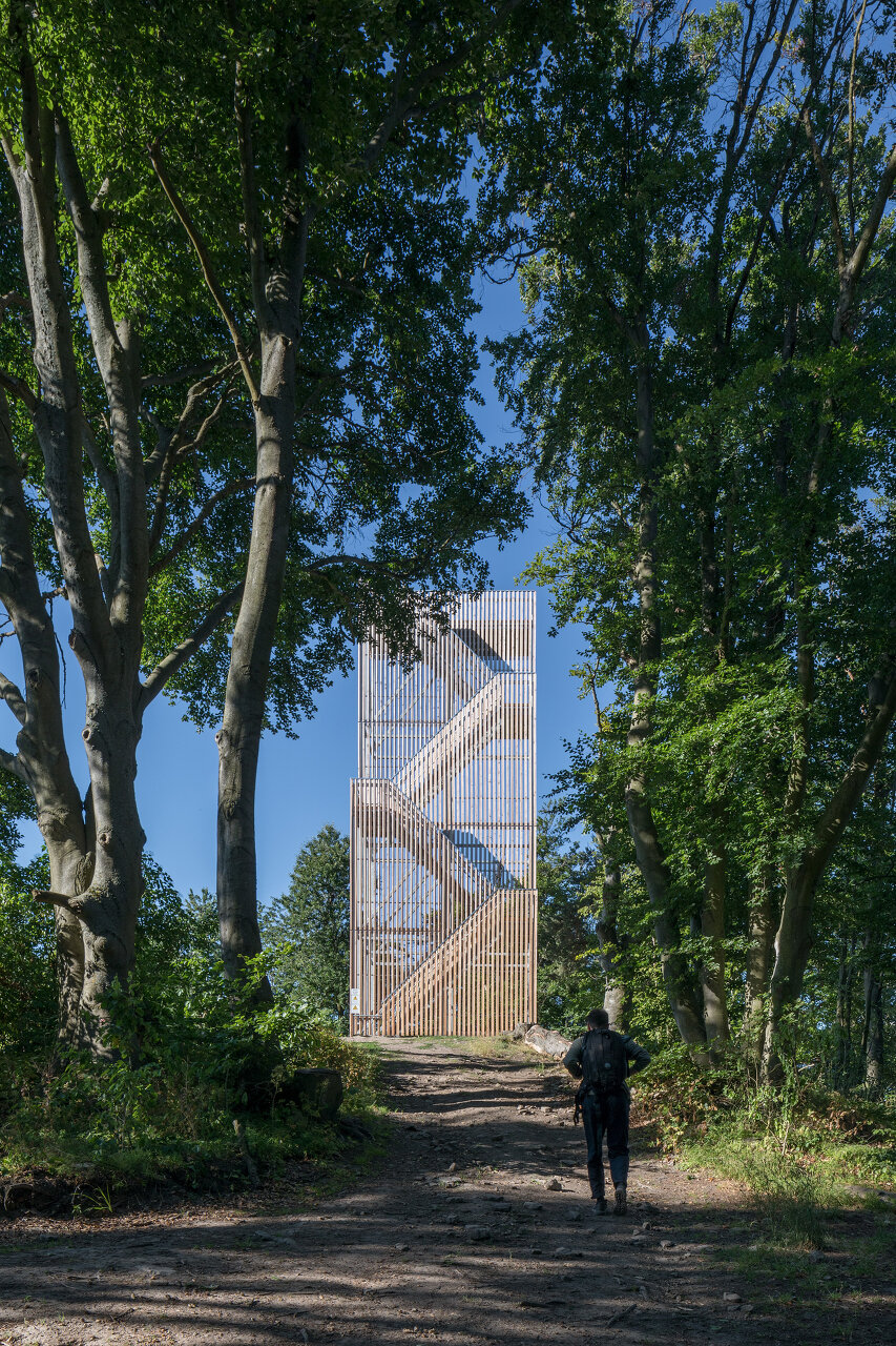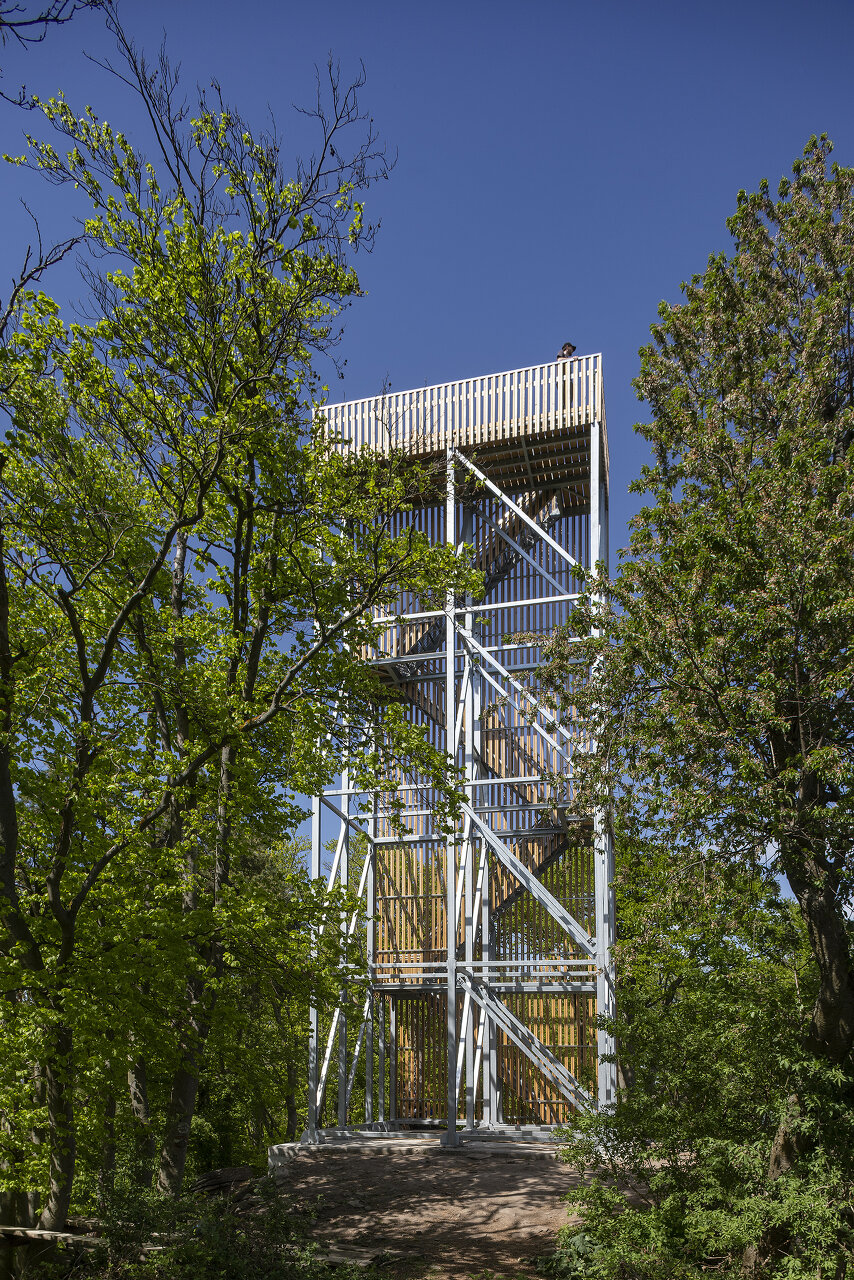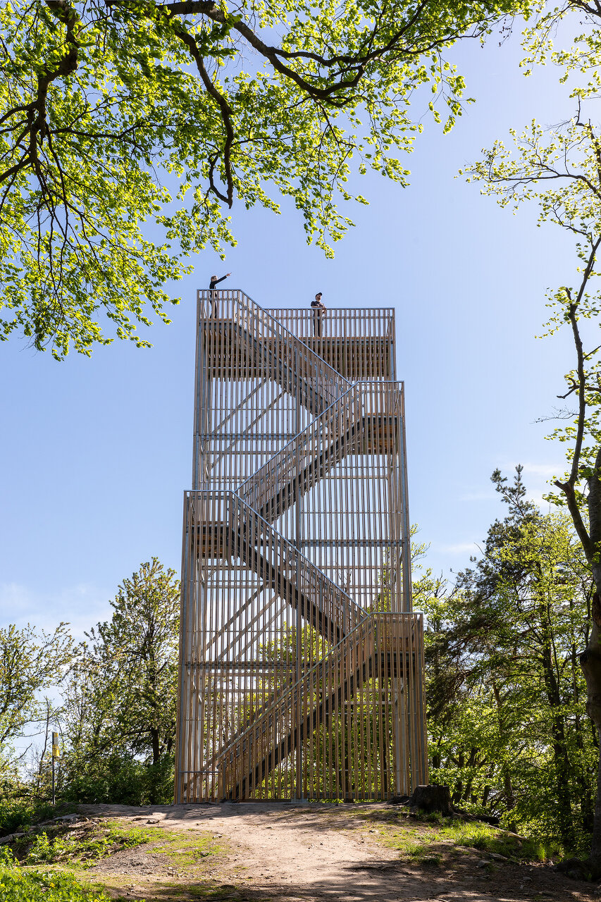 Der Turm ist nur zu Fuß erreichbar, er ist eine künstliche Verlängerung des Aufstiegs, eine Erhöhung der 671 Meter hohen Erhebung zum Gipfel. Langt man auf dem Seekopf an, fällt von Westen kommend der Blick auf ein Stahlgerüst, offen, blank, reduziert, wie die Rückseite einer Bühnenkulisse oder wie ein Hochspannungsmast.