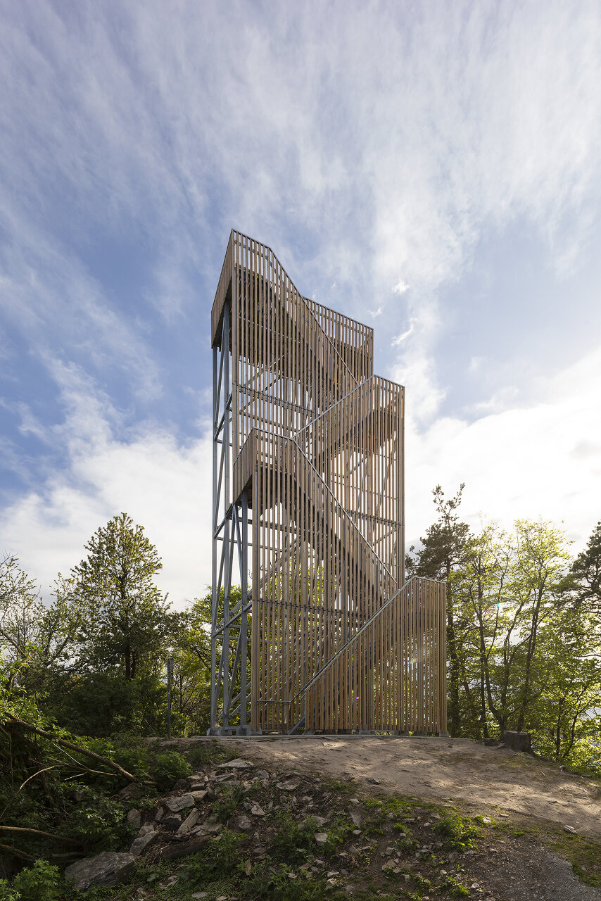 Die Stirnseite sämtlicher Geländer wird von einer schmalen, durchgehenden Metallabdeckung bedeckt. Diese rahmt die Wegeführung und ist gleichzeitig Schutz für das unbehandelte Lärchenholz vor der Witterung. Das Betonfundament, auf dem der Turm verankert ist, wird als trockener Rastplatz von den Wandernden genutzt, die umlaufende Metallstrebe zur Sitzgelegenheit umgedeutet. Die imaginäre Grenze, die vierte Wand zwischen der Bühne und dem Publikum, zwischen Kulisse und realer Umgebung ist durchbrochen.