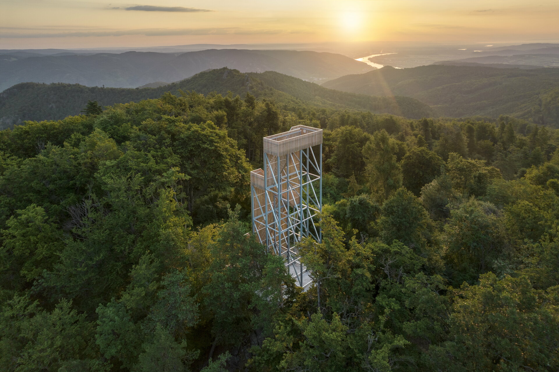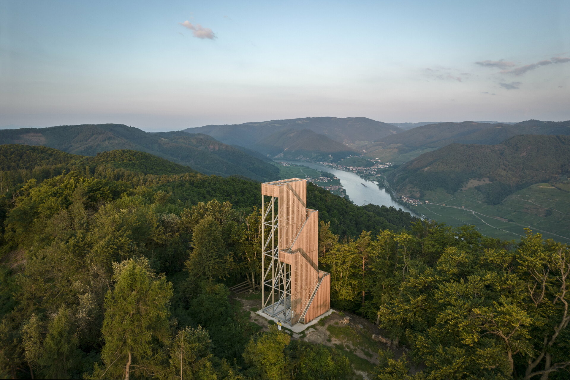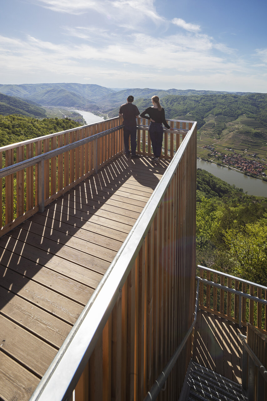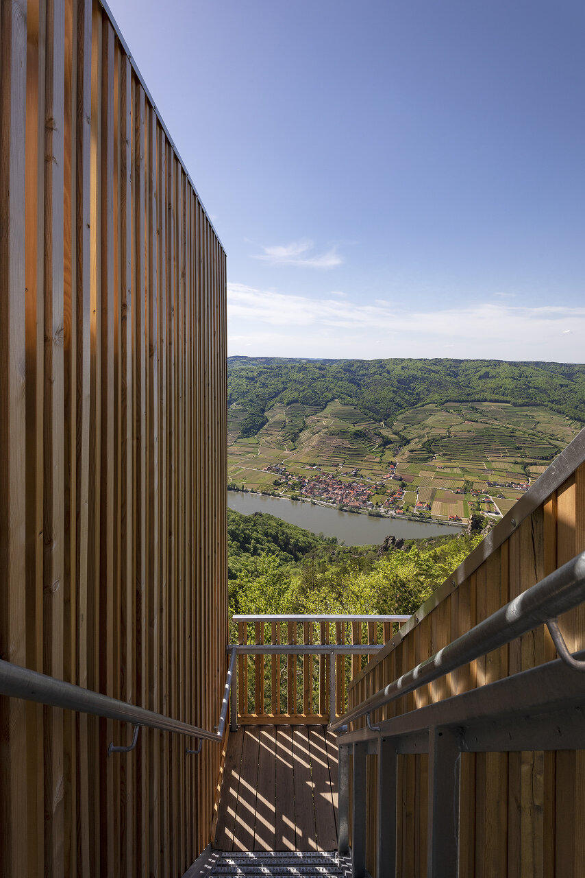 Der Aufstieg ist theatralisch, eine schmale, steile Stiege führt an der Außenseite des Turms nach oben. Jede Kehre steigert die Spannung. Wie beim Zickzackweg auf den letzten Metern zum Gipfel. Oben angelangt verlangt es die Dramaturgie, dass man auf der Plattform nach vorne gehen muss um die wirklich beeindruckende Aussicht über die Wachau zu haben. Die relativ schmale, Richtung Donau orientierte Plattform kanalisiert den Blick, ist eine dramatische Setzung.