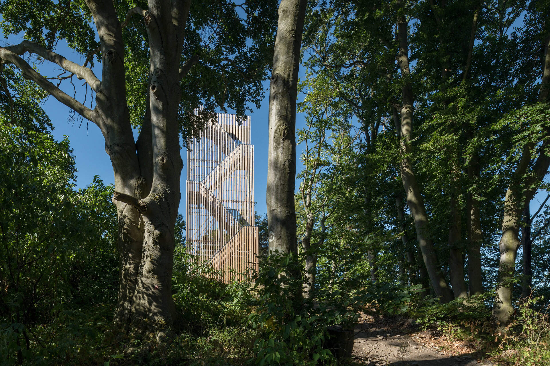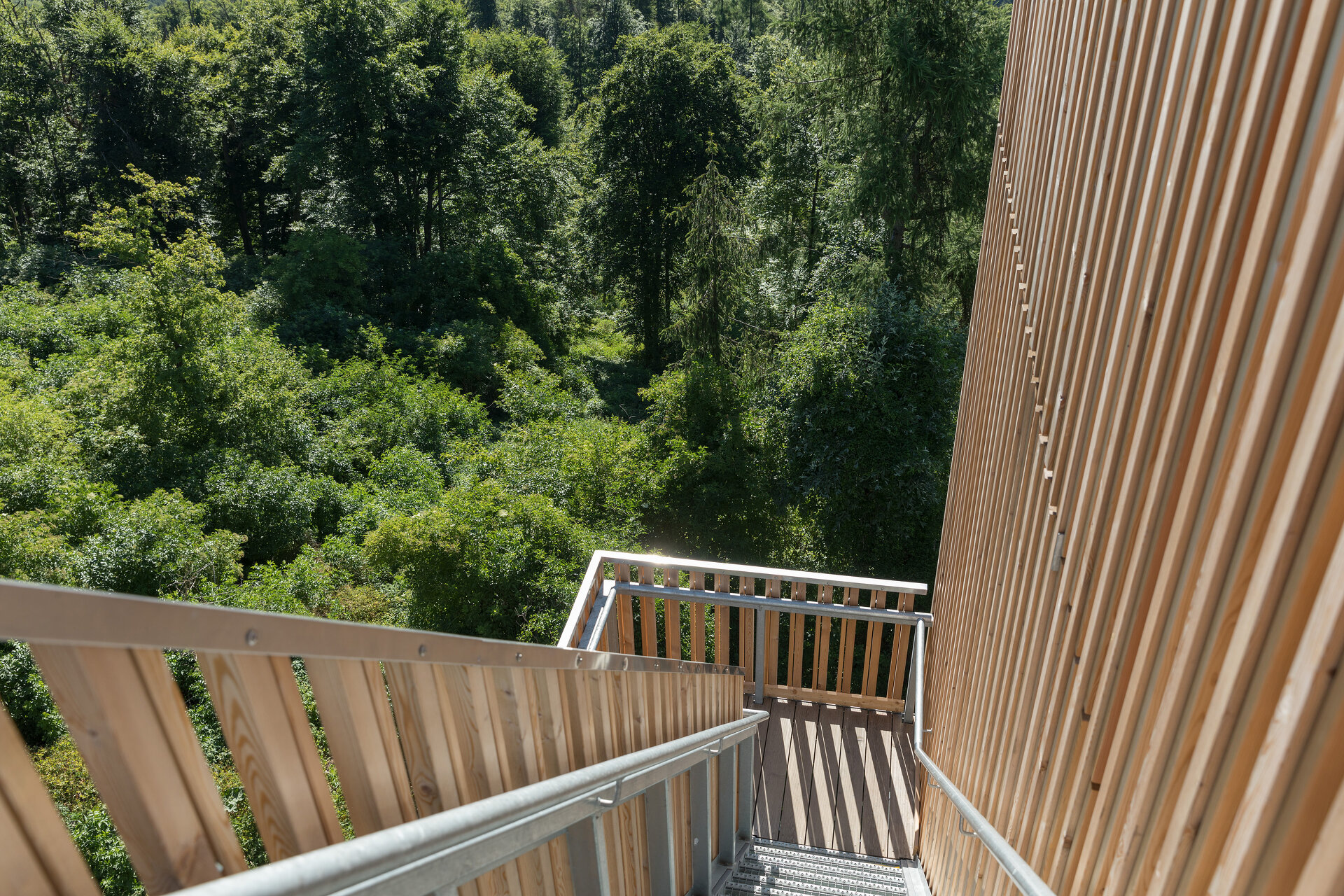 Von der anderen Seite bietet sich den Ankommenden der Blick auf eine Fassade aus filigranen, reliefartig angeordneten, vertikal durchgängigen Latten aus Lärchenholz. An dieser scheinbaren Wand entlang staffelt sich eine Stiege räumlich versetzt nach oben. Durch die Holzlatten hindurch schimmert die Struktur der offenen Stahlkonstruktion wie auch der umgebende Wald – die Ebenen verschwimmen ineinander.