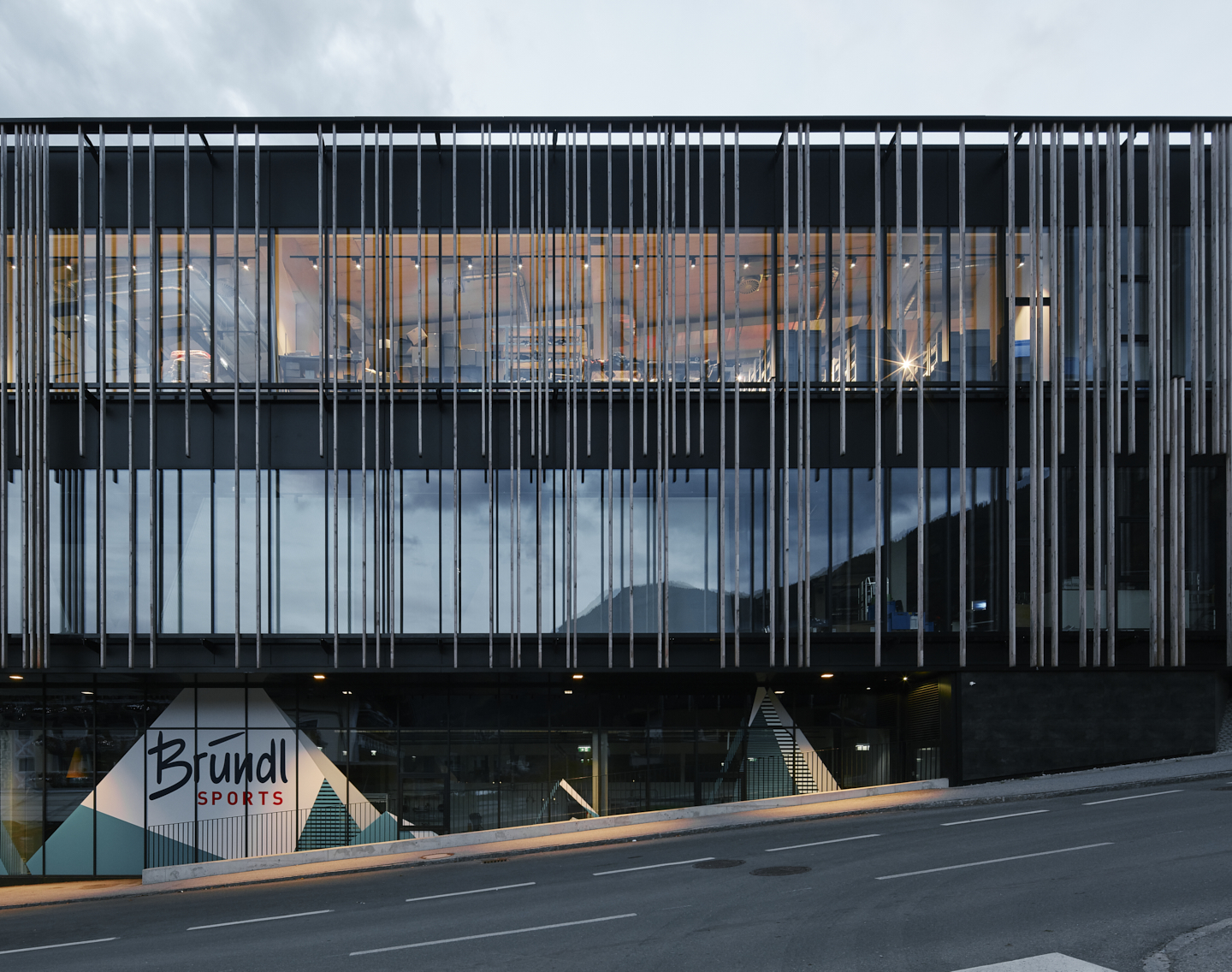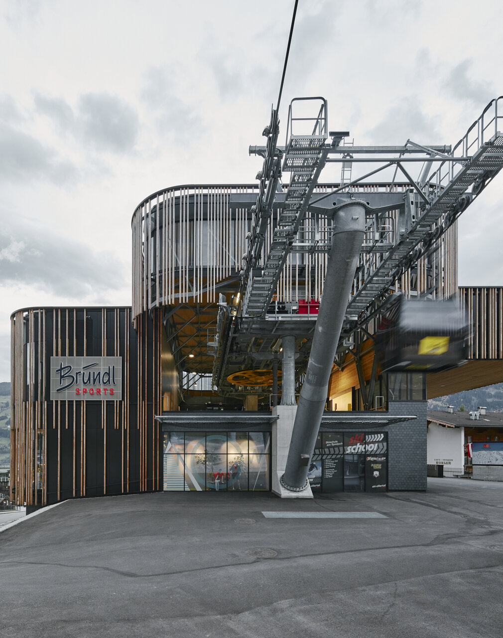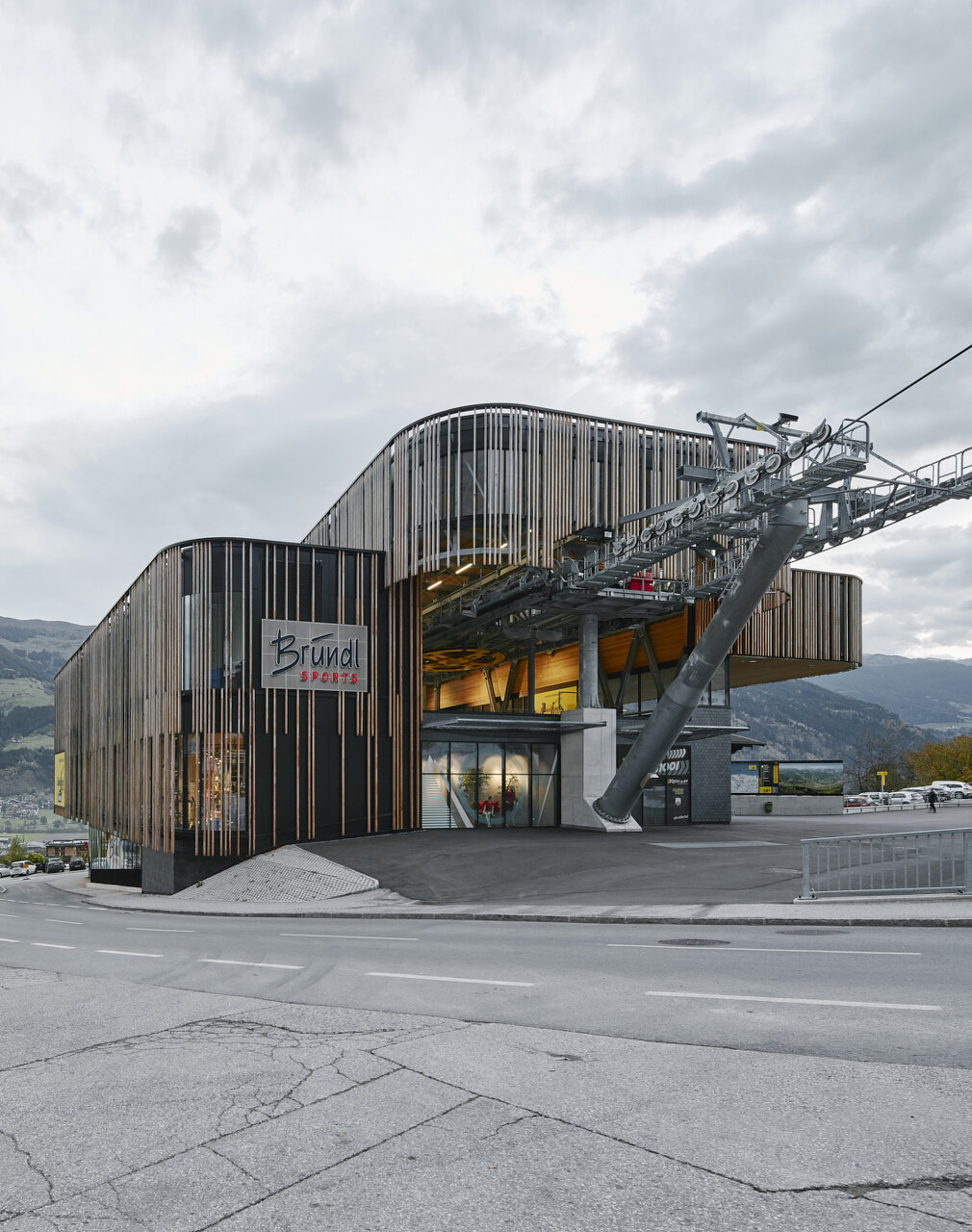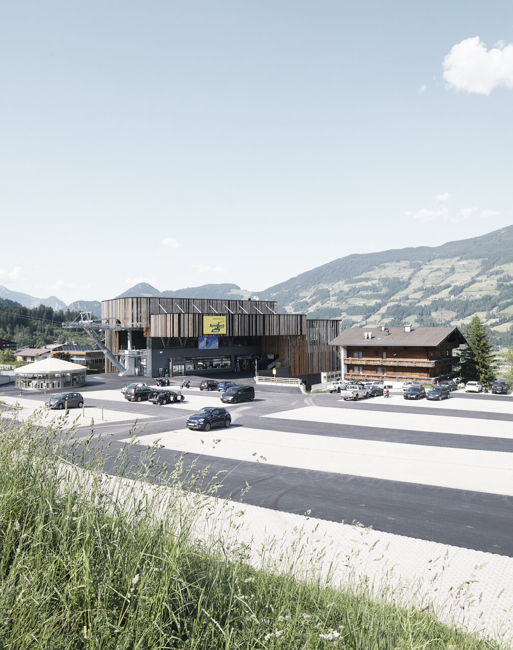 Die beinahe vollflächig verglasten Fassaden sind im Erd- und Obergeschoß mit unterschiedlich langen vertikalen Holzlatten verschalt, die durch ihren unterschiedlichen Abstand den Baukörper je nach Blickwinkel und Tageszeit eher geschlossen bzw. offen erscheinen lassen. Ausgeführt wurde das Gebäude der Talstation in einer Mischbauweise aus Stahlbeton für die Volumen der eigentlichen Geschosse und aus von Stahlwachwerken getragenen BBS-Massivholzplatten für die Vorplatzüberdachung und das Dach des Seilbahnbereichs. Das Objekt wird über Fernwärme beheizt und verfügt über eine Lüftungsanlage mit Wärmerückgewinnung. (Text: Claudia Wedekind, nach einem Text des Architekten)