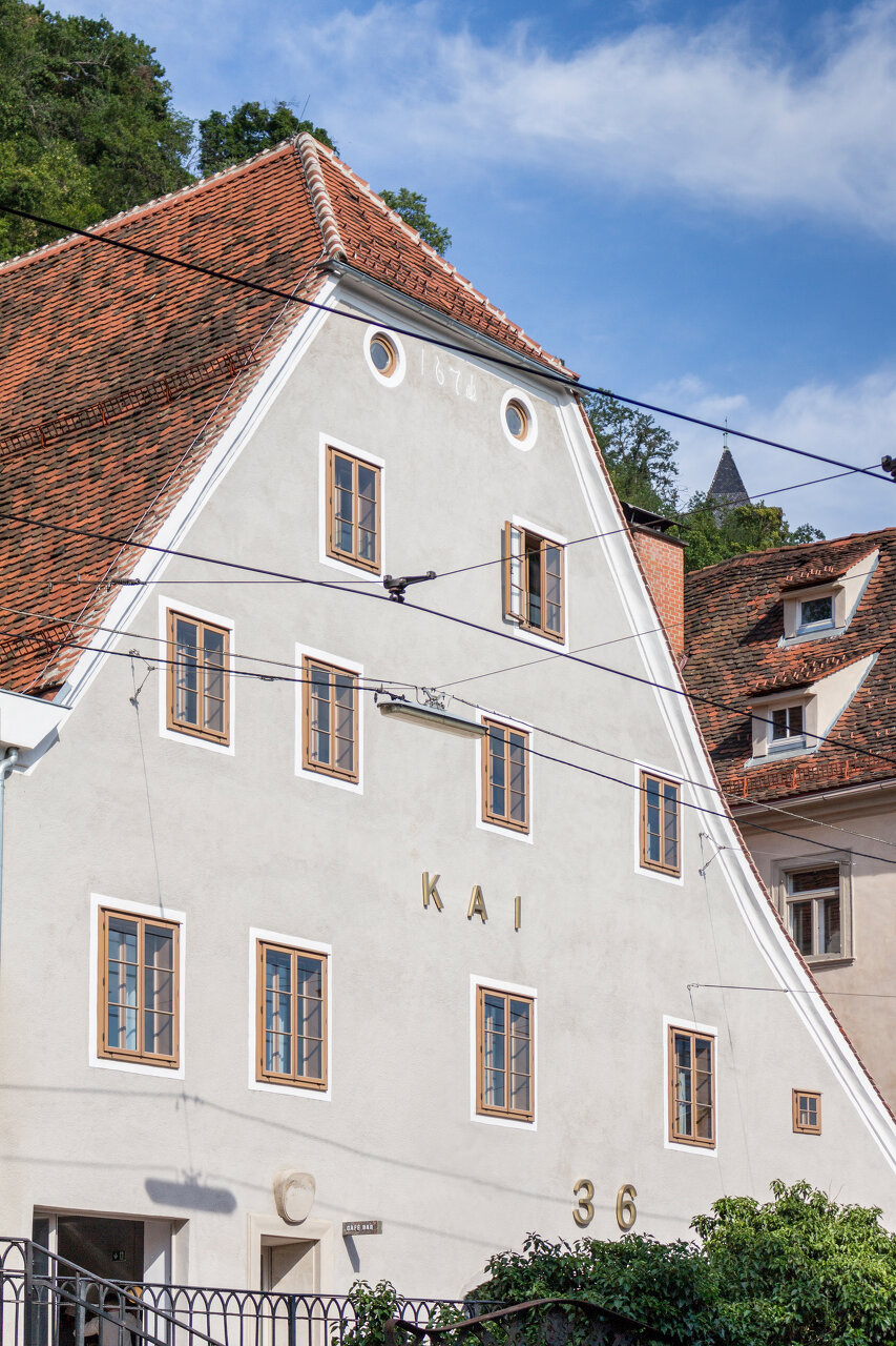 Nun kam es ganz anders, doch da das Planen und Bauen lange Vorlaufzeiten verlangen und einiges zu diesem Zeitpunkt schon „in der Pipeline“ war, wurden 2020 in Graz tatsächlich zwei neue Hotels eröffnet. Das der Hotelkette beim Hauptbahnhof muss nicht extra vorgestellt werden. Das andere jedoch, das sich bescheiden nach seiner Adresse nennt, lohnt näherer Betrachtung. Es vereint in sich mehrere Themen des Bauens im historischen Zentrum von Graz, die eine Herausforderung für das Weltkulturerbe sind. „Kai 36“ liegt in der Verlängerung der Sackstraße, einer der ältesten Straßen von Graz am Fuße des Schlossbergs, die durch ein Tor vom Kai am Ufer der Mur getrennt war. Auch wenn sich der Blick dort weiten kann und die Uferstraße von Bäumen gesäumt ist, stehen die Häuser am Kai dicht aneinandergebaut, mit dem Rücken zum steilen Hang des Schlossbergs. Das Haus mit einem auffallend weit ausladenden Schleppdach über drei Geschoße nimmt eine Sonderrolle ein. Es ist eines der ältesten, in der zweiten Hälfte des 16. Jahrhunderts errichtet. Trotzdem stand es lange leer, bis der Grazer Rennsportmanager Helmut Marko es kaufte und beschloss, es auszubauen und seinem Portfolio von drei Hotels hinzuzufügen. Der Umbau wurde in die Hände von Nicole Lam gelegt, die bereits den jüngsten Neubau, das Hotel „Lend“, für den Hotelier geplant hatte.