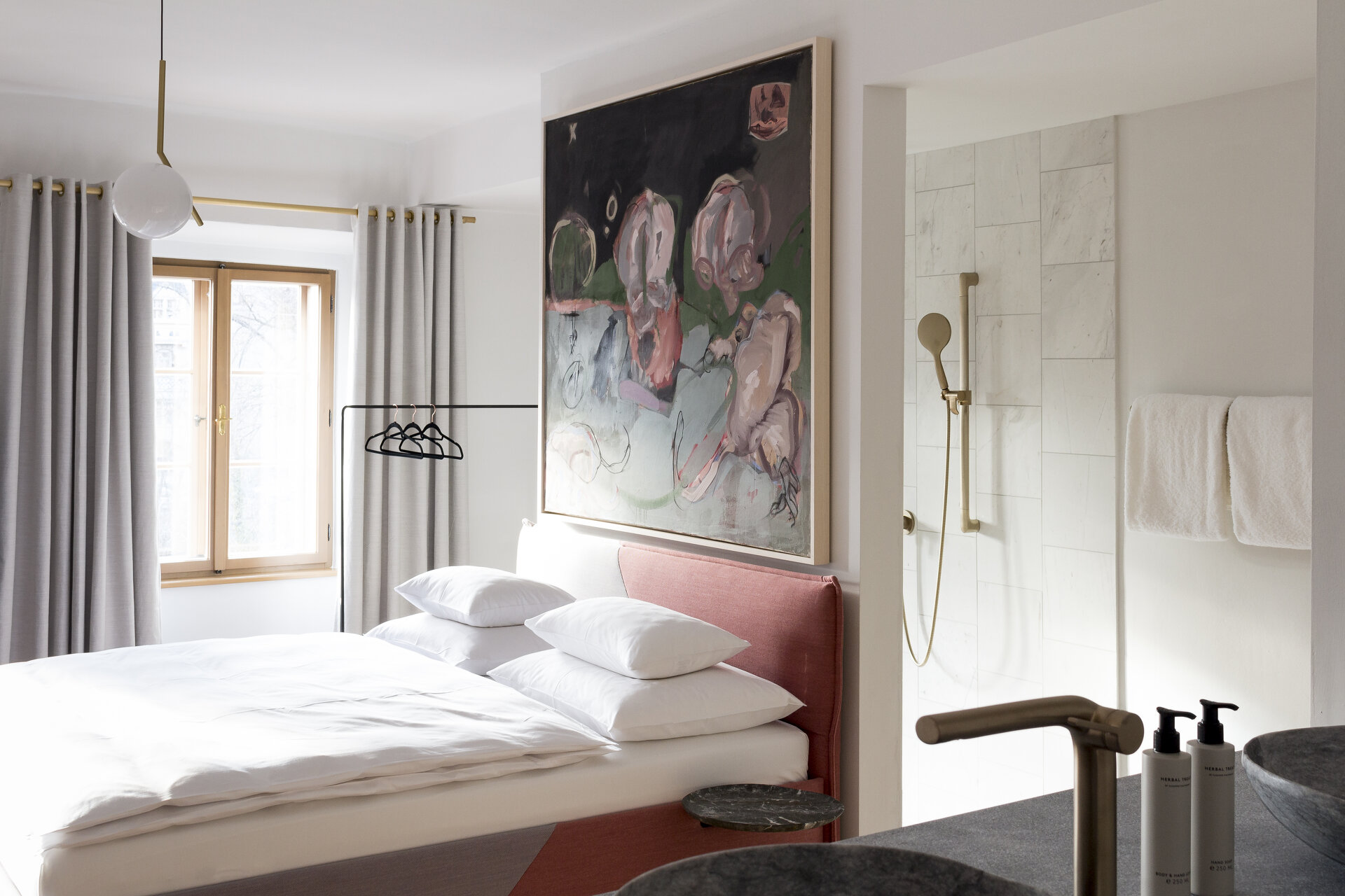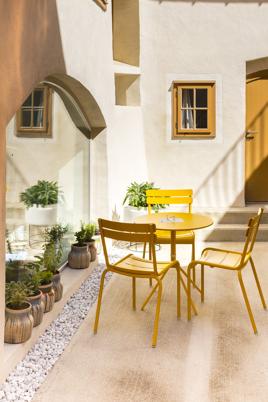 Die Gäste erwarten 21 individuell gestaltete Zimmer, die mit dem Lift, im Stiegenaufgang oder über den kleinen Innenhof erst gefunden werden wollen. Wenn auch unter den riesigen Dachflächen das Gebälk sichtbar blieb, so zeigt sich doch überall im Inneren das Bedürfnis der Architektin, dem Haus ohne rechte Winkel eine frische, unkonventionelle Note zu verleihen. Sanitärzellen bleiben als Raum im Raum ersichtlich, und die Treppe ins oberste Geschoß wird als formschönes, kompaktes Möbel gestaltet. Wo nichts im Lot war, wurden Böden so verlegt, dass Puristen vermutlich die Nase rümpfen – schräg, in ungewöhnlichen Formaten und im Materialmix Naturstein und matt belassenes Holz. Nichts wirkt luxuriös. Öffentliche Bereiche wie das Café, das auch der Frühstücksraum für die Hotelgäste sein wird, sollten die Intimität von Wohnräumen spiegeln. Was man aus Lokalen in hippen Stadtquartieren von Berlin oder München kennt, findet sich auch hier – Naturmaterialien und Detailverliebtheit, ein üppiger Mix an Mobiliar und überall Kunst an den Wänden.
