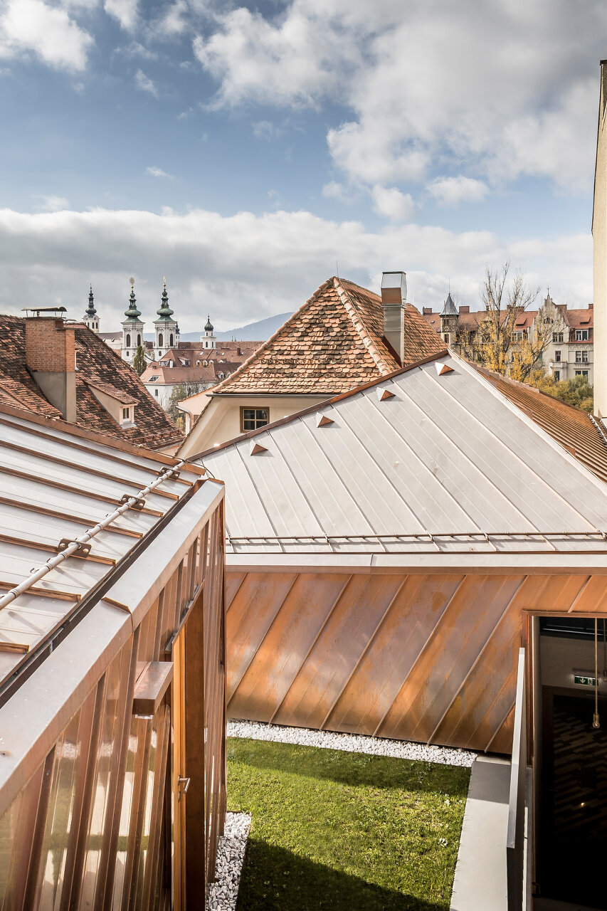 Mit dem unter Denkmalschutz stehenden Ensemble betrat die Grazer Architektin Neuland. In enger Abstimmung mit dem Denkmalamt und der Altstadtkommission wurde die historische Struktur freigelegt und lediglich ein neuer Treppenaufgang geschaffen, der nun auch innen liegend den Hofflügel erschließt, der früher nur über einen Balkon zugänglich war. Anstelle eines steilen Pultdachs wurden diesem Hoftrakt zwei Ebenen mit Hotelzimmern aufgesetzt. Das Haupthaus blieb in seiner ursprünglichen Gestalt erhalten, die Fassade wurde denkmalgerecht saniert. Mehrere Achsen im Erdgeschoß schloss die Architektin durch gut gesetzte Durchgänge zu einem Kontinuum mit unterschiedlichen Gewölben zusammen, die jetzt eine Café-Bar mit kleiner, offener Küche, die Rezeption und den Treppenaufgang enthalten. In diesem zur Straße gewandten Bereich, der vermutlich auch in früheren Zeiten unterschiedliche Funktionen hatte und jetzt noch durch Stufen unterbrochen wird, entstanden atmosphärisch differenzierte Orte des Verweilens. Das radikal Neue zeigt sich erst, wenn man mit Lift oder Treppe an Höhe gewinnt und aus dem Hofhaus hinaus auf eine der oberen Hangterrassen tritt. Dem dritten Bestandsgebäude im Hof, einem frei stehenden, dicht am Fels gebauten Stöckl wurde ein Geschoß aufgesetzt, das nun von oben über eine kleine Terrasse mit Wiesenfläche erreicht wird. Noch höher, eine Terrassenstufe weiter, das einzige gänzlich neue Implantat: ein kleines Hofhaus für ein Apartment und die Toiletten für die Nutzer der Freiräume. Ensemblewirkung mit den beiden Dachaufbauten entsteht, weil alle drei Dächer wie eine Plastik bearbeitet und geformt und über die Fassaden hinab mit Kupferblech überzogen wurden. Spürbar ist auch, dass der kleine Neubau in einem guten Verhältnis zum überbauten Bestand steht. Lage und Proportion sind wohlüberlegt. Das erzeugt Spannung.
