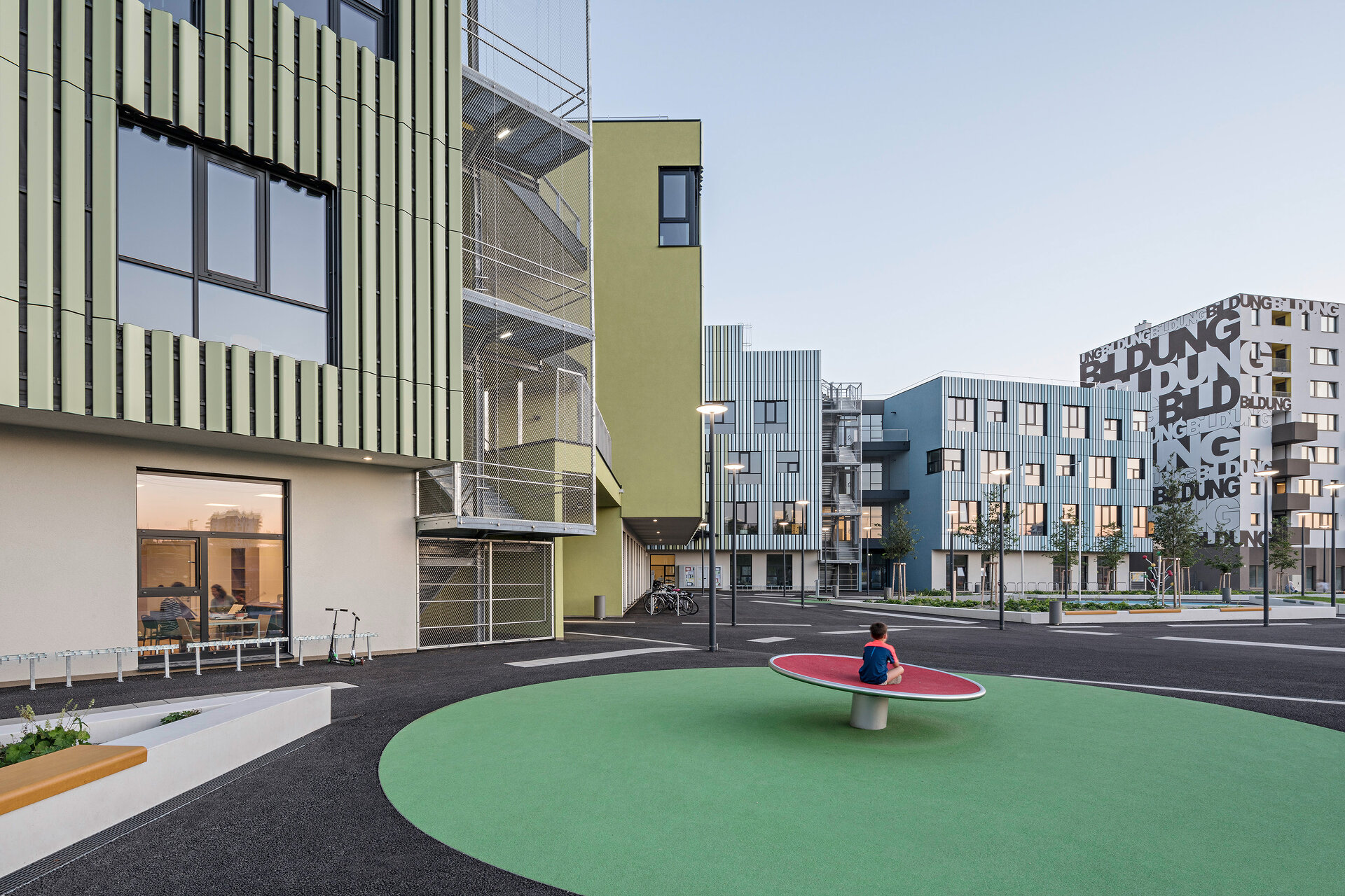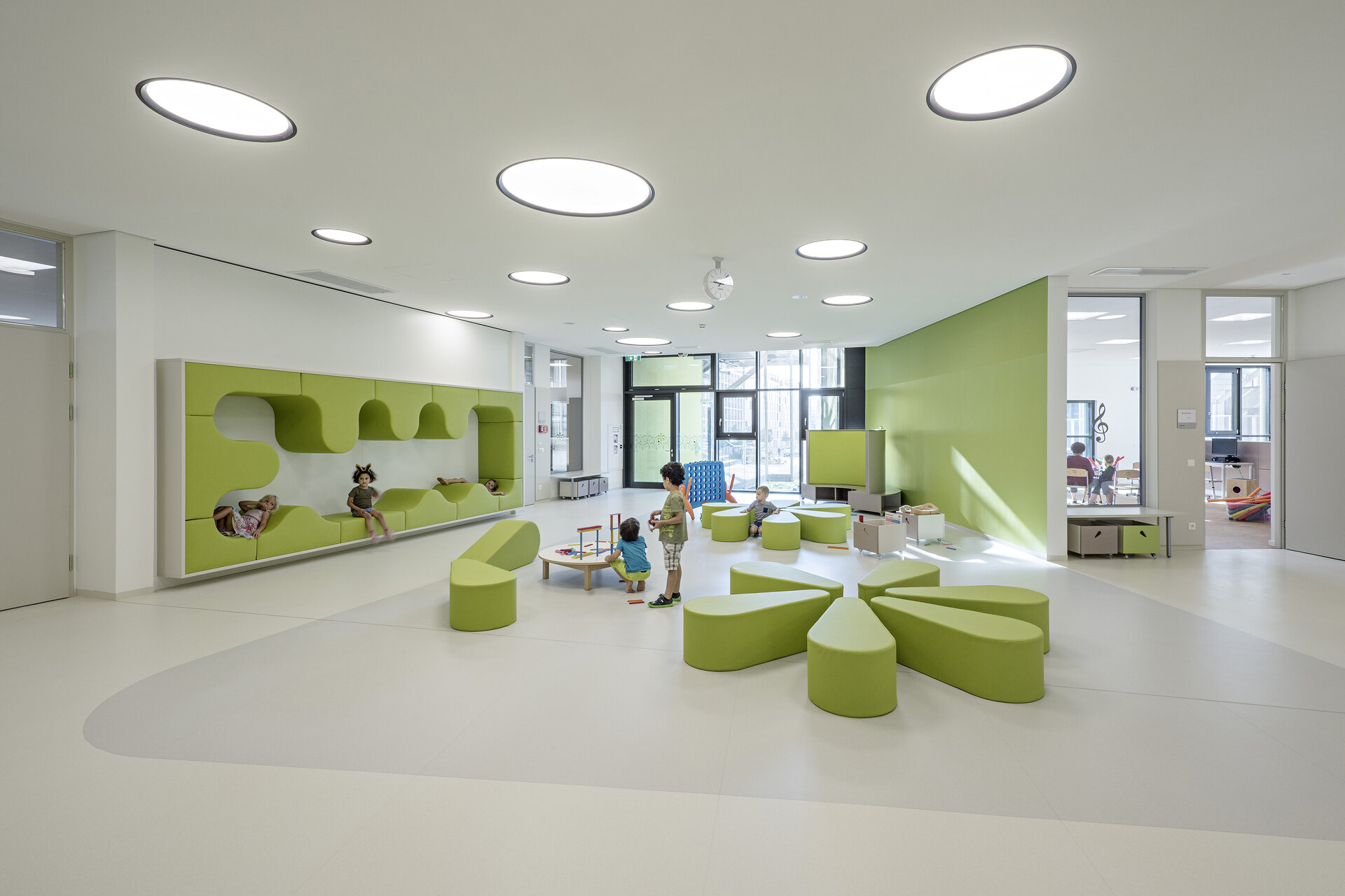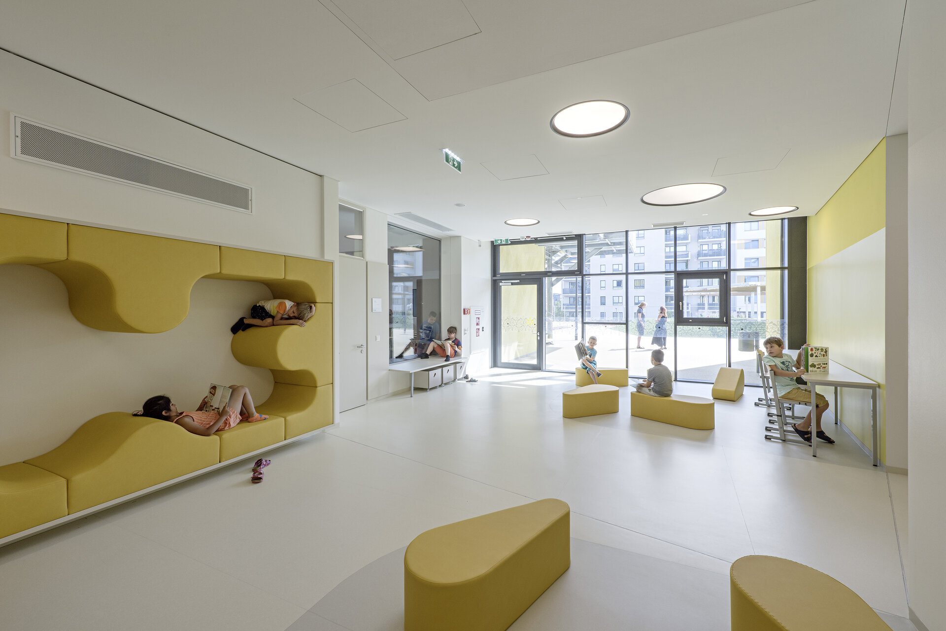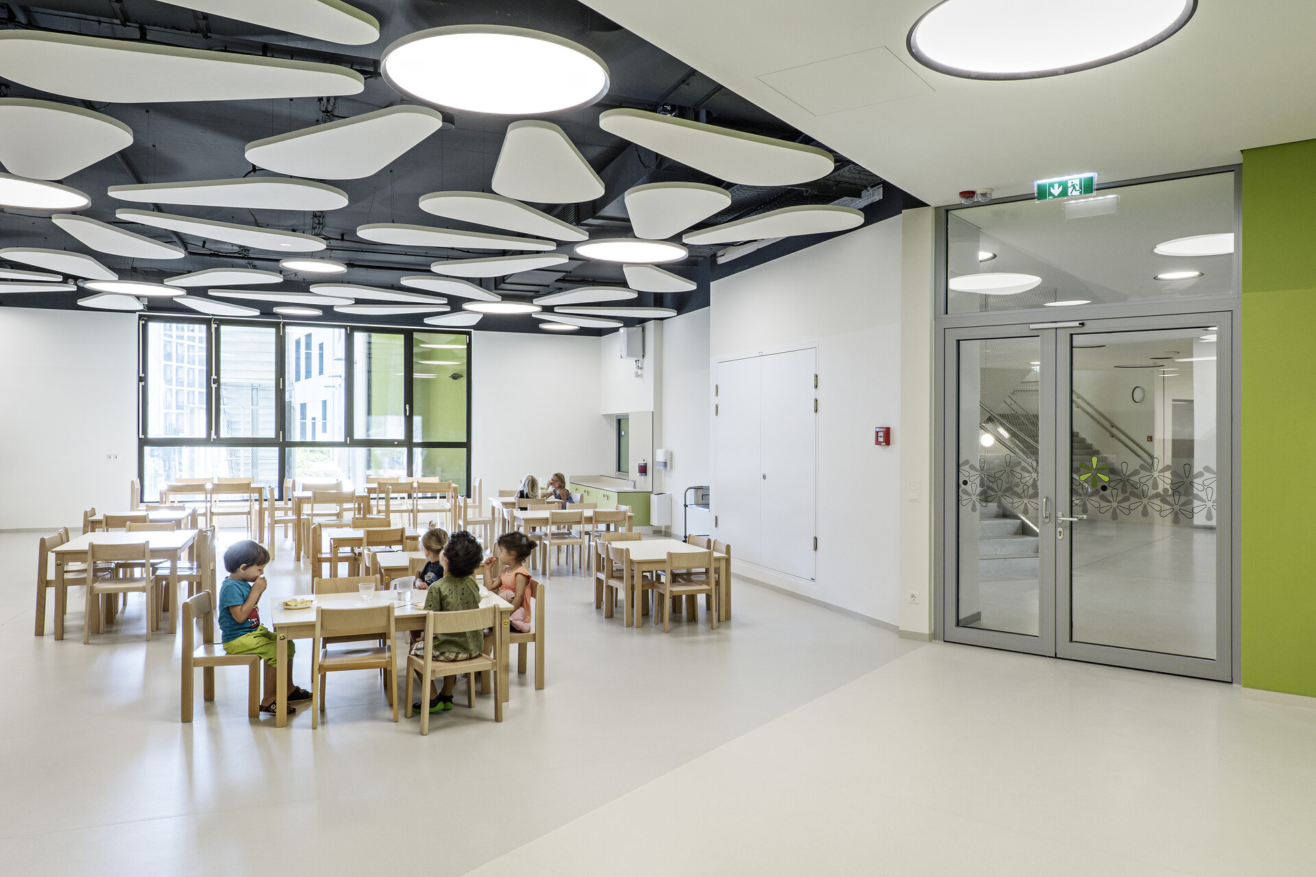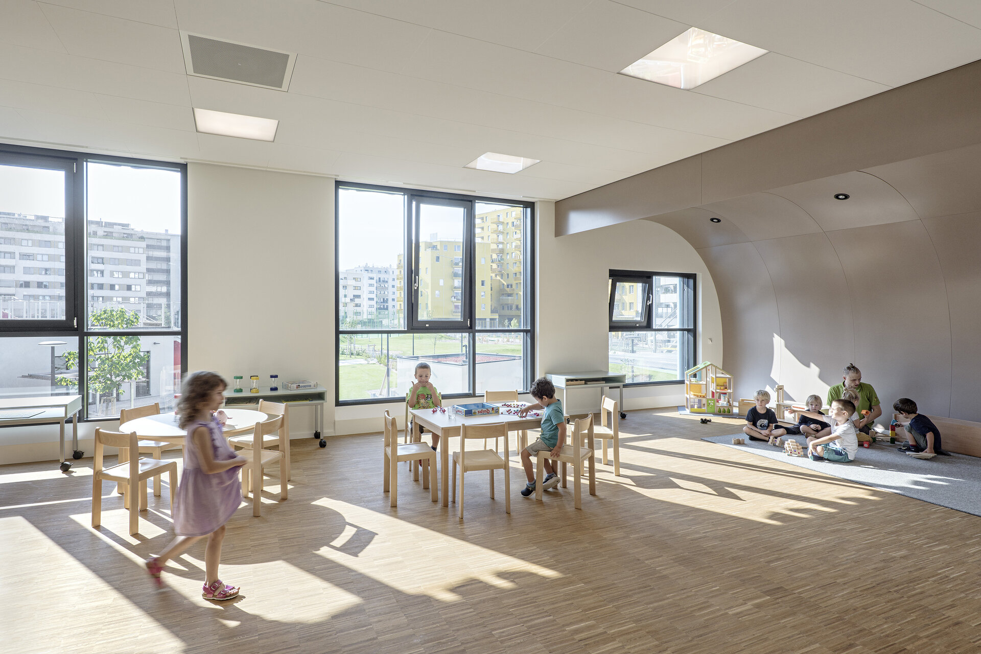 Die Bildungsbereiche (BIBER) bieten räumliche Vielfalt, helle Multifunktionsflächen und jeweils zugeordnete großzügige Freiräume, mit einer gemeinsamen Mitte und introvertierten Nischen. Großzügigen Verglasungen sorgen für viel Licht und Außenbezug. Für die Multifunktionsflächen wurden farblich und funktionell aufeinander abgestimmte Möbel entwickelt, von organisch geformten Sitznischen, über Paravents und Podeste bis hin zu blütenförmigen Hockern. Je nach Bedarf lassen sich damit verschiedene Raumszenarien arrangieren. In den Obergeschoßen sind großzügige Freibereiche mit beschatteten Freiluftklassen, Hochbeeten und Gehölzpflanzungen zugeordnet und durch Außentreppen, Sitz- und Lernstufen vertikal miteinander verwoben. Im Erdgeschoß gliedern sich die Gärten des Therapiekindergartens, der Kleinstkindergruppe und die Pausenflächen direkt an, für sportliche Aktivitäten wie Ballspiele gibt es weitere Freiflächen. Ansonsten ist die Freiraumgestaltung multifunktional und offenen zur Nachbarschaft.