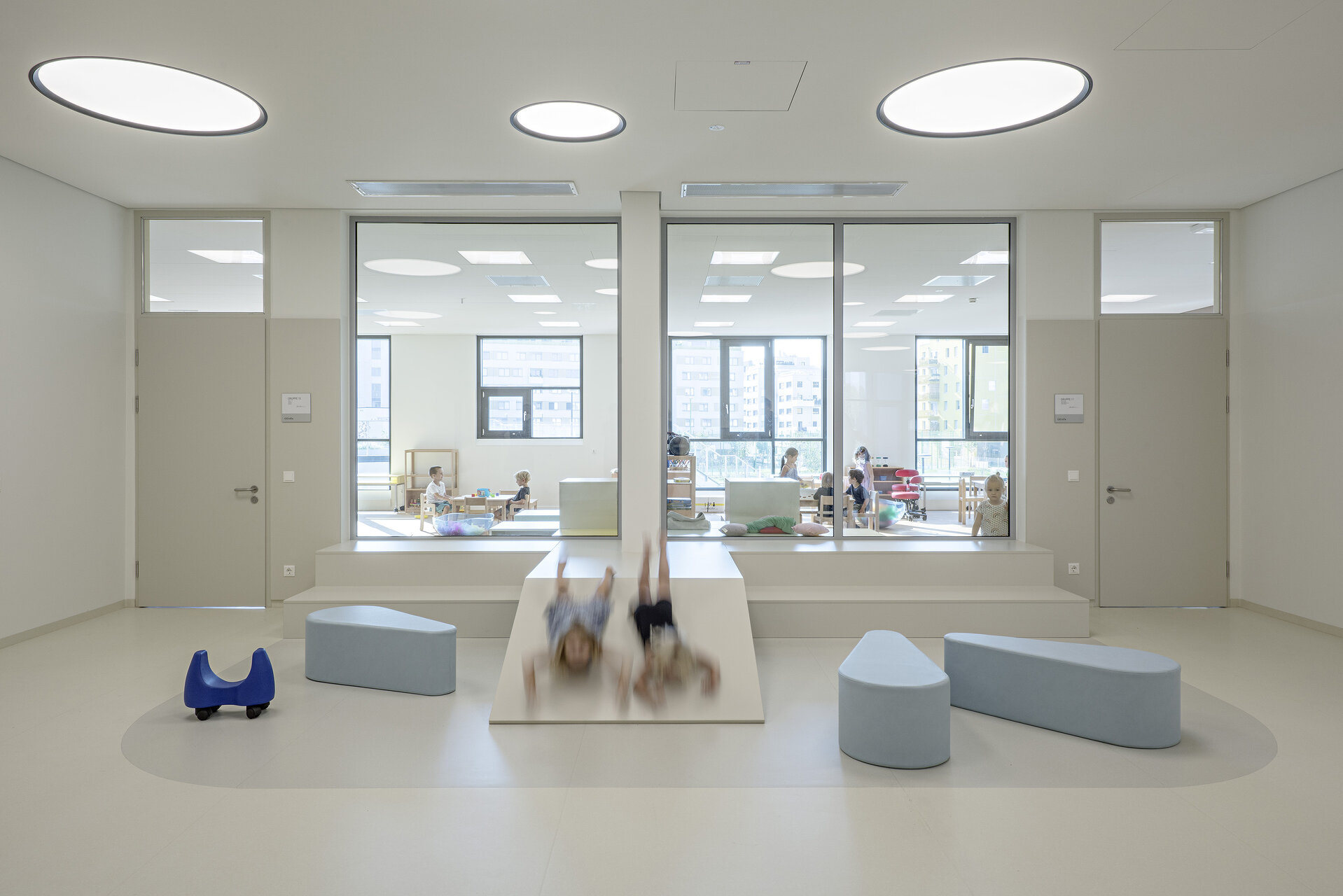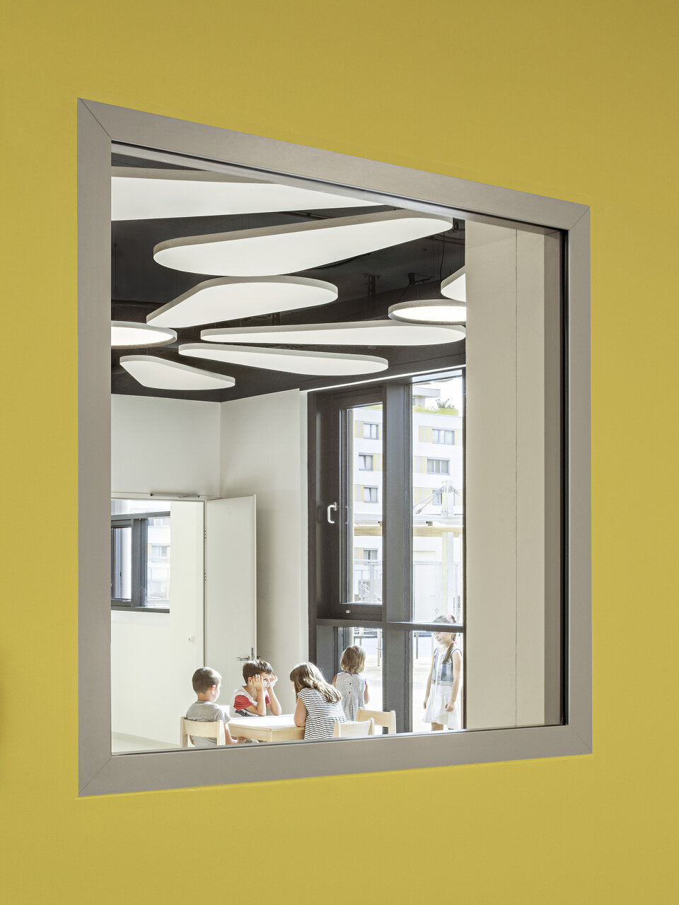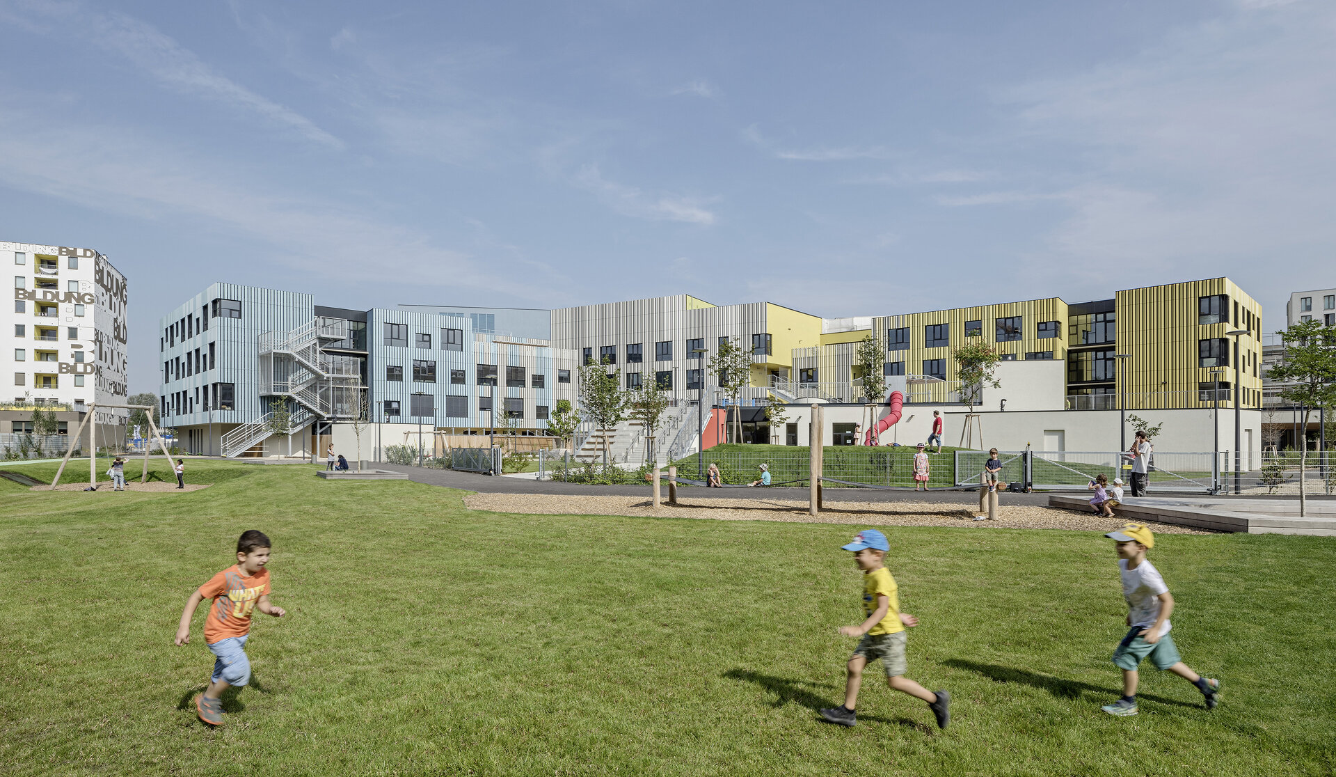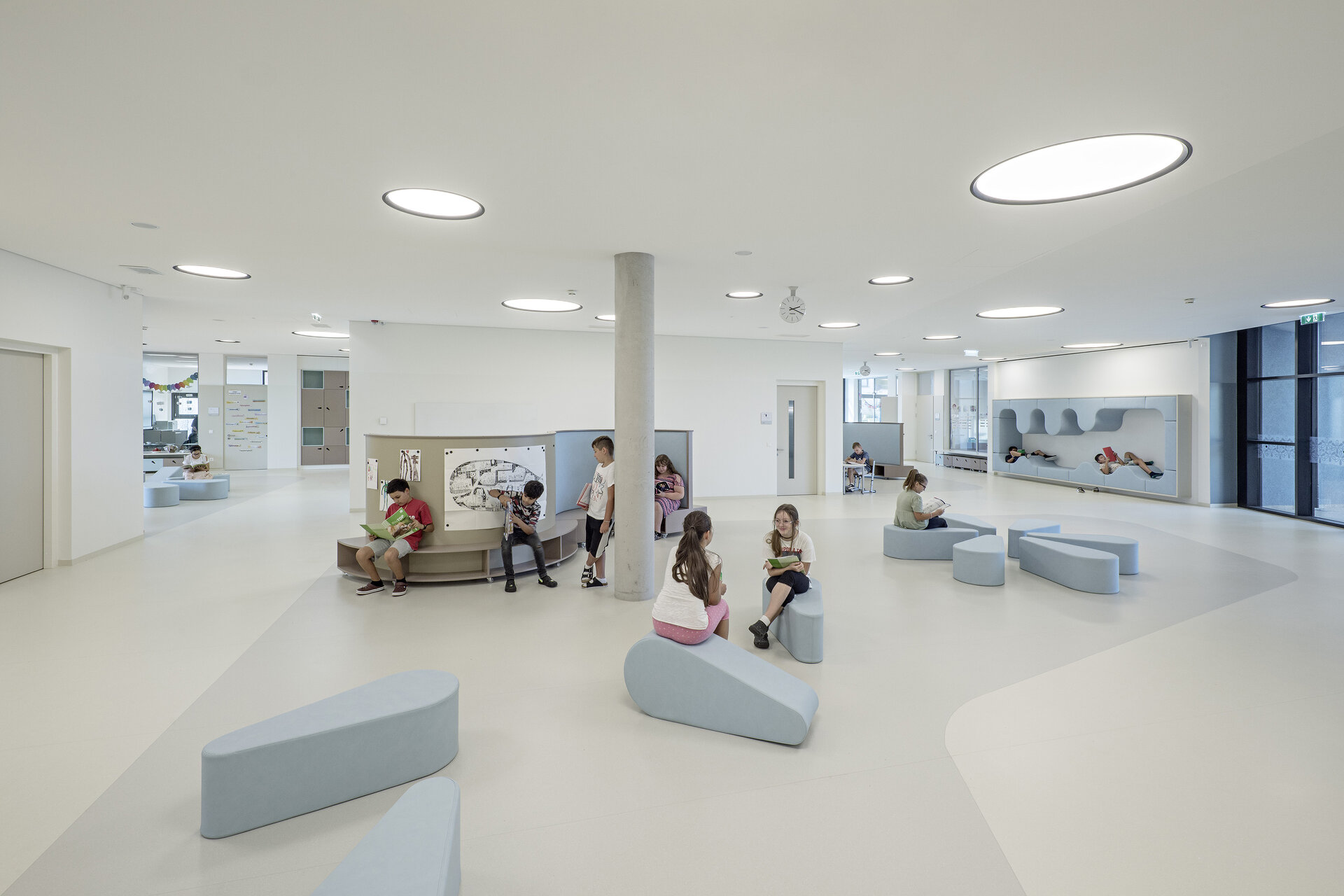 Die Bildungsbereiche (BIBER) bieten räumliche Vielfalt, helle Multifunktionsflächen und jeweils zugeordnete großzügige Freiräume, mit einer gemeinsamen Mitte und introvertierten Nischen. Großzügigen Verglasungen sorgen für viel Licht und Außenbezug. Für die Multifunktionsflächen wurden farblich und funktionell aufeinander abgestimmte Möbel entwickelt, von organisch geformten Sitznischen, über Paravents und Podeste bis hin zu blütenförmigen Hockern. Je nach Bedarf lassen sich damit verschiedene Raumszenarien arrangieren. In den Obergeschoßen sind großzügige Freibereiche mit beschatteten Freiluftklassen, Hochbeeten und Gehölzpflanzungen zugeordnet und durch Außentreppen, Sitz- und Lernstufen vertikal miteinander verwoben. Im Erdgeschoß gliedern sich die Gärten des Therapiekindergartens, der Kleinstkindergruppe und die Pausenflächen direkt an, für sportliche Aktivitäten wie Ballspiele gibt es weitere Freiflächen. Ansonsten ist die Freiraumgestaltung multifunktional und offenen zur Nachbarschaft.