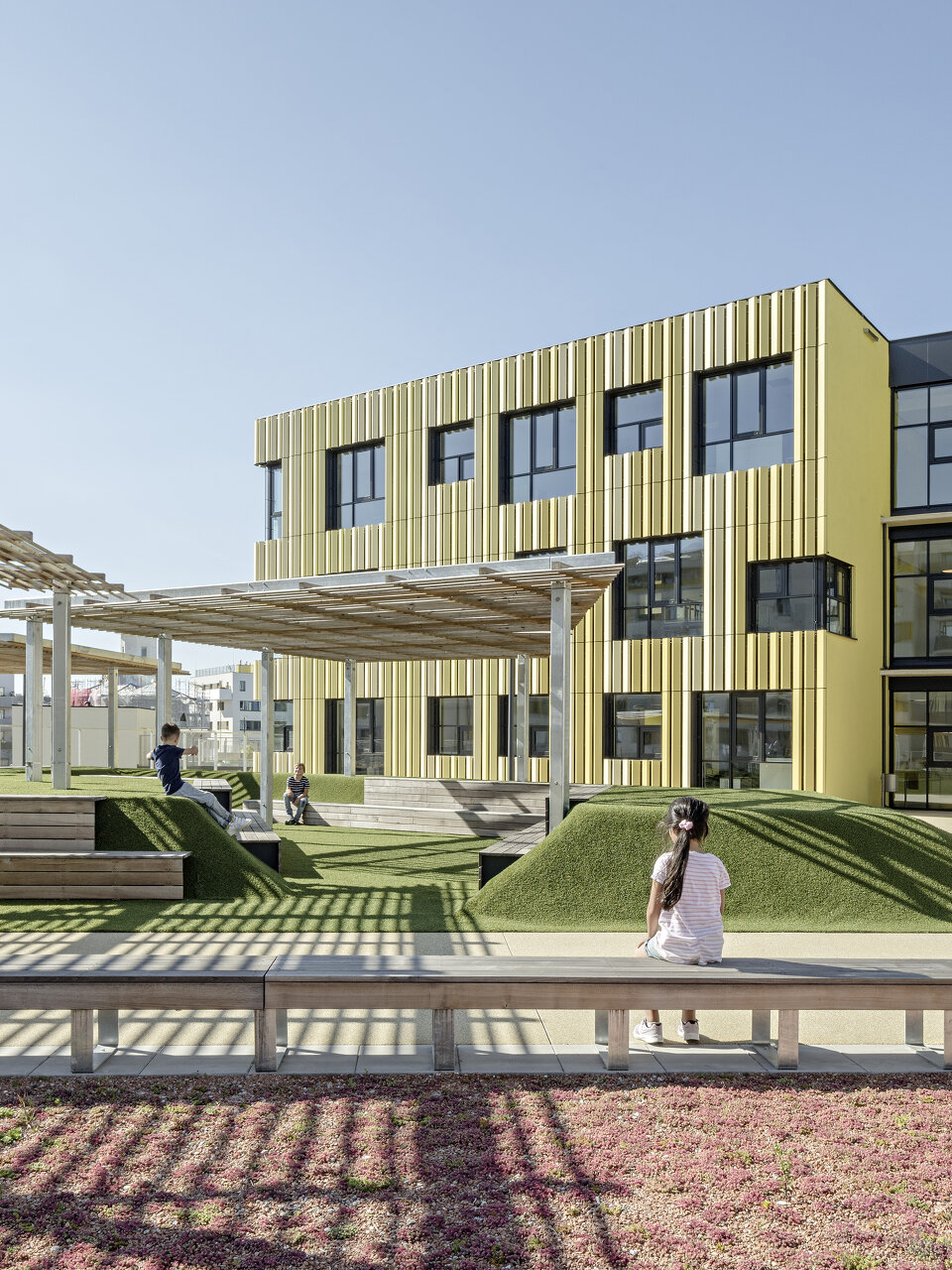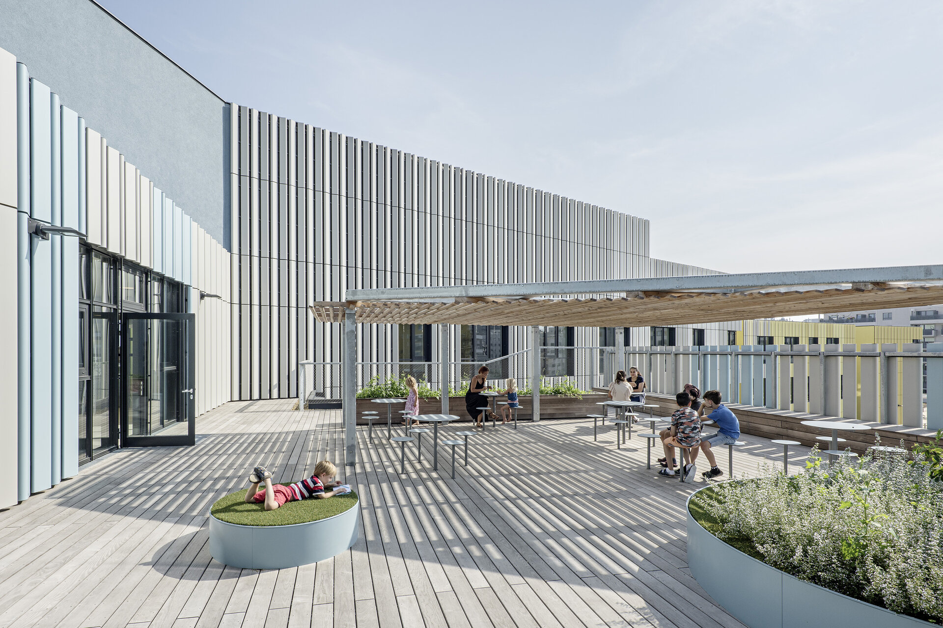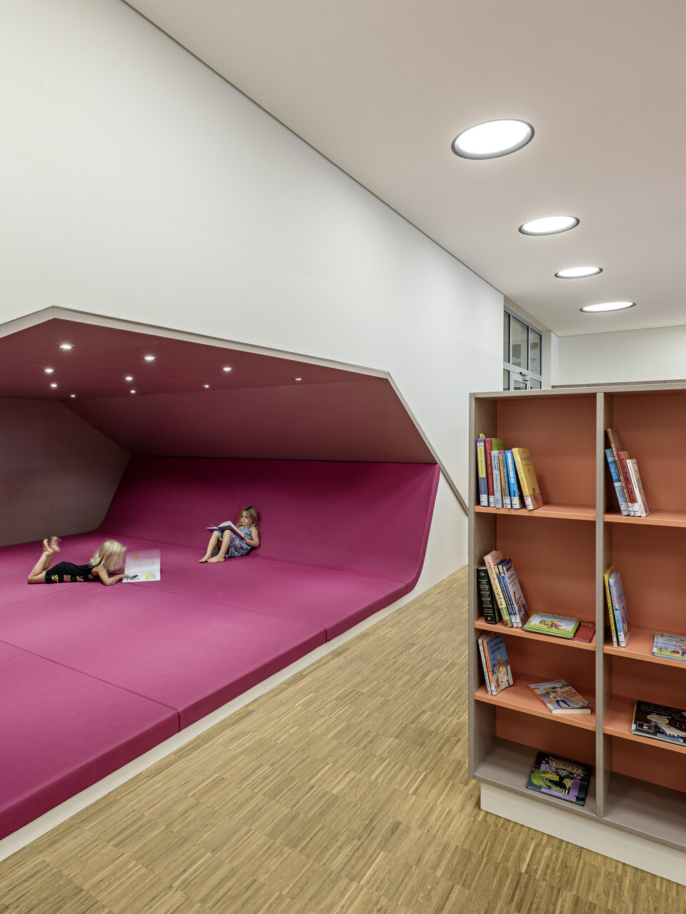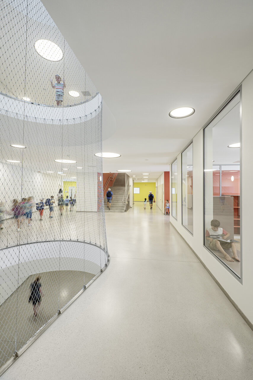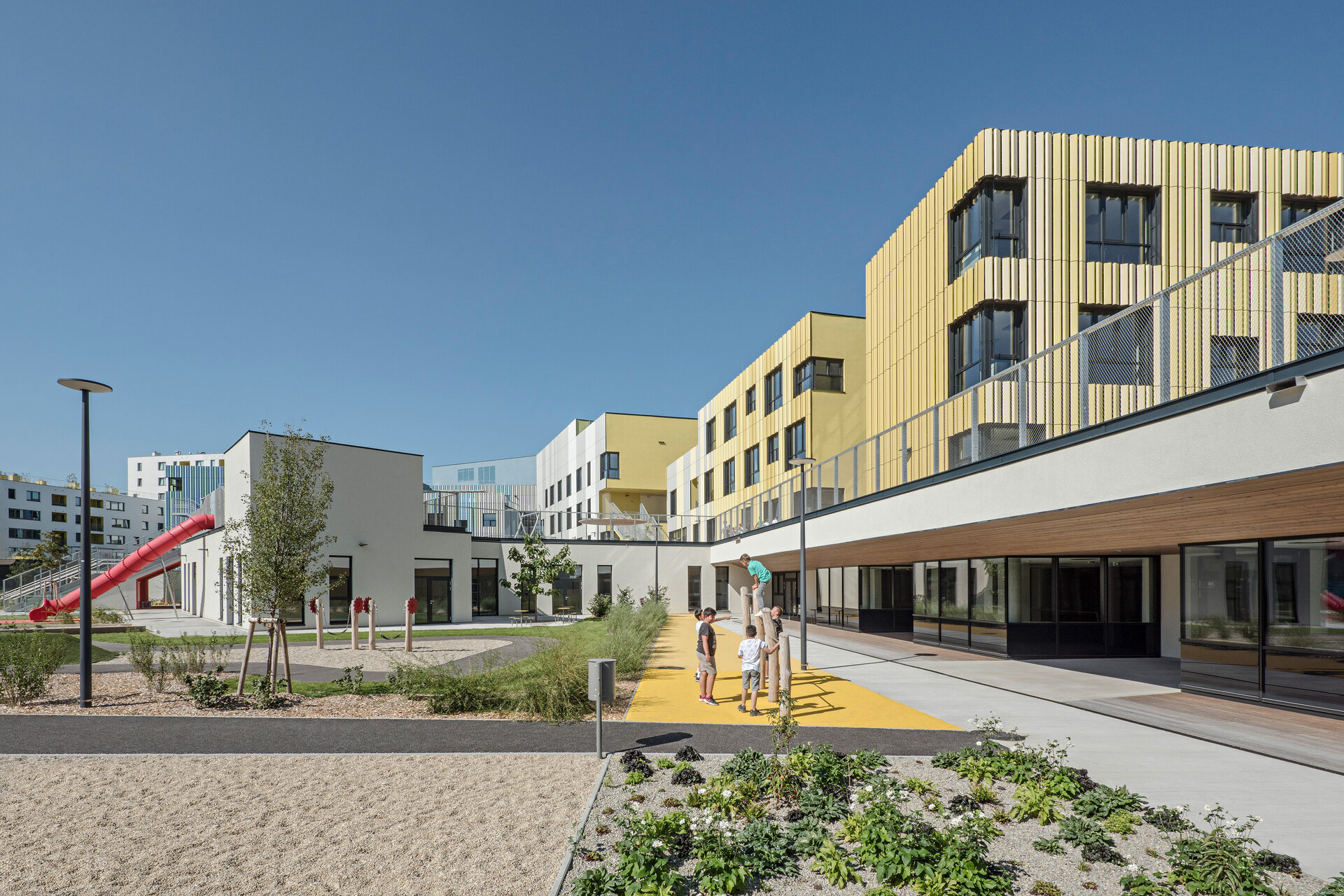 Die Bildungsbereiche (BIBER) bieten räumliche Vielfalt, helle Multifunktionsflächen und jeweils zugeordnete großzügige Freiräume, mit einer gemeinsamen Mitte und introvertierten Nischen. Großzügigen Verglasungen sorgen für viel Licht und Außenbezug. Für die Multifunktionsflächen wurden farblich und funktionell aufeinander abgestimmte Möbel entwickelt, von organisch geformten Sitznischen, über Paravents und Podeste bis hin zu blütenförmigen Hockern. Je nach Bedarf lassen sich damit verschiedene Raumszenarien arrangieren. In den Obergeschoßen sind großzügige Freibereiche mit beschatteten Freiluftklassen, Hochbeeten und Gehölzpflanzungen zugeordnet und durch Außentreppen, Sitz- und Lernstufen vertikal miteinander verwoben. Im Erdgeschoß gliedern sich die Gärten des Therapiekindergartens, der Kleinstkindergruppe und die Pausenflächen direkt an, für sportliche Aktivitäten wie Ballspiele gibt es weitere Freiflächen. Ansonsten ist die Freiraumgestaltung multifunktional und offenen zur Nachbarschaft.