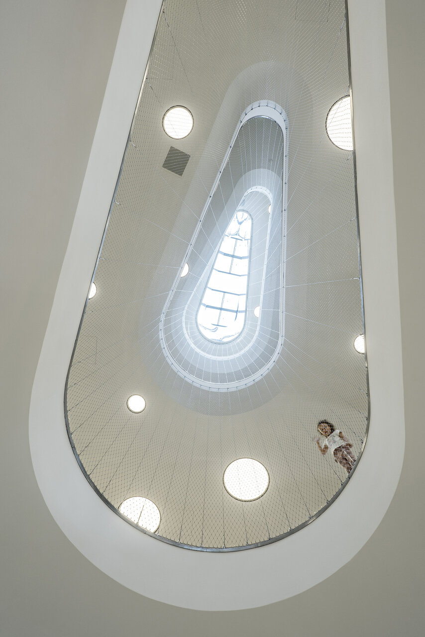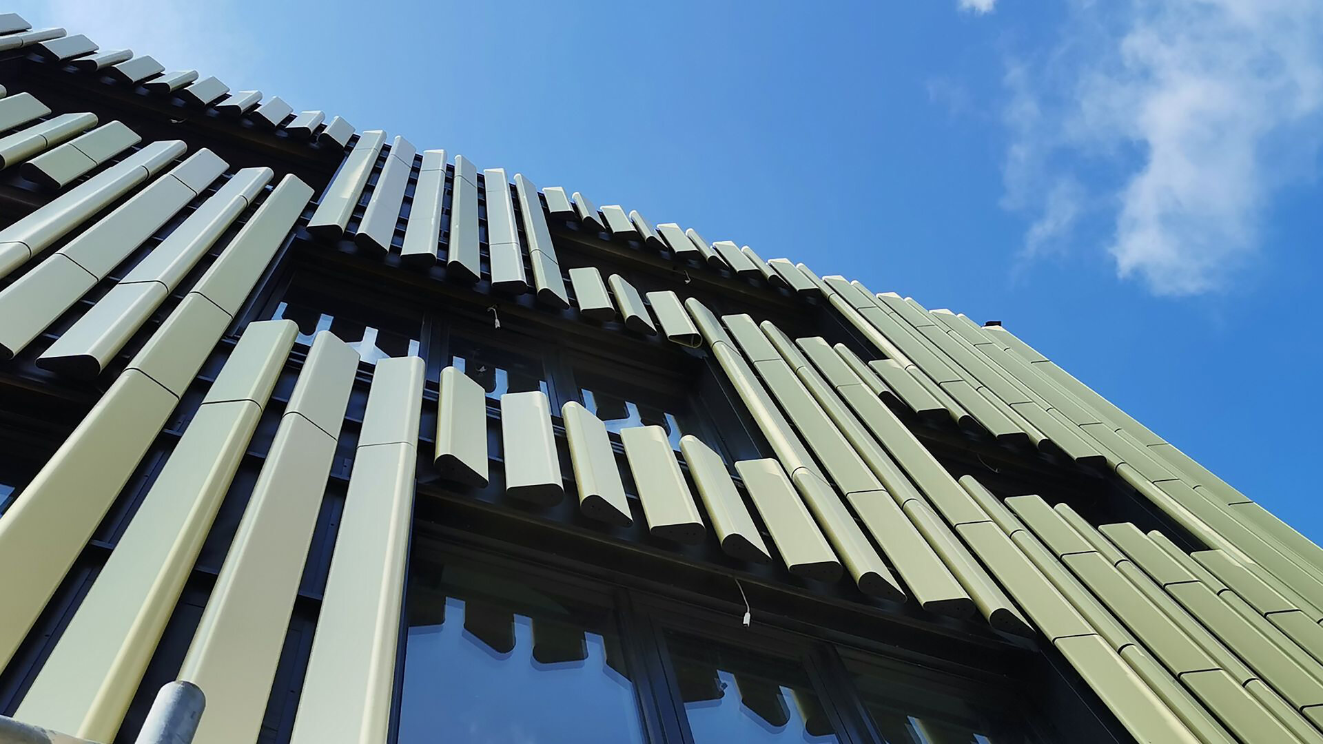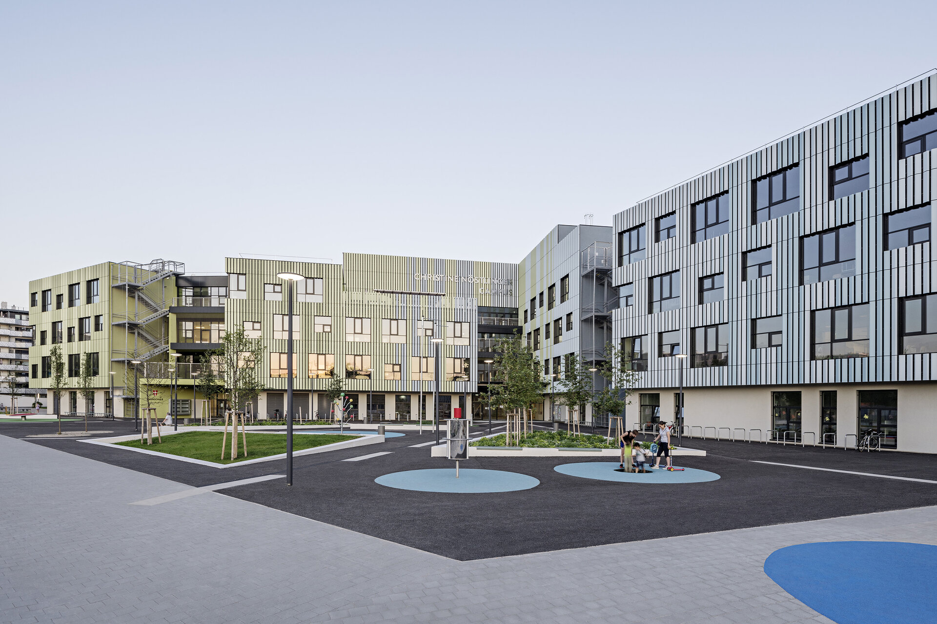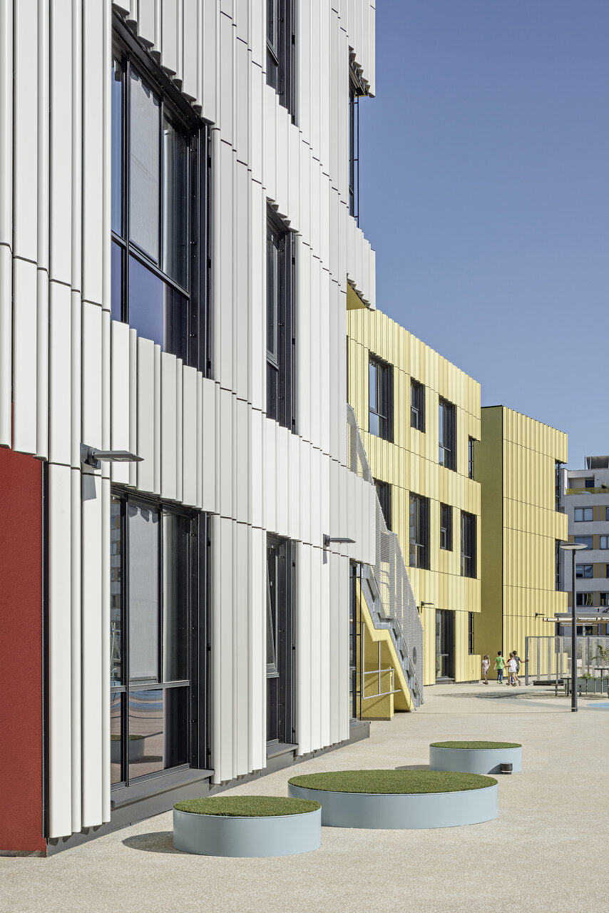 Der einladend wirkende Bildungscampus bekommt Leichtigkeit durch die „tanzenden“ Fenster und die Farbvariation der drei Baukörperteile. Die Übergänge verwischen und spiegeln den Übergang der Jahreszeiten wieder. Die Stäbe in Blattform werden spiegelsymmetrisch montiert, so wird eine textile, wellenförmige Wirkung erzeugt. Dieser Effekt ändert sich je nach Blickwinkel. (Text: Architekt:innen, bearbeitet)
