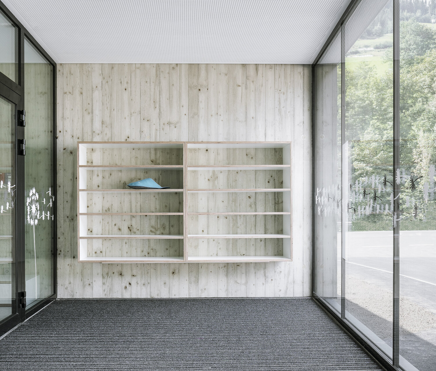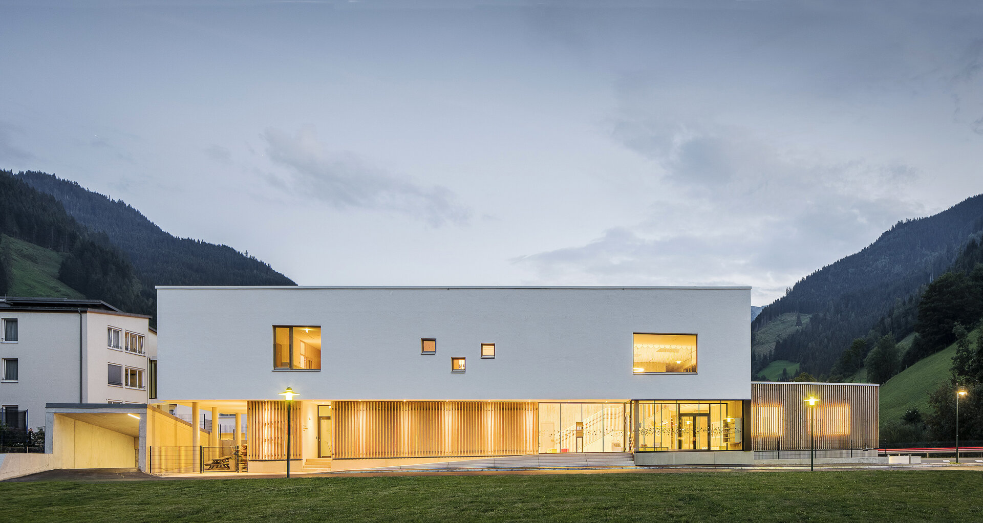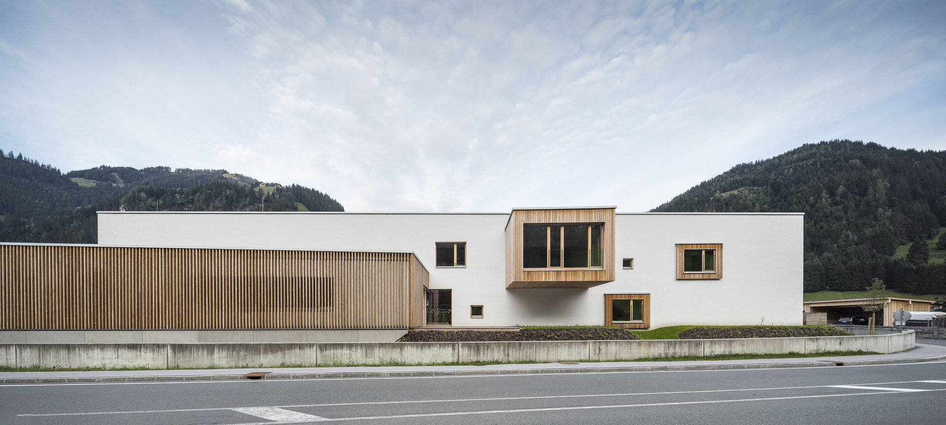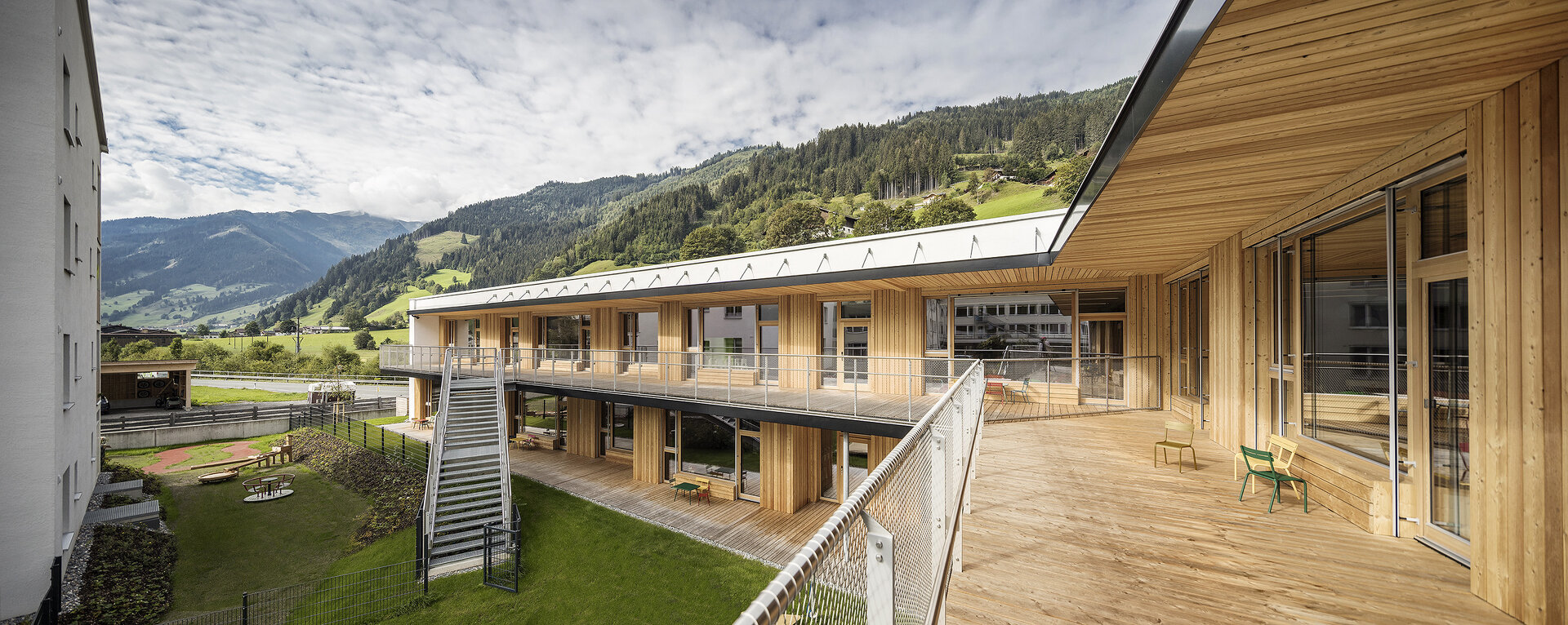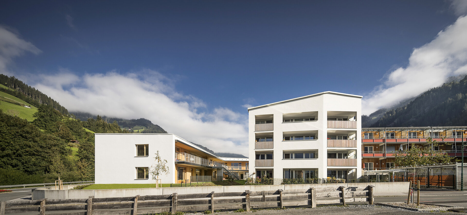 Mit einem L-förmiger Baukörper, er beherbergt den Kindergarten, schließt er den Bauplatz zur Großarler Landesstraße hin ab. Der viergeschoßige punktförmige Baukörper, der über eine Brückenkonstruktion an das bestehende Altenheim angebunden ist, beinhaltet in der Gemeinde dringend benötigte Mietwohnungen. Der durch die Lage der Gebäude am Bauplatz geschaffene Hofbereich dient als Begegnungszone für die Kinder, die Bewohner:innen des Neubaus und den Senior:innen im Bestandsbau.
