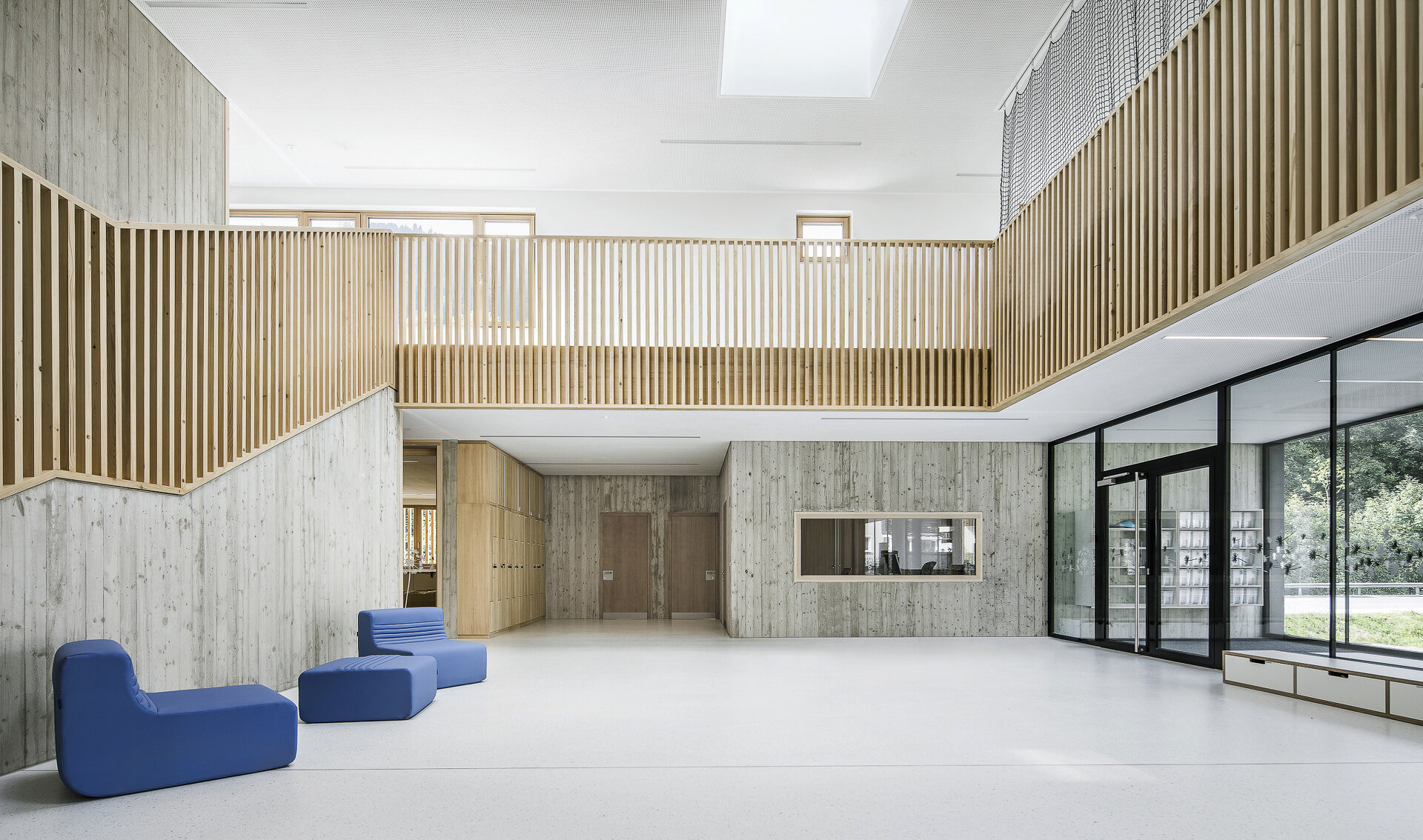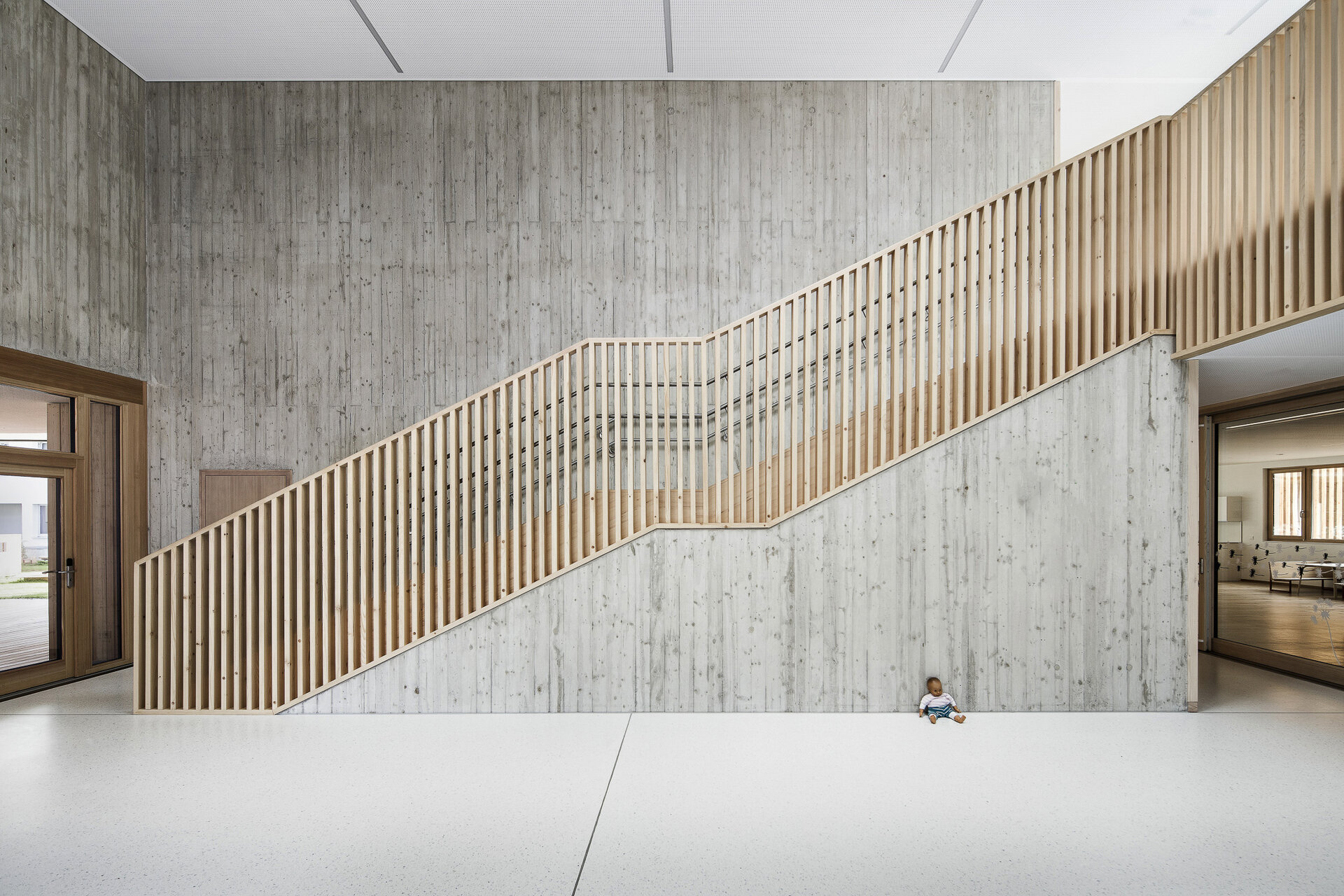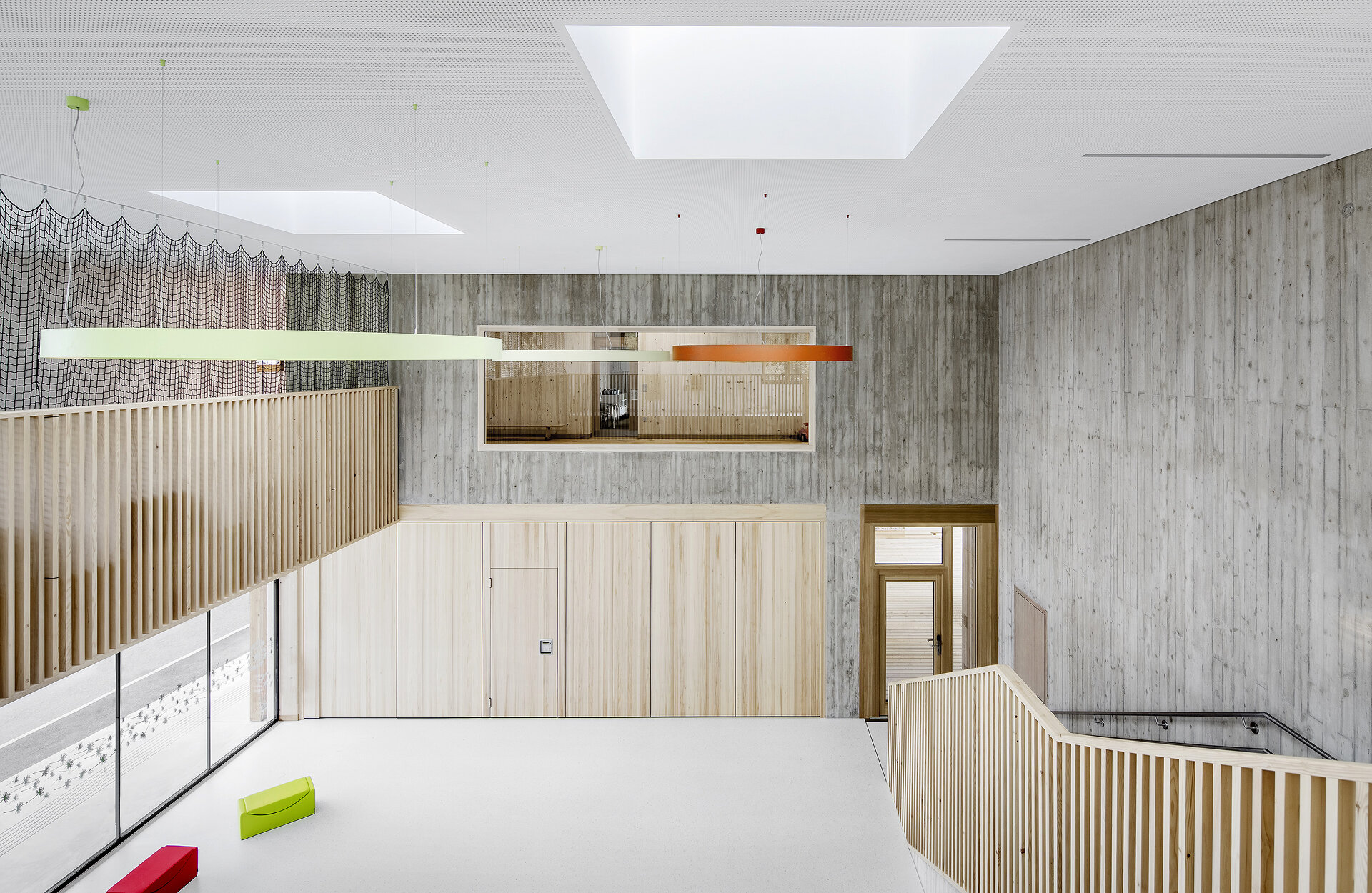 Der zweigeschoßige Kindergarten wird über einen überdachten Vorplatz von der Nordseite her erschlossen. Dieser Vorplatz dient als „Kiss-and-Ride-Parkplatz“ sowie als Fahrradabstellplatz. Die Gruppen- und Bewegungsräume des Kindergartens werden über ein großes und helles Foyer im Erdgeschoss erschlossen. Die unverfälschte Wirkung der verwendeten Materialien, in den Aufenthaltsbereichen naturbelassenes Holz, in den öffentlichen Zonen, wie dem Treppenhaus Sichtbeton, unterstreichen den Charakter und die Nutzung der jeweiligen Funktionsbereiche. Die insgesamt zehn Gruppenräume und fünf Bewegungs- bzw. Ruheräume sind zum ruhigen, in Richtung Osten liegenden Hofbereich orientiert. Eine umlaufende tiefe Terrasse bietet hier eine großen überdachten und geschützten Spielbereich. Zwei Treppen führen von der Terrasse in den Innenhof, die Ergänzung einer Rutsche wäre möglich. Alle Nebenräume, wie die Verwaltungs- und Aufenthaltsräume für das Personal oder die Toiletten wurden als eine Art Puffer an der West- und Nordseite um die zum Innenhof angeordneten Gruppenräume herumgelegt. Im Keller bekam der lokale Schützenverein eine Trainingsstätte. Zudem gelangt man über einen unterirdischen Verbindungstrakt in den benachbarten Neubau.
