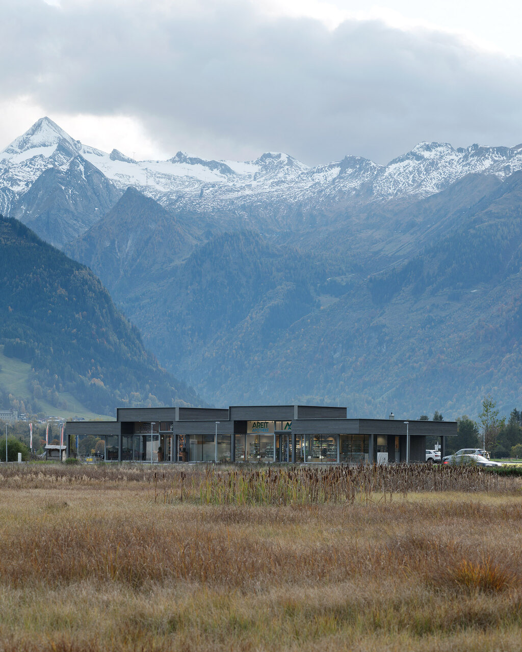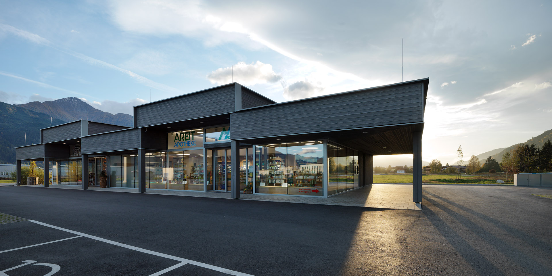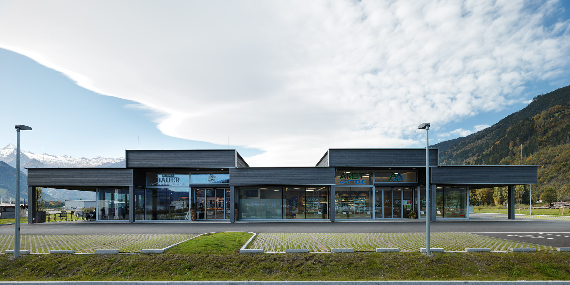 Noch steht diese Entwicklung am Anfang und es war daher nicht unwesentlich, dass das erste Objekt, das hier entsteht, den Standort im Sinne dieser Planungsziele definiert. Das Gebäude für eine Apotheke mit Bäckerei befindet sich an der Kreuzung Gletschermoosstraße und Prof.- Ferry-Porsche-Straße und interpretiert die Vorgaben optimal. Gelungen ist das nicht zuletzt mit der Wahl des Materials Holz, der Gestaltung der Freiflächen, der zurückhaltenden Farbgebung und einem zurückhaltenden und dennoch prägnanten Baukörper. Der Boden ist hier wenig tragfähig, sodass mit zahlreichen Bohrpfählen ein sicheres Fundament geschaffen werden musste. Um nicht durch eine massive Konstruktion den Untergrund zu belasten, war die Wahl eines leichten Tragwerks aus Holz die logische Folge. Das Gebäude wurde als Holzriegelbau errichtet, die Massivholzdecken lagern auf einer Leimbinderunterkonstruktion aus Brettschichtholz. Die Außenhaut besteht aus sägerauen Lärchenbrettern, die vor Montage mit einer silberfarbenen Lasur imprägniert wurde. Die zum Vorplatz gerichtete horizontal betonte Fassade ist durch zwei auffällige Höhensprünge gekennzeichnet, die dem seriellen, modulartigen Aufbau einen einprägsamen Rhythmus verleihen. Sie bilden eine Höhendifferenz, der im Inneren eine Art basilikales Raumsystem entspricht. In der überhöhten Mittelzone befinden sich der Verkaufsraum der Apotheke bzw. die Theke des Cafés, in den niedrigen Seitenzonen die erforderlichen Nebenräume und Kundenbereiche. Im südlichen Trakt des Gebäudes nutzt die Bäckerei die überdachte Terrasse, welche den Blick auf die Hohen Tauern öffnet und ganztags besonnt ist. Sein räumliches Pendant im nördlichen Teil des Gebäudes dient der Apotheke als „Drive-through“-Schalter. Diese vermeintliche Reminiszenz an die Ära des Automobilismus erlaubt eine kontaktlose Übergabe von Arzneien, was Stichwort Pandemie, von großem Vorteil ist.