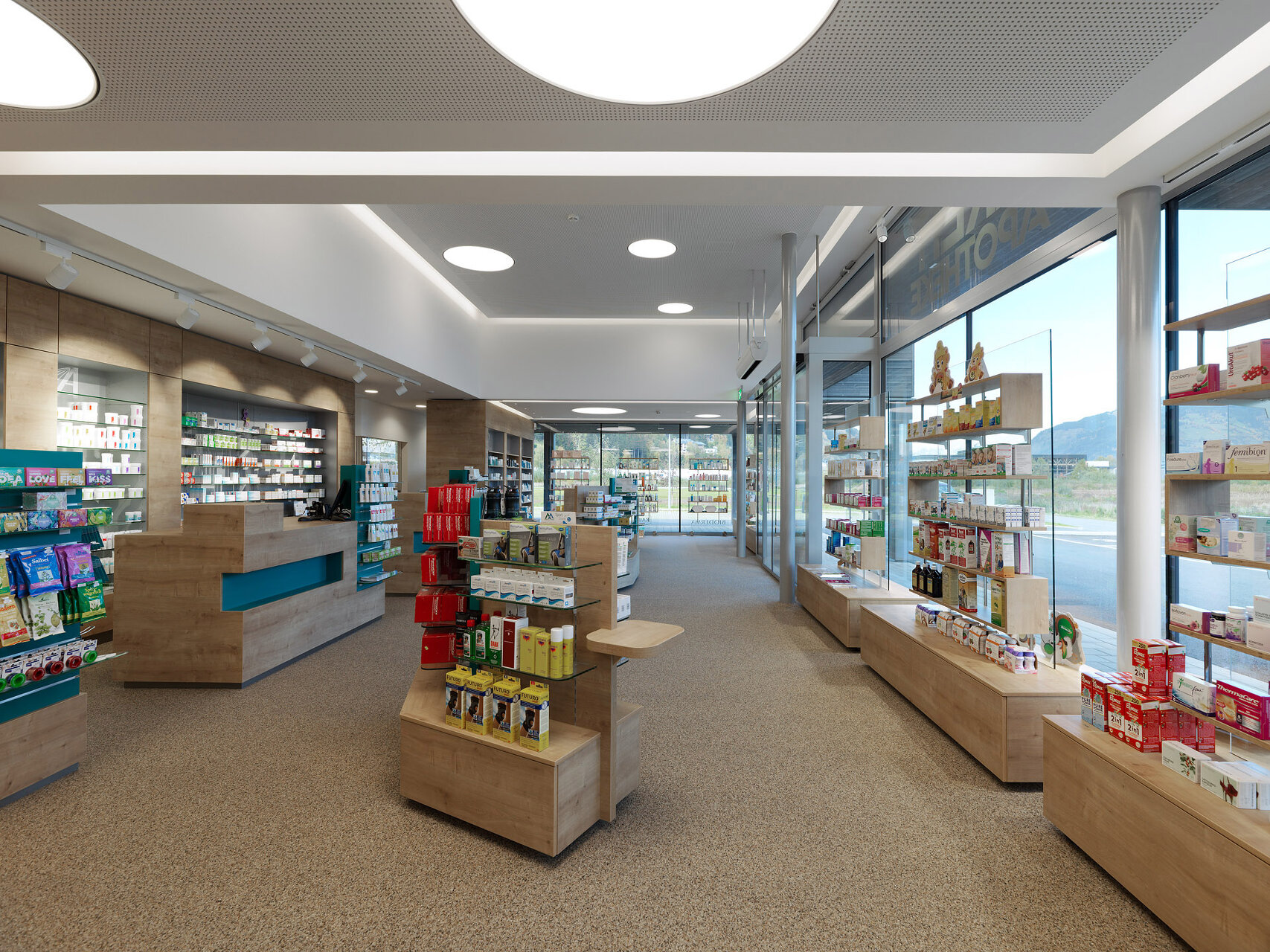 Das modulare Gebäude lebt von der Varianz der Elemente, also dem Spiel aus Höhen- und Tiefenstaffelung, von vor- und zurückspringenden Elementen und von Leerstellen in der Fassade. Dabei dominiert ein Pragmatismus, der einen Pfeiler dort setzt, wo er stehen soll, ihn aber verschiebt, wenn er im Weg steht. Die Geometrie des Bauwerks erlaubt, die auf einem einfachen Stützenraster mit rd. 4 Metern Achsmaß beruht, erlaubt dies. Dabei ist das Bauwerk nicht für die Ewigkeit gedacht, sondern statisch so ausgelegt, dass eine Aufstockung jederzeit möglich ist. Wie sich eine solche ausnehmen wird, hängt vom Erfolg des Konzepts ab. Angedacht ist ein Schulungs- und Fortbildungseinrichtung der Apotheke, die – aufgrund der Vielzahl von Gesundheitsprodukten –, aus eigener Produktion dafür bereits jetzt Bedarf hat. (Text: Roman Höllbacher)