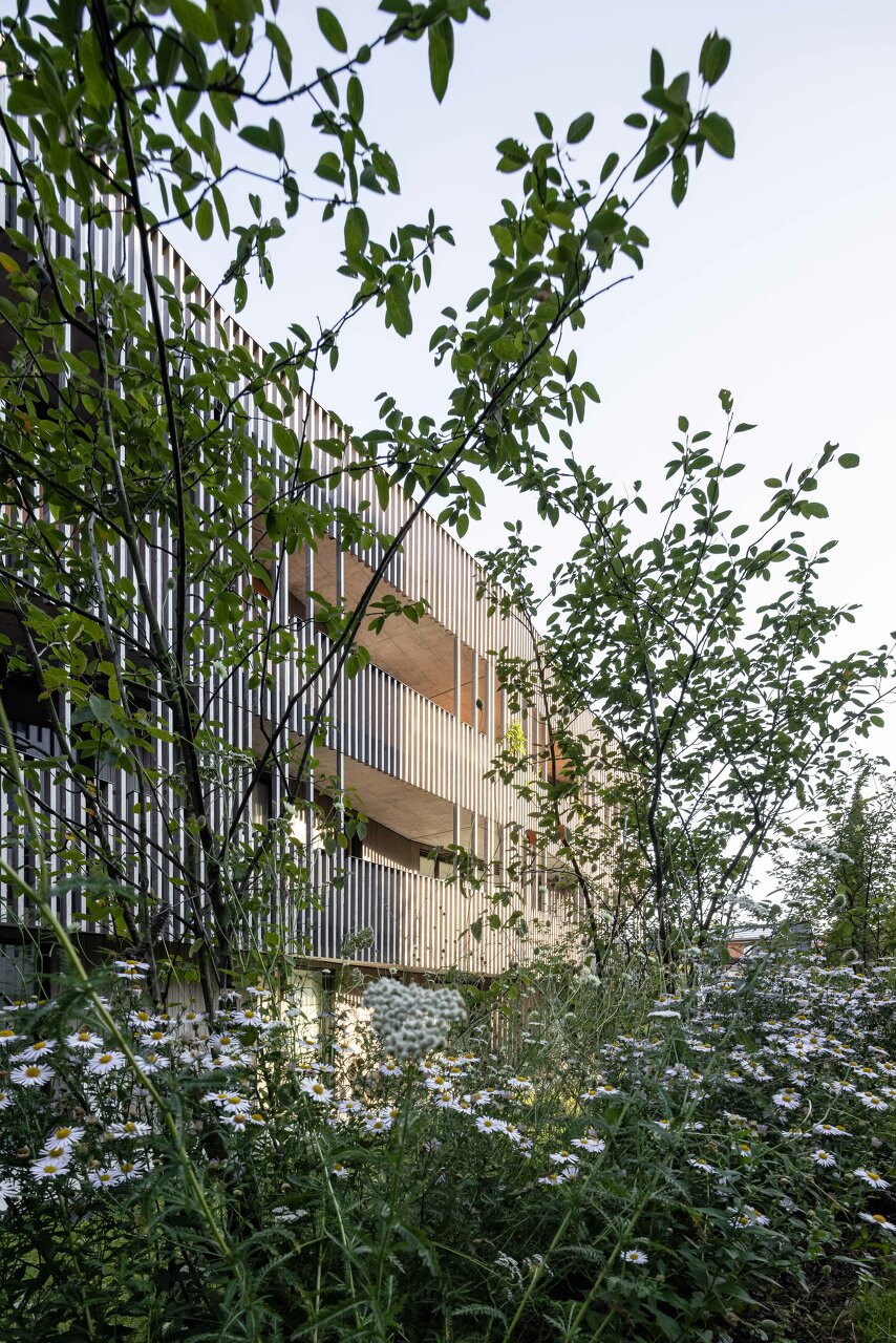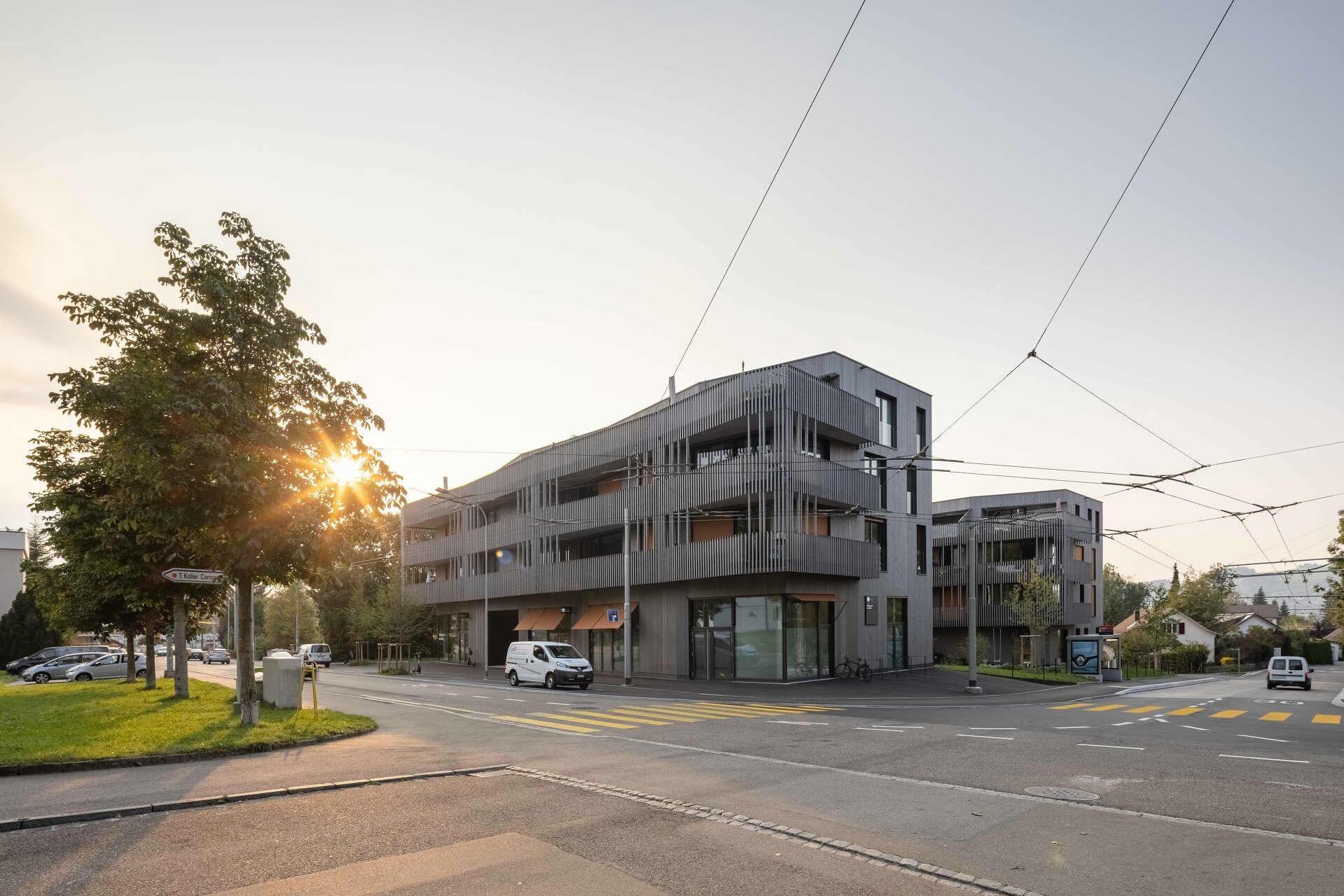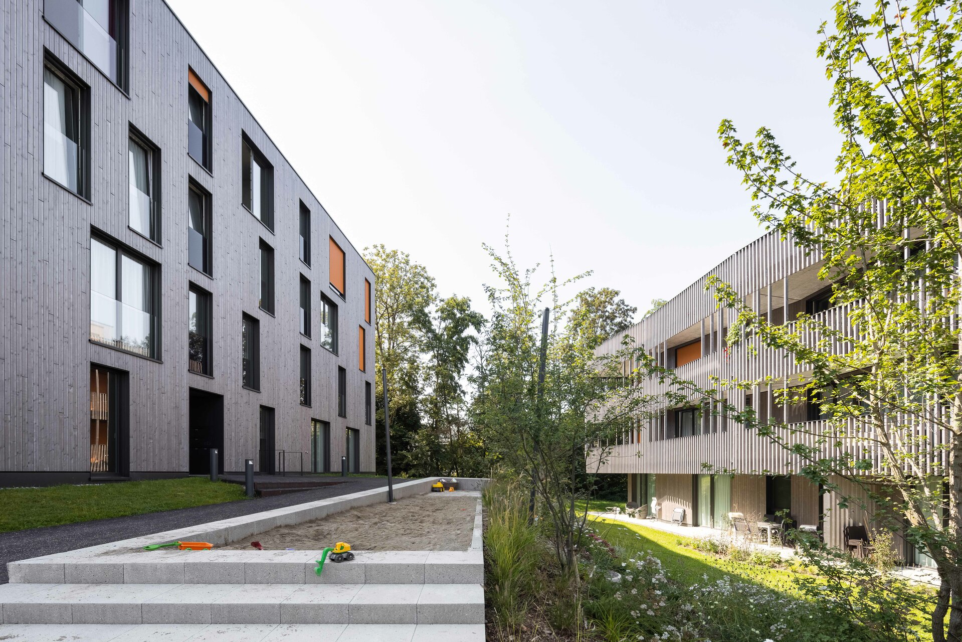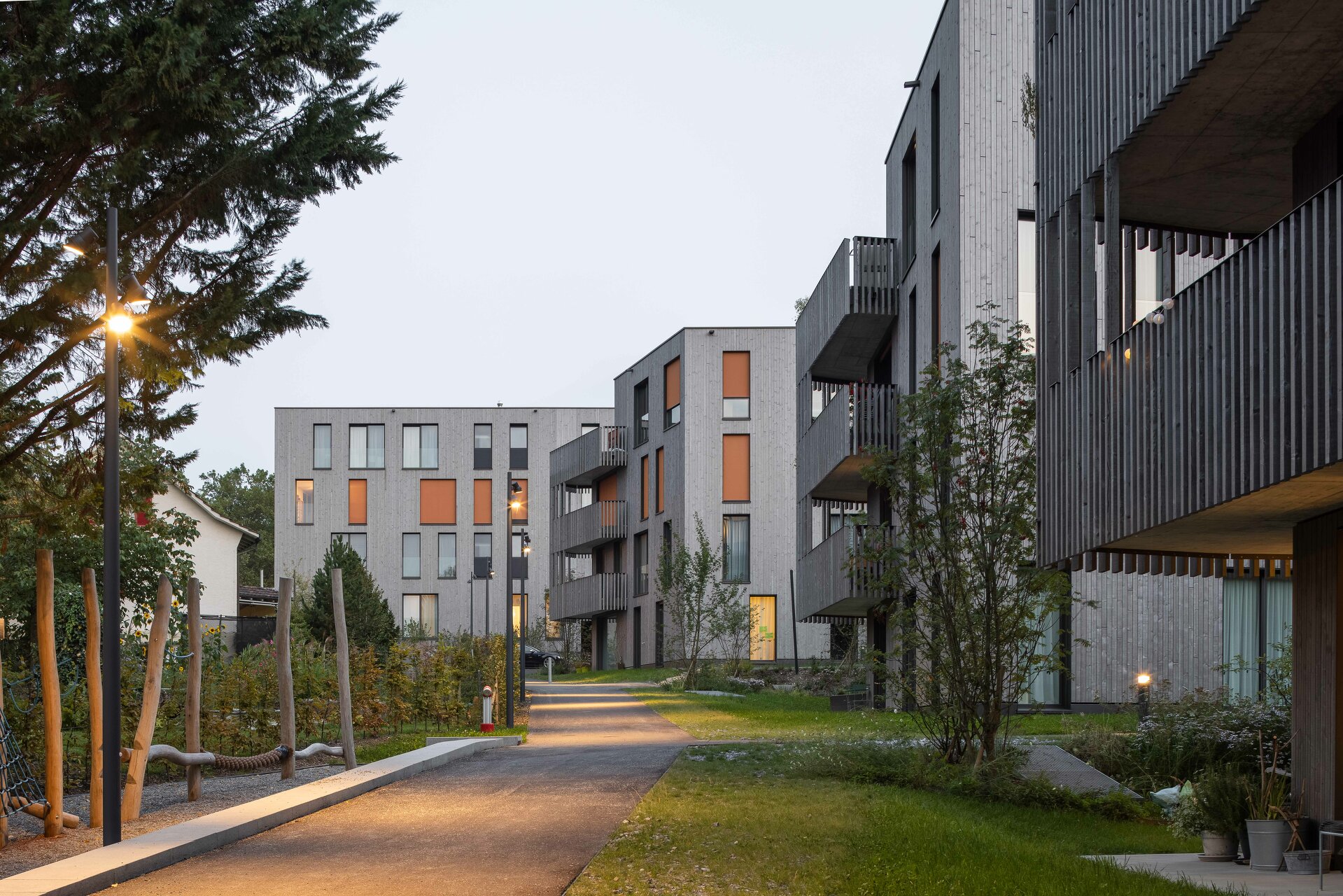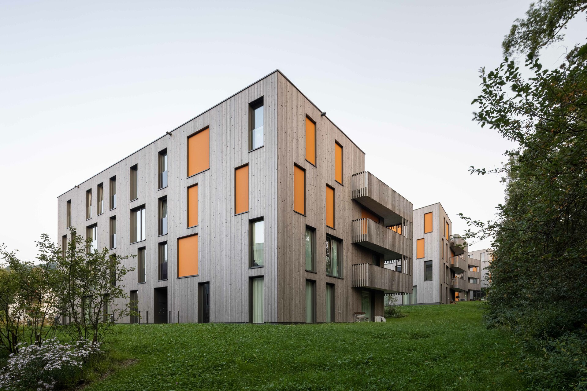 Fünf längliche Baukörper folgen dem leicht abfallenden Gelände und fügen sich in Kubatur und Materialität sensibel in die Umgebung. Den Auftakt und oberen städtebaulichen Abschluss bildet das Gebäude an der Wolfgangstraße. Im Erdgeschoß befindet sich ein Gewerbebereich mit flexibler Raumteilung für unterschiedliche Nutzungen. Es schafft ein selbstbewusstes Gegenüber zum feudal anmutenden „Schlössli“ aus dem Jahr 1642, das heute als Restaurant genutzt wird. Die weiteren vier Volumen sind ausschließlich der Wohnnutzung vorbehalten. Konzipiert sind die insgesamt 60 Einheiten mit vielfältigen Grundrissen: großzügige, offene Wohnbereiche mit angelagerten Balkon- oder Gartenflächen und klar abgegrenzten Schlafräumen. Die polygonale Form der Wohnhäuser, das versetzte Arrangement und die filigrane Holzfassade vermitteln eine Leichtigkeit, die den wohnlichen Charakter der Überbauung verstärkt. (Text: Architekt:innen, bearbeitet)