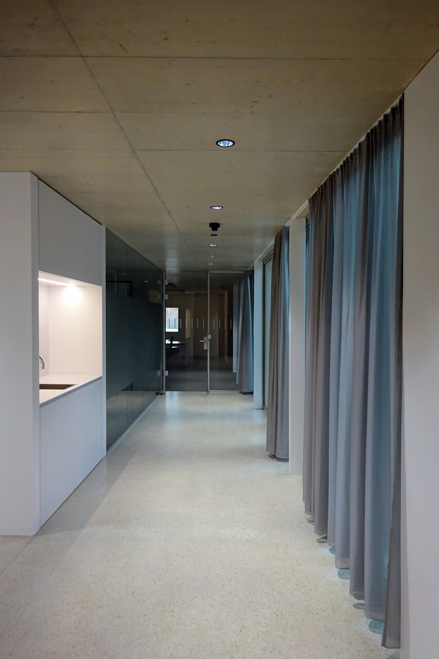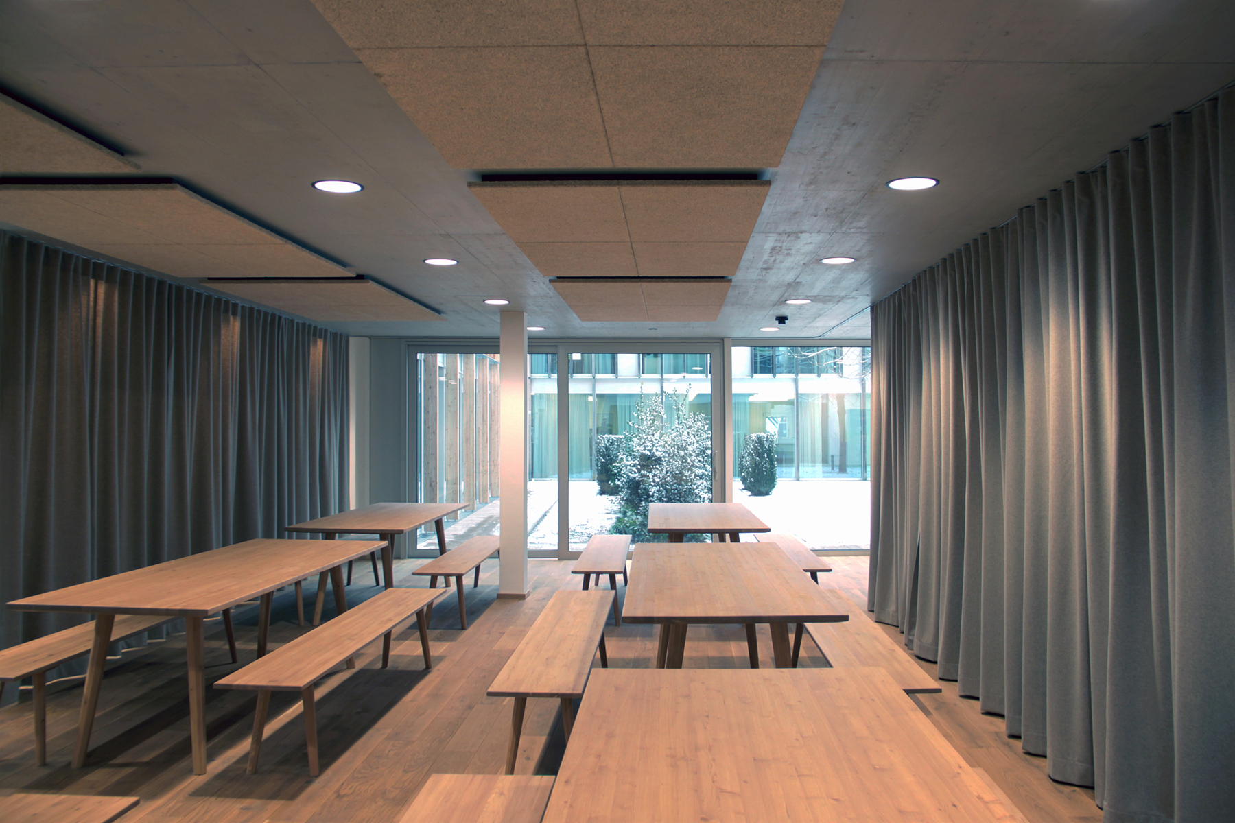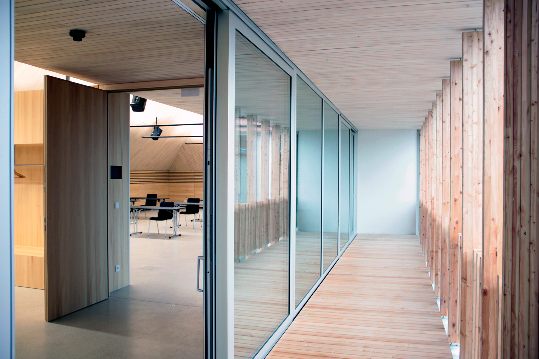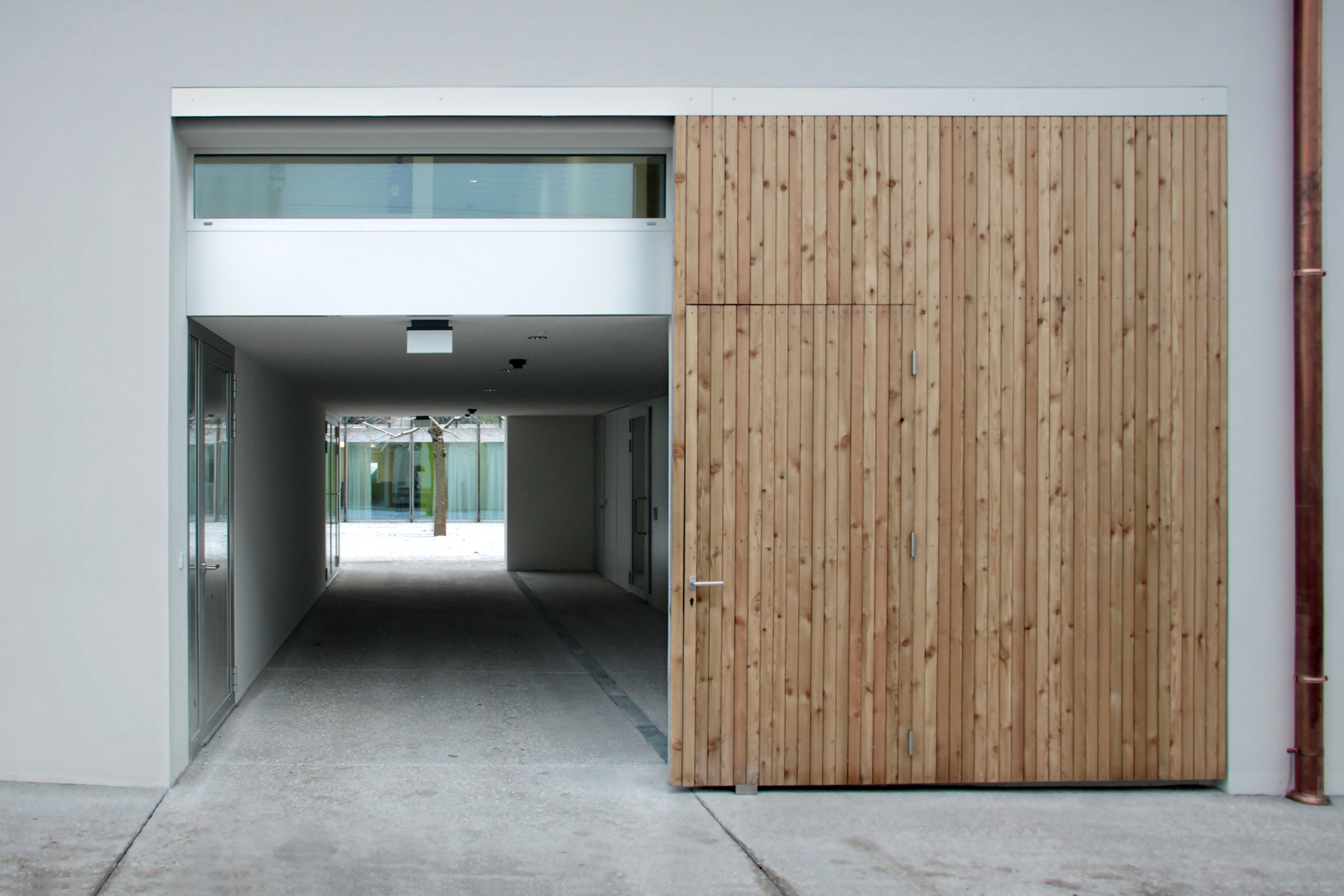 Der Rhythmus der Holzsteher folgt der inneren Raumteilung und bildet die geforderte Geborgenheit und Belichtungssituationen der verschiedenen Nutzungen ab. An der ursprünglichen Hofeinfahrt, im offenen Durchgang, werden einerseits die Büros mit Veranstaltungsbereich und andererseits die Schauküche mit der Kantine für die Belegschaft erschlossen.