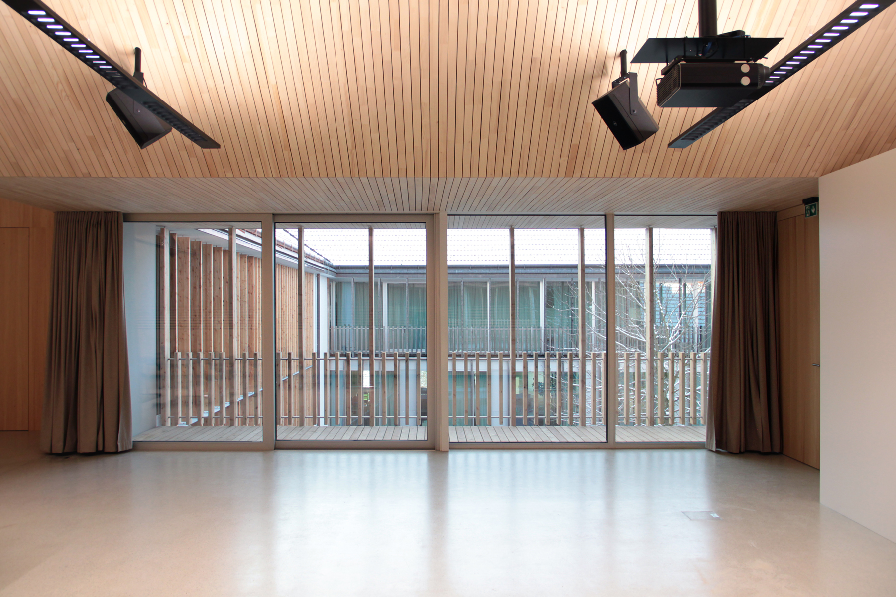 Bereits bei der ersten Ausbauphase 2010 wurde an ein späteres gemeinsames Fluchttreppenhaus als Bindeglied von West- und Südtrakt gedacht. Dies gewährleistet nun eine gute Anbindung an den Westtrakt und ermöglicht zudem eine offene Treppenführung zum Nordtrakt. In dieser „Fuge zwischen Neu und Alt“ wird auch der Veranstaltungsbereich im Dachgeschoß erschlossen. Die in jeder Geschoßebene eingefügten Funktionskerne dienen zur räumlichen Gliederung und trennen die offenen Raumstrukturen vom Zugangsbereich. Je nach Situation sind diese Kerne als Toiletten, Teeküchen oder Garderoben genutzt.