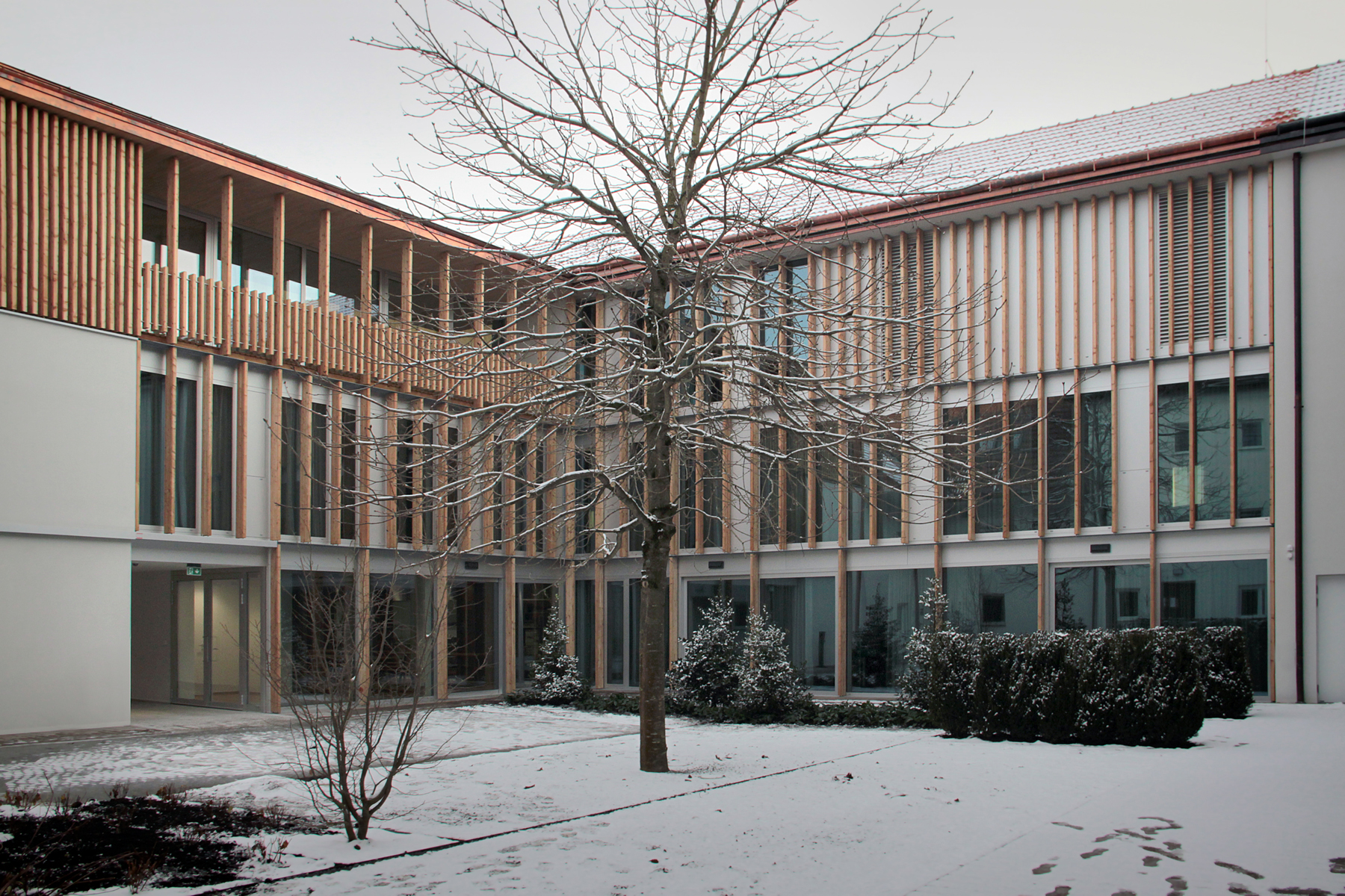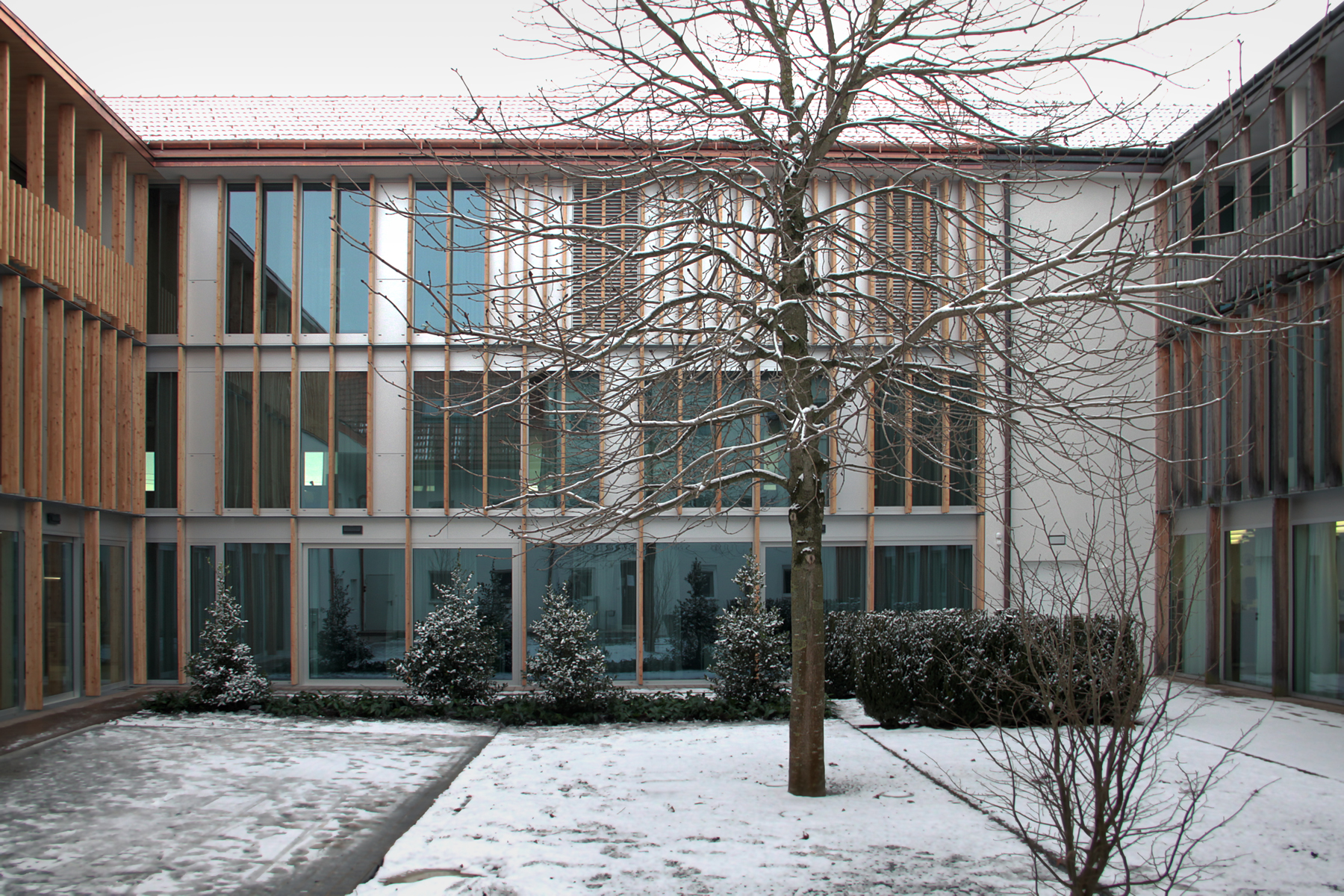 Im obersten Geschoß sind Technik, Seminarräume und der Veranstaltungsraum im offenen Dachraum untergebracht. Eine vorgelagerte Veranda bietet geschützten Freiraum für die Pausen. Die unterschiedlichen Nutzungen und Erschließungswege werden vom Innenhof des Vierkanters begleitet – der Firmenursprung bleibt somit stets präsent. (Text: Architekten)