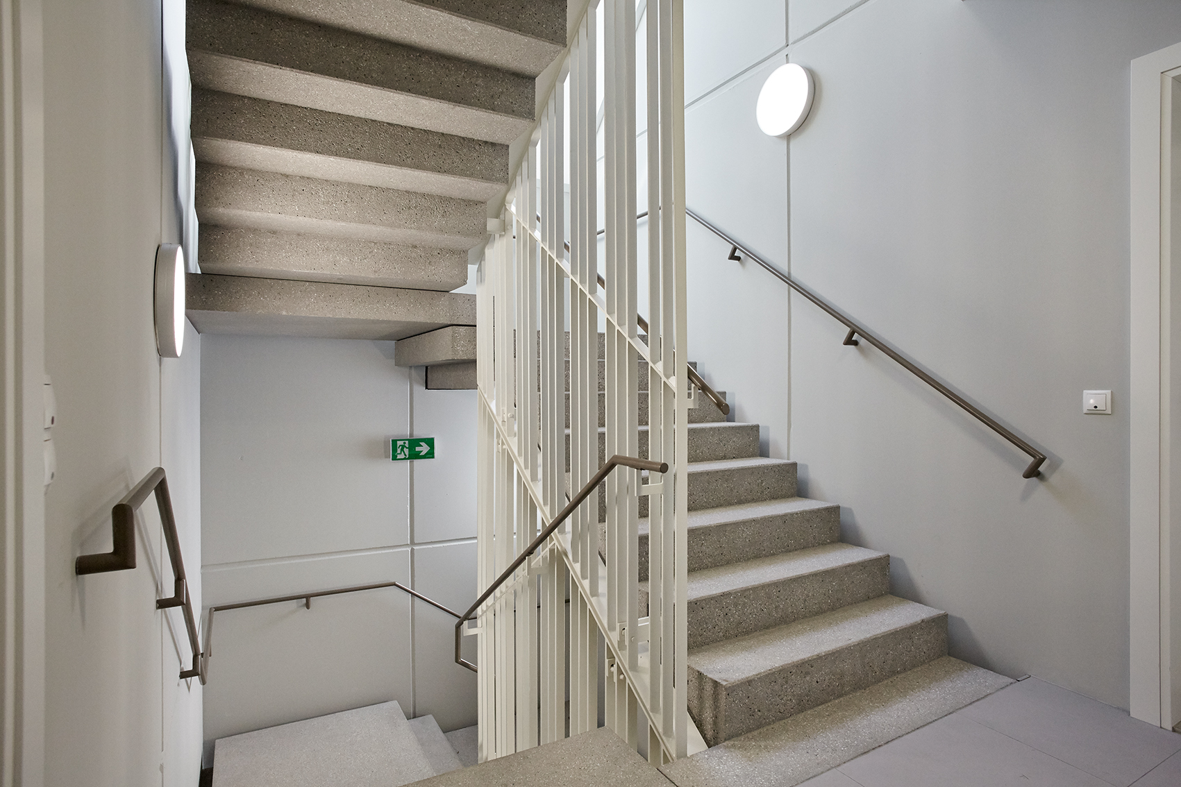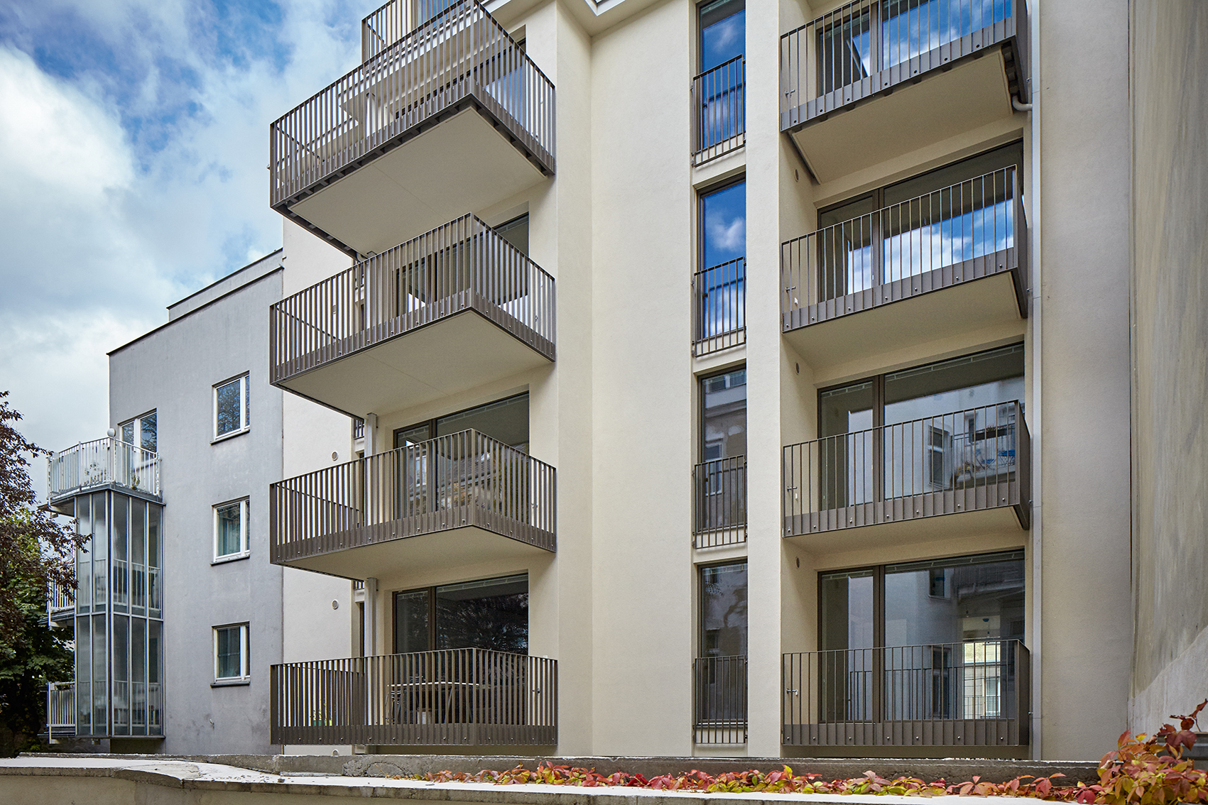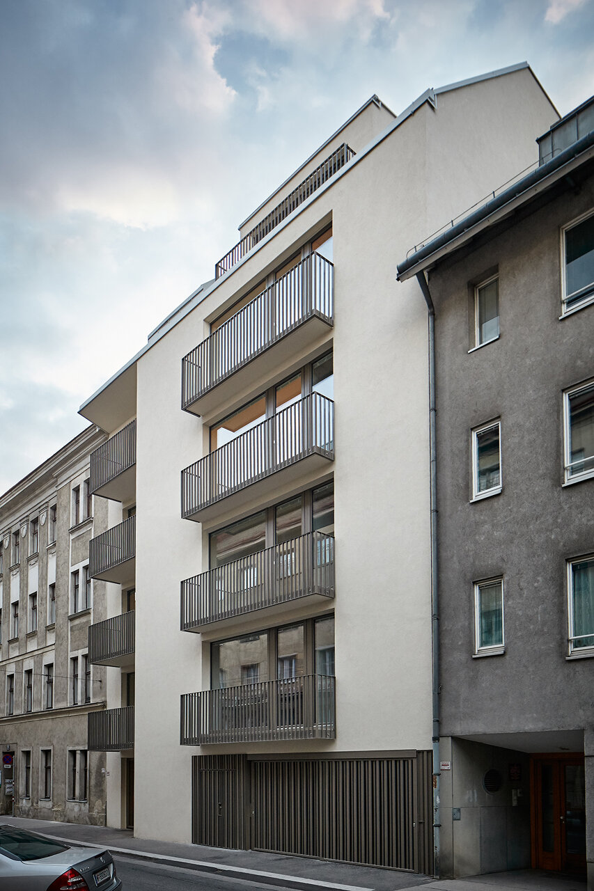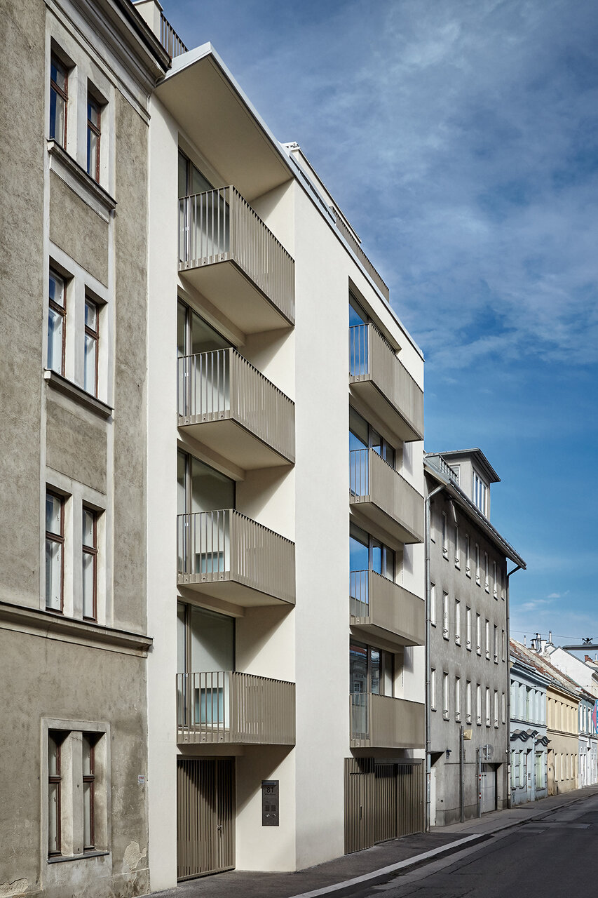 Zur Planungszeit waren Balkone an der Fassade in der Wiener Bauordnung noch untersagt, nur mit kreativer Interpretation der Regeln und durch einen Rücksprung in der Straßenfront, unter Verzicht auf maximale Ausnutzung der Baulinie, konnten sie umgesetzt werden.