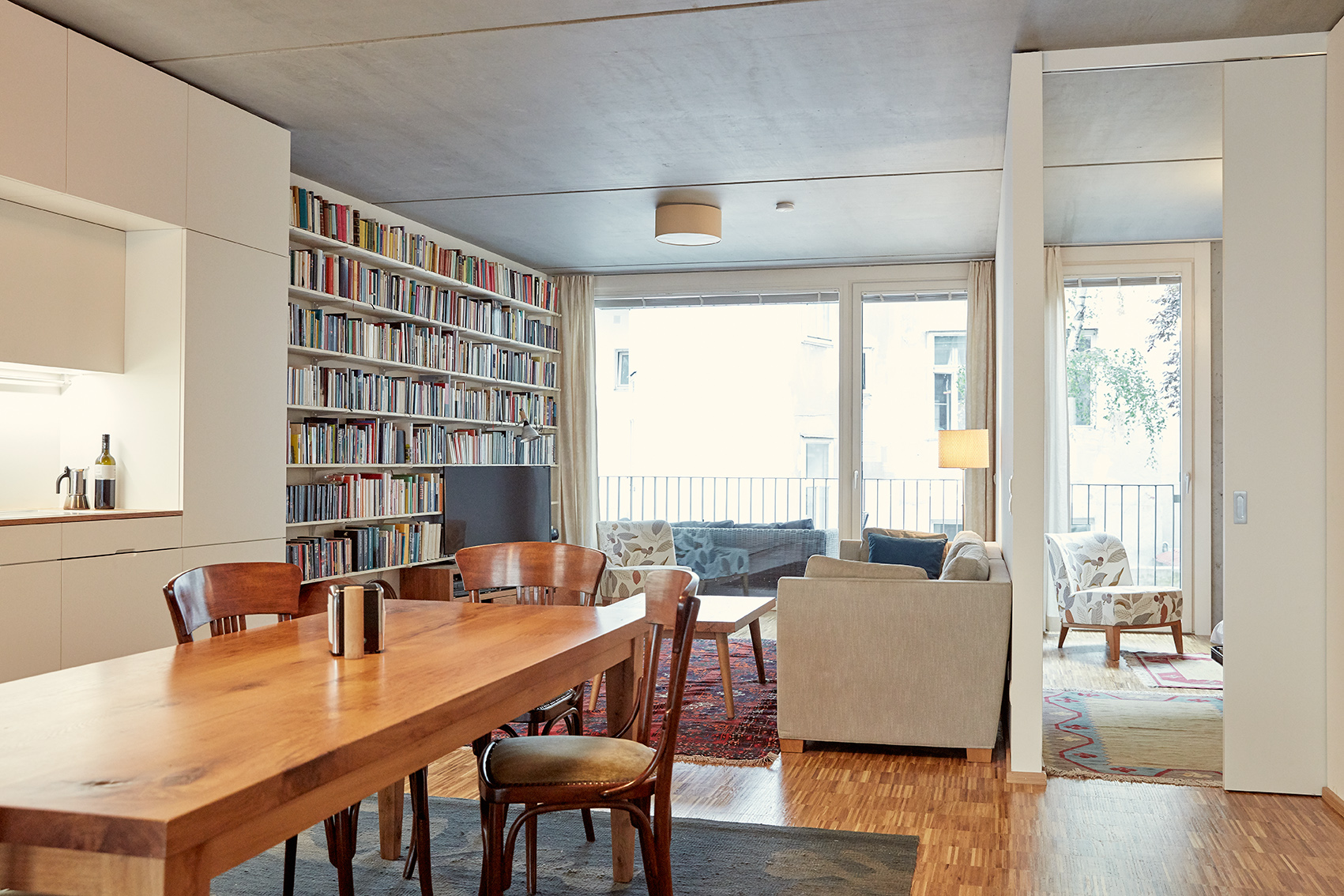 Große Deckenspannweiten, leichte Trennwände und raumhohe Schiebetüren gewähren innerhalb der Wohnungen größtmögliche Flexibilität.