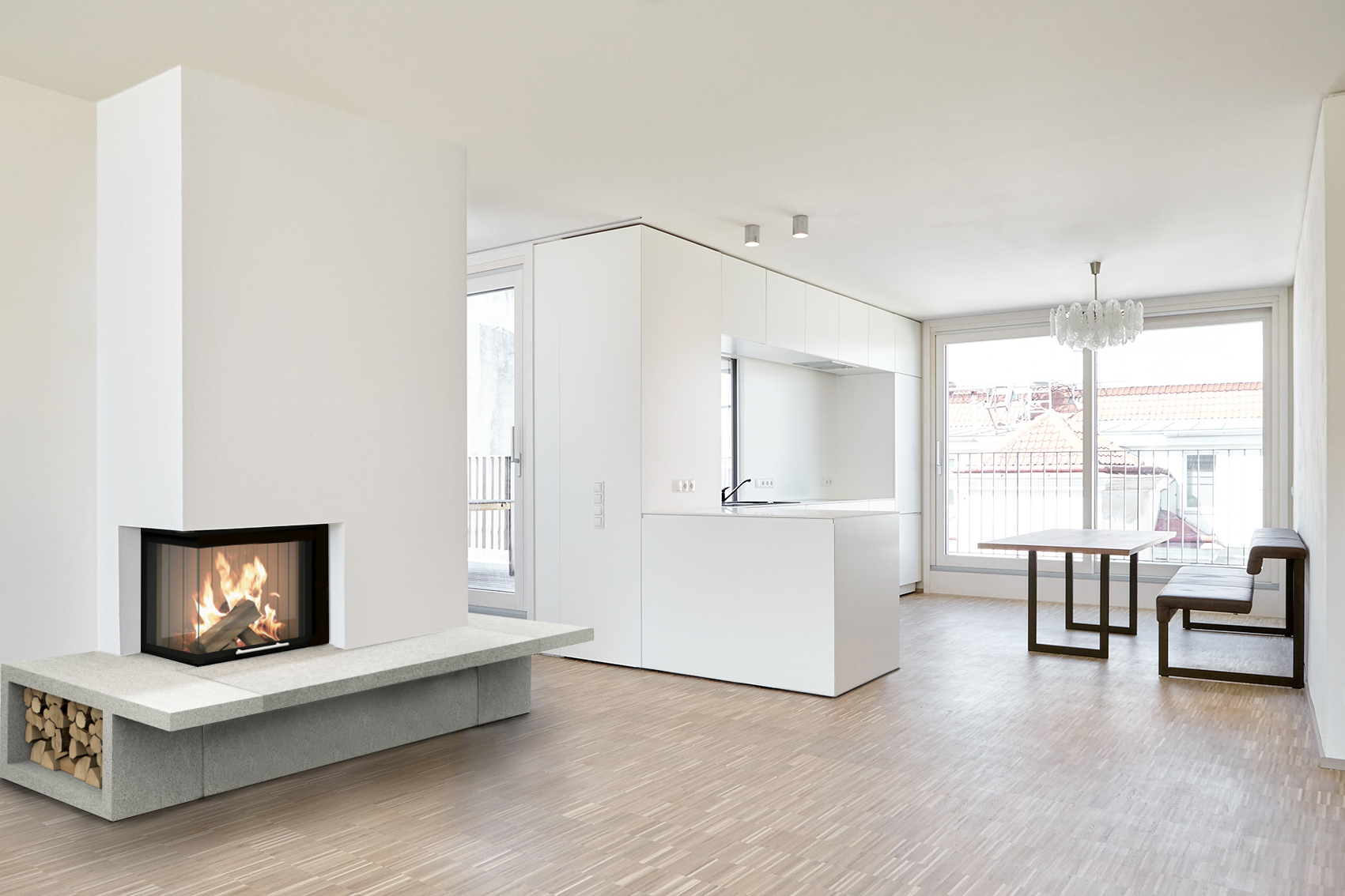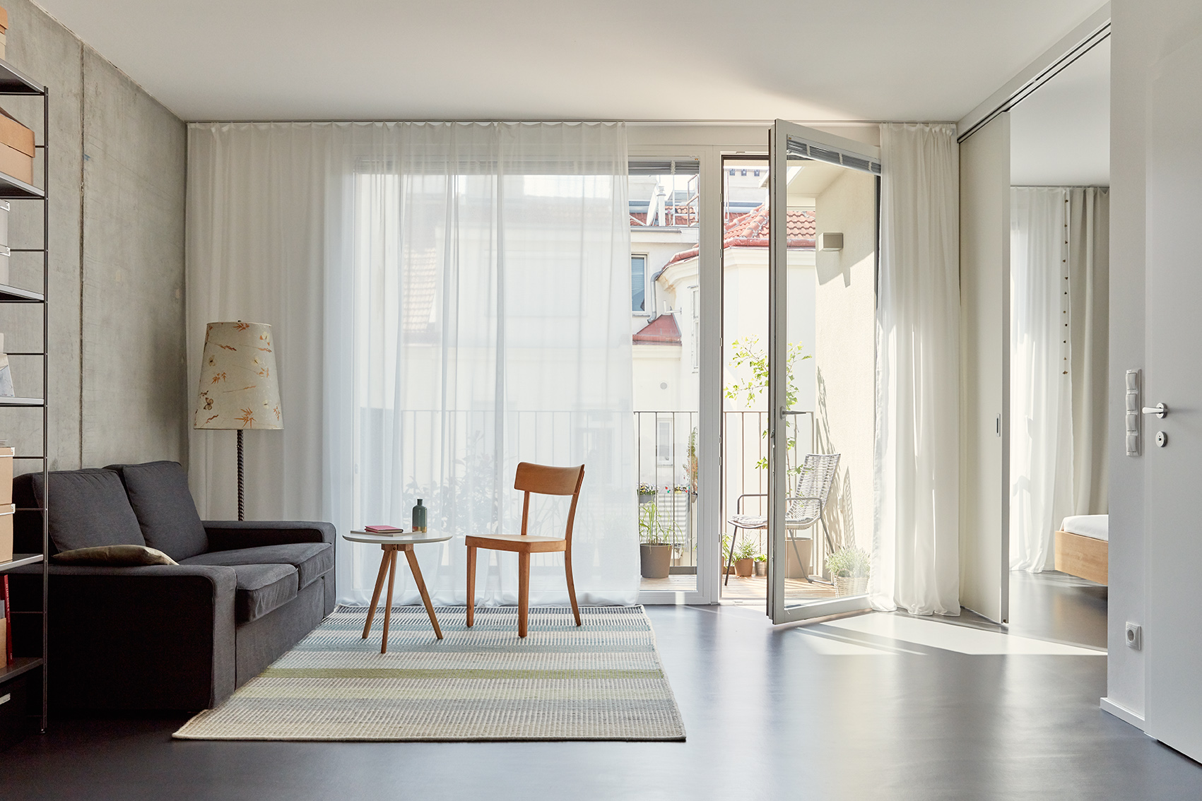 Kern der Wohnungen ist ein großzügiger „Allraum“, der sich über die gesamte Haustiefe erstreckt und sich sowohl hof- als auch straßenseitig in einen Außenraum erweitert. Zugunsten dieses Raums für gemeinschaftliche Aktivitäten sind die übrigen Räume kompakt gehalten und können, wie Vorraum und Gang, auch ganz entfallen. KABE Architekten berufen sich mit ihrer Idee des Zentralraums auf „das niederdeutsche Hallenhaus und den skandinavischen Allraum, wie ihn Alvar Alto 1957 im Berliner Hansaviertel umsetzte.“