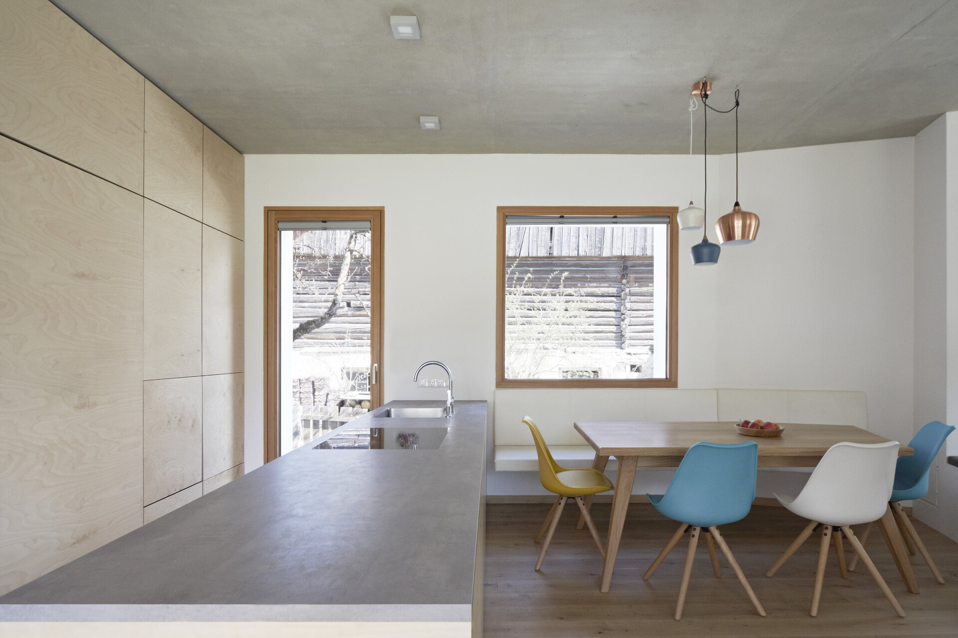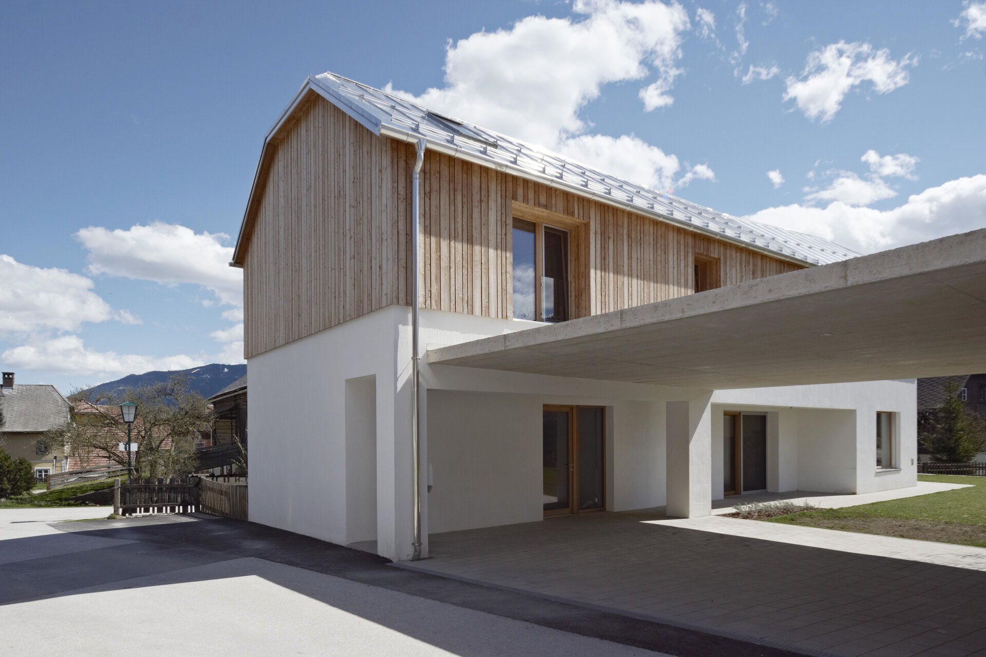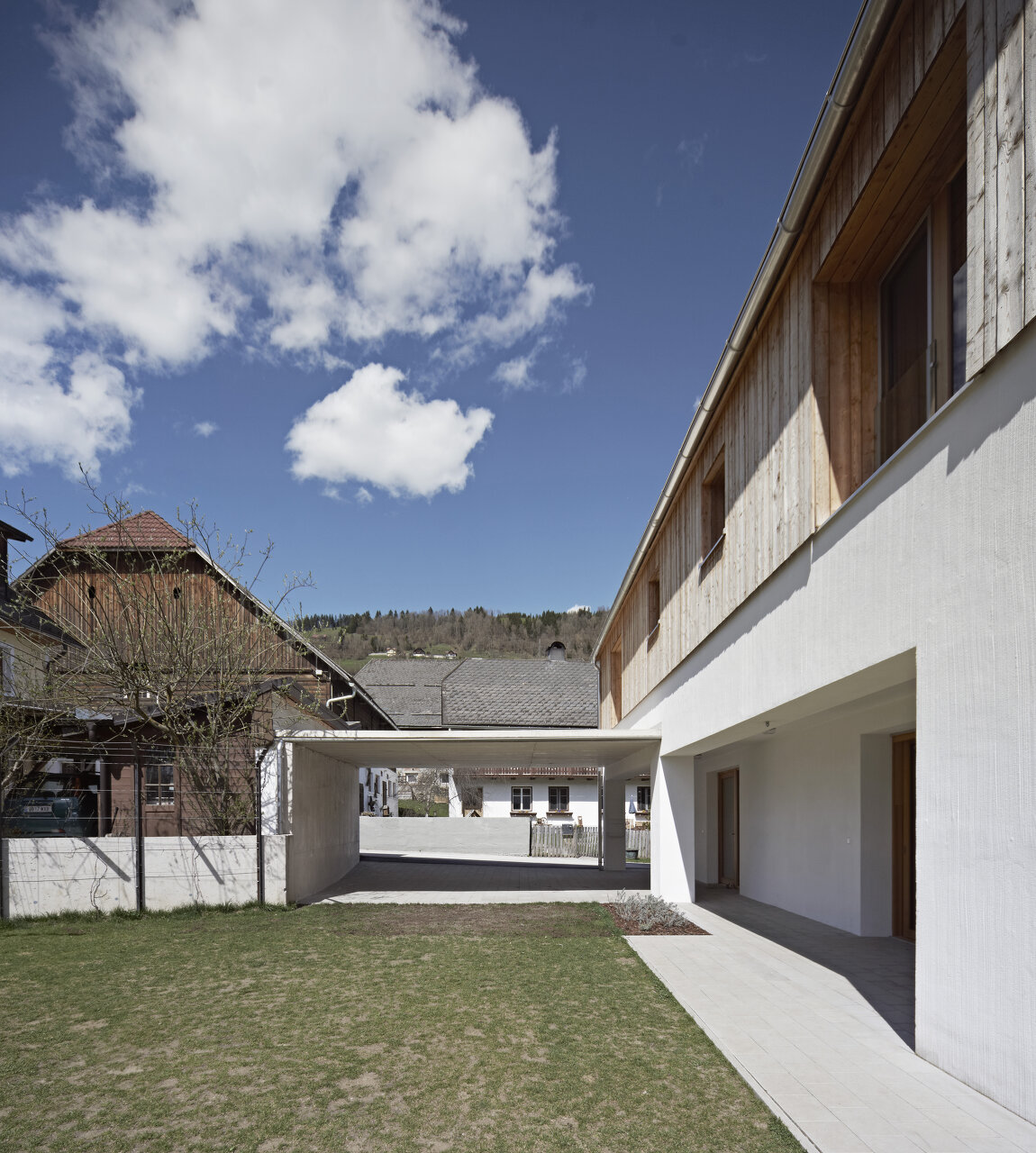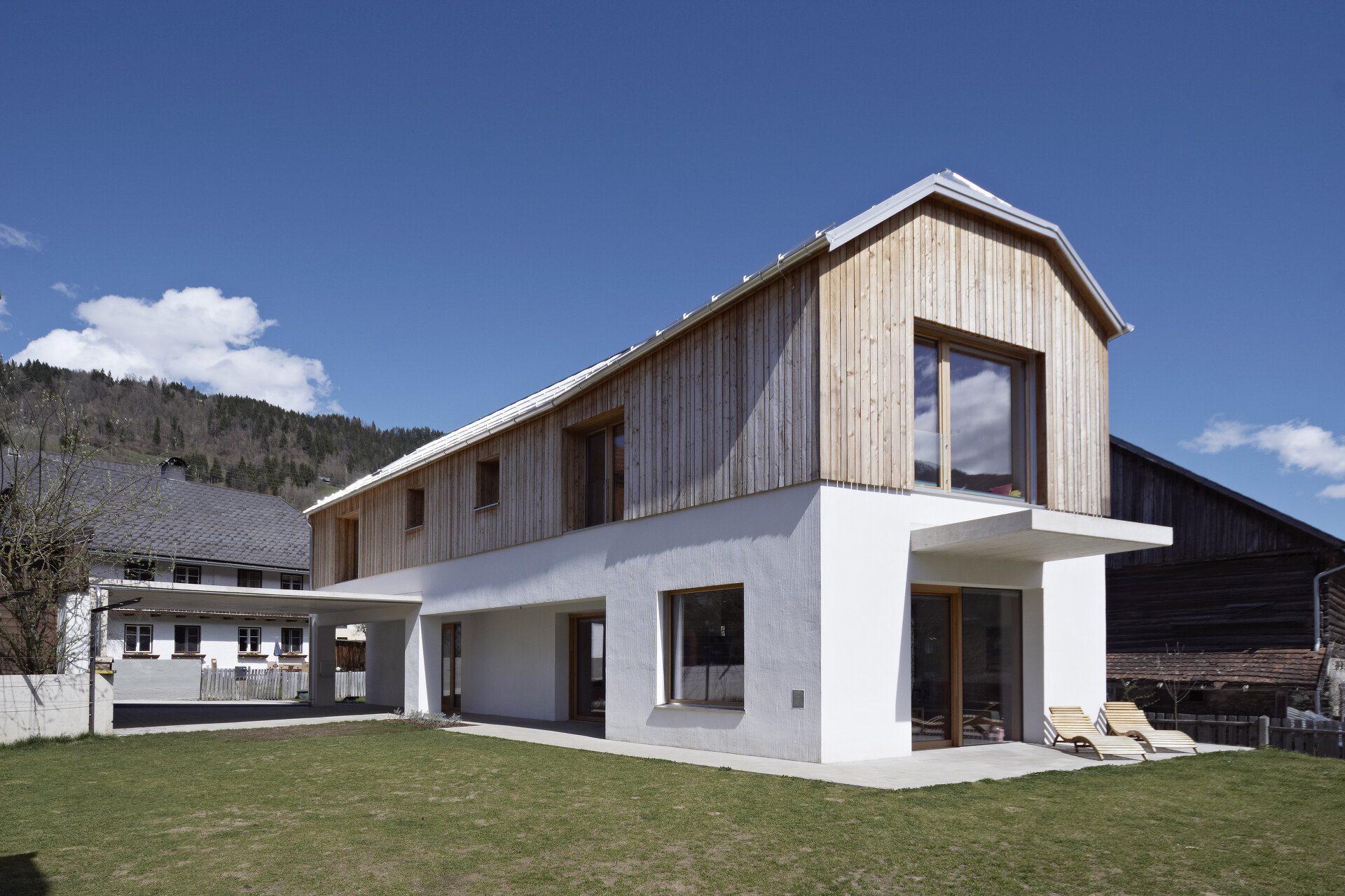 Mit Verweis auf die bestehende Nachbarbebauung und die selbstverständliche Qualität der landwirtschaftlichen Zweckbauten unterliegt auch die Detaillierung der Idee des „Weglassens“. Der gedeckte Stellplatz bleibt in rohem Beton und erhält keine Abdichtung, ebenso gilt dies für den konstruktiven Sonnenschutz im Süden. (Text: Architekten)