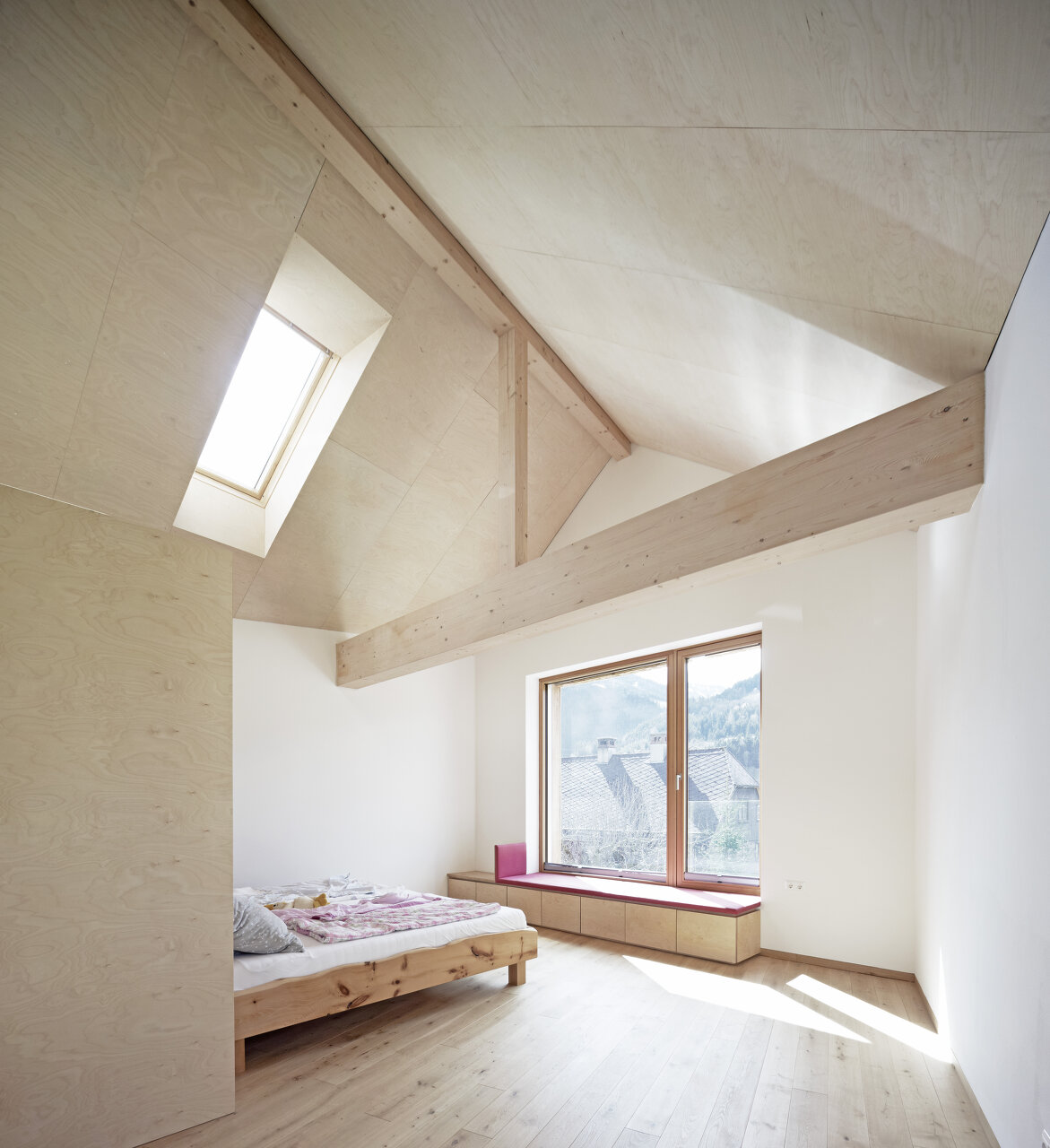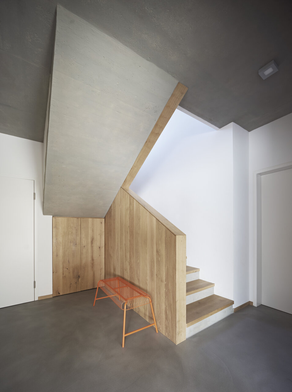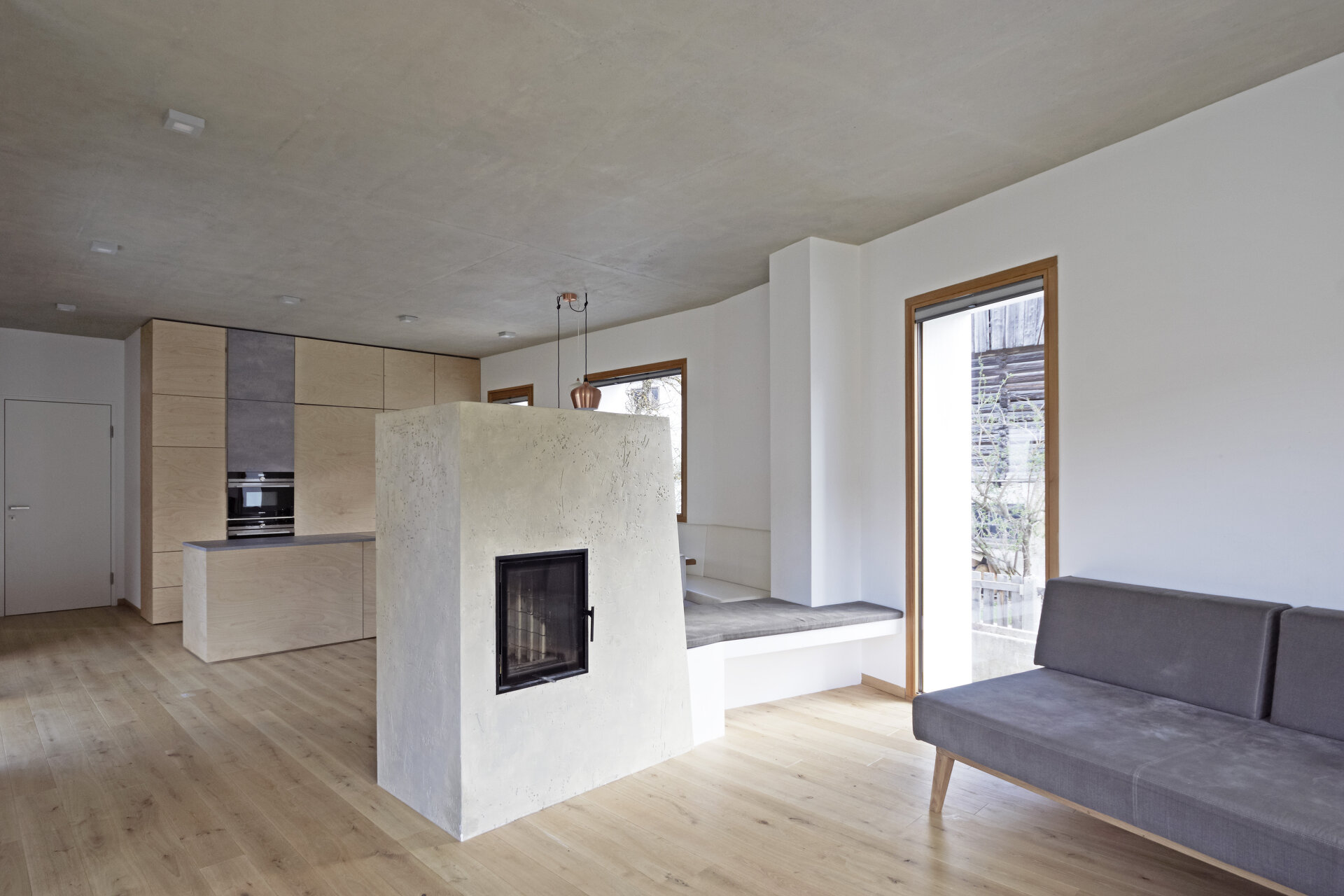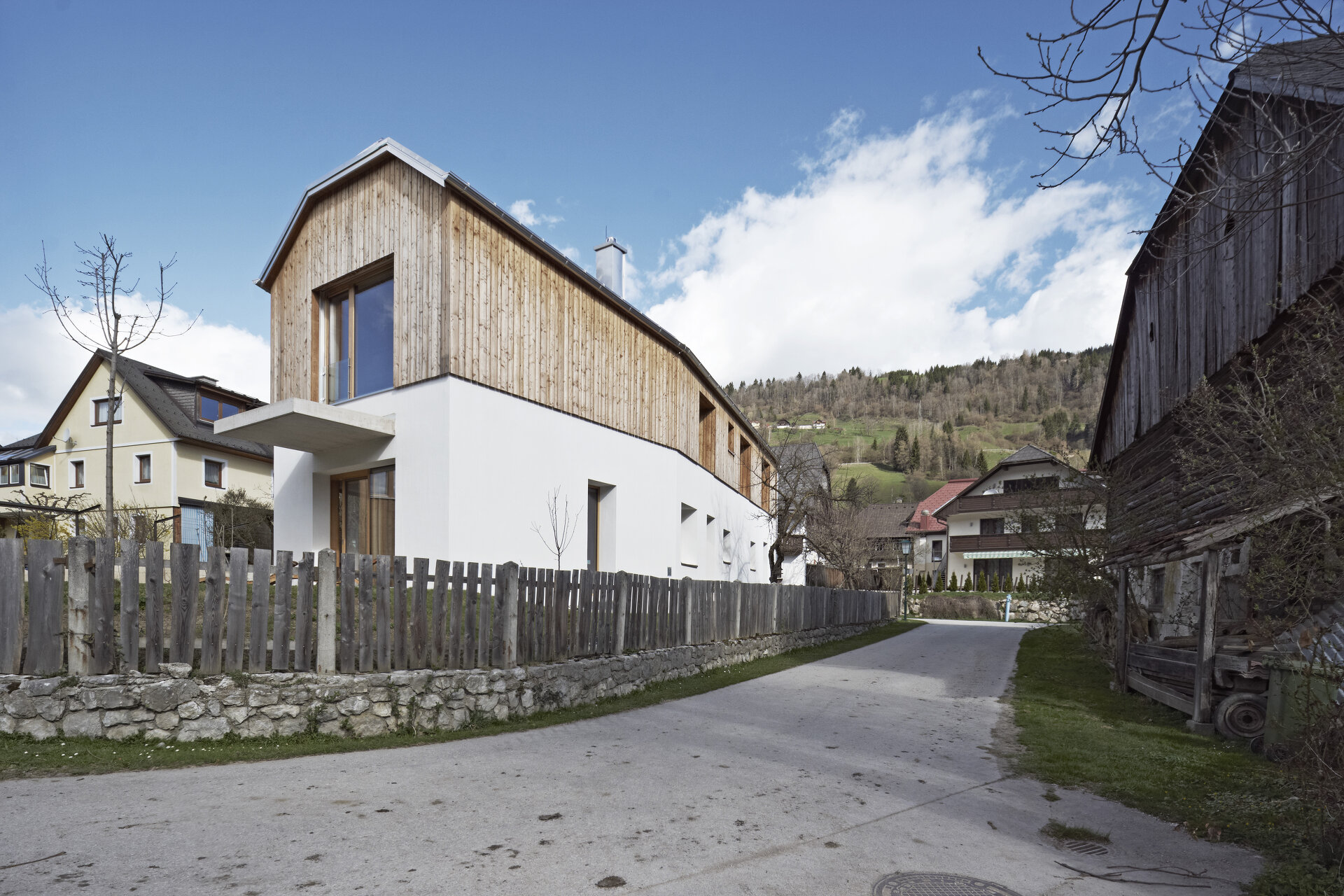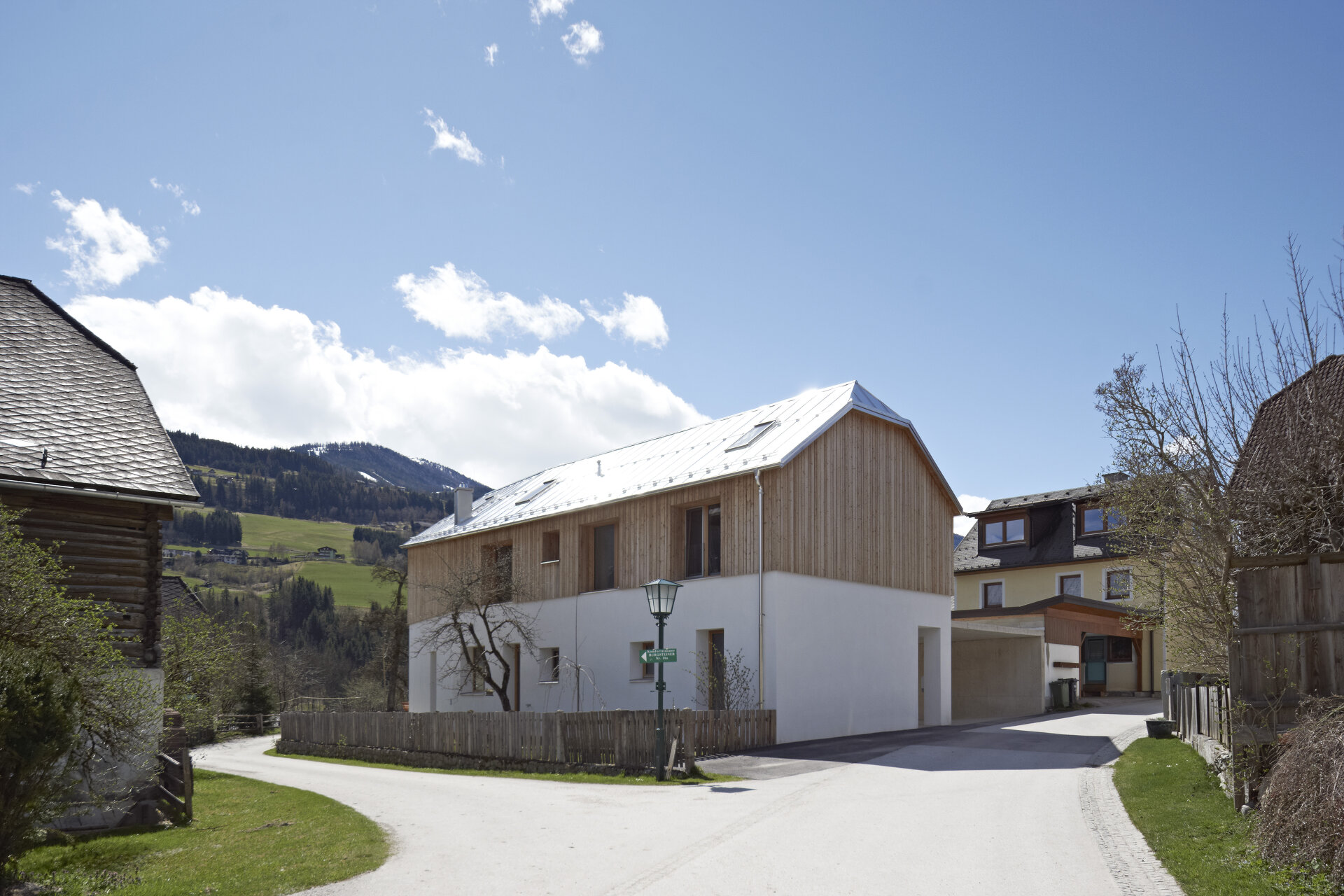 Mit Verweis auf die bestehende Nachbarbebauung und die selbstverständliche Qualität der landwirtschaftlichen Zweckbauten unterliegt auch die Detaillierung der Idee des „Weglassens“. Der gedeckte Stellplatz bleibt in rohem Beton und erhält keine Abdichtung, ebenso gilt dies für den konstruktiven Sonnenschutz im Süden. (Text: Architekten)