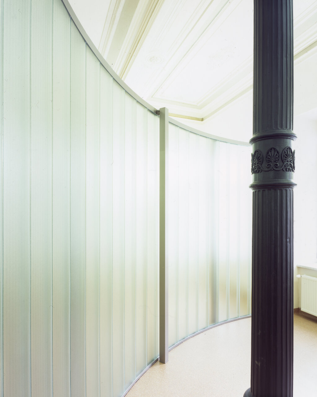Alt versus Modern, Schwer versus Leicht. Das Projekt spielt mit modernen transluzenten Elementen ohne die historischen gusseisernen Säulen zu berühren und setzt sie in neues Licht. (Text: Architekt)