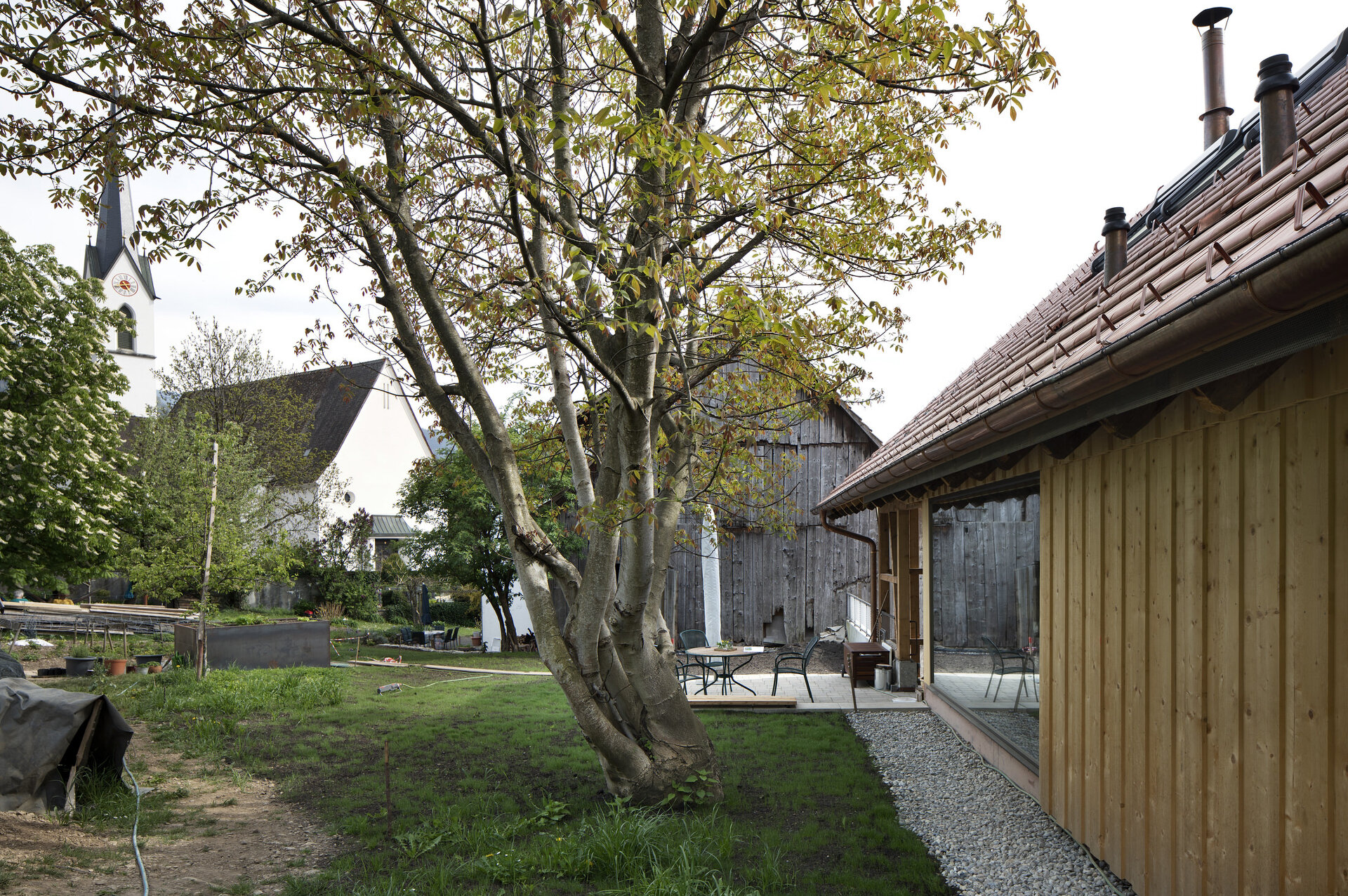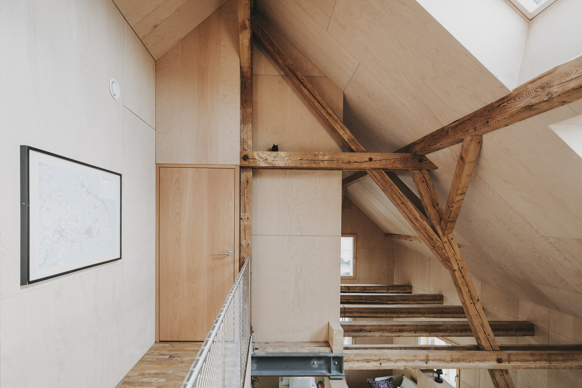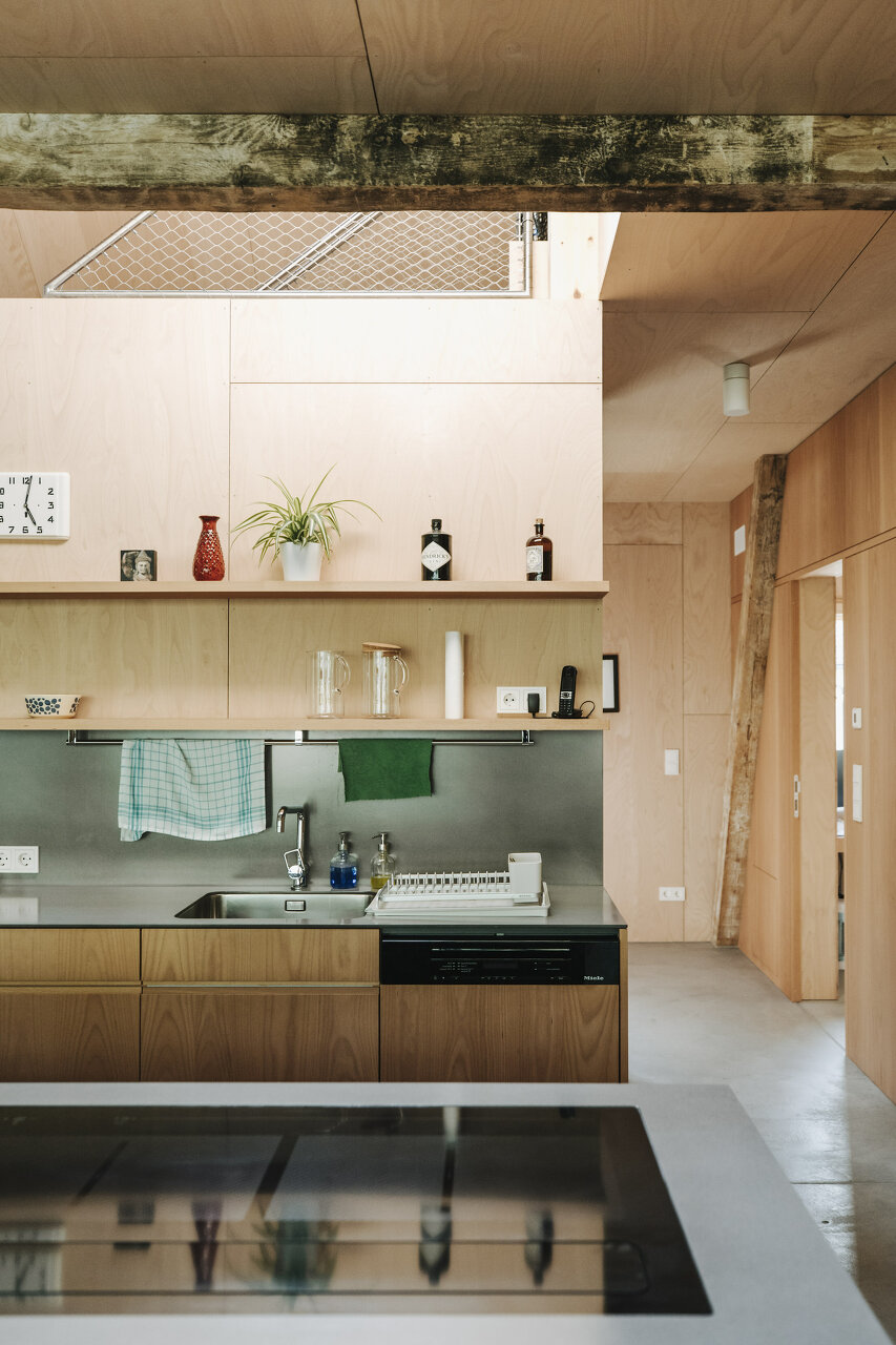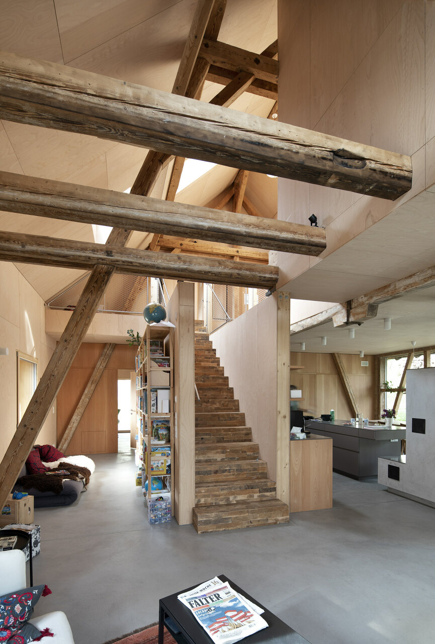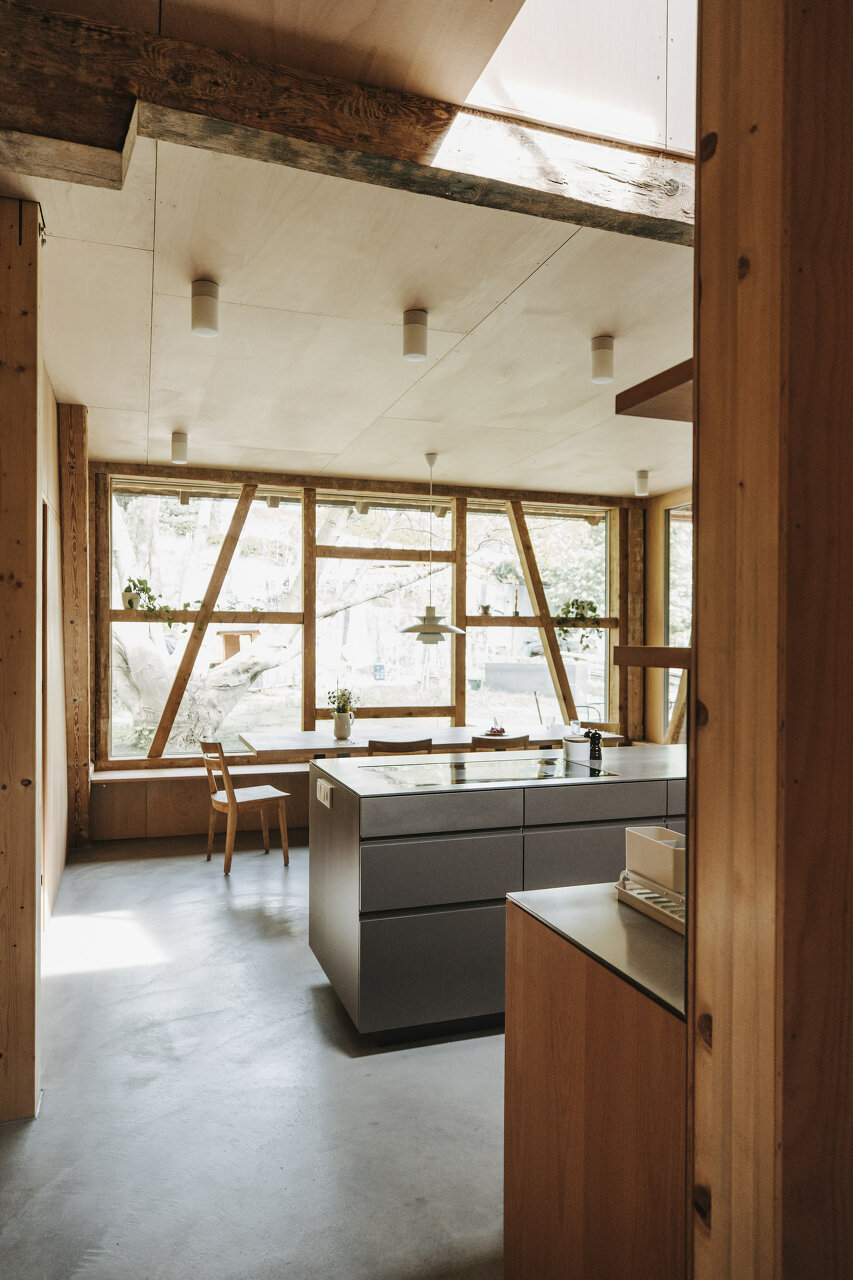 Der große und stützenfreie ehemalige Werkstattraum ist als Wohn-, Koch- und Essbereich offen gestaltet und rund um die zentrale freistehende Küche und den Treppenaufgang organisiert. Die Wohnebene öffnet sich nach oben in den Dachraum und ist geprägt von der ursprünglichen Holzkonstruktion, die fragmentarisch erkennbar ist und nur von nötig gewordenen statischen Ertüchtigungen überlagt wird. Eine kleine Stube, ein Arbeitszimmer und ein Wasch- und WC-Raum werden durch eine Schrankwand abgetrennt. Direkt vor einem großen Fenster mit Blick in den Garten befindet sich der Essplatz. Der Zugang zu Terrasse und Garten ist leicht nach innen versetzt, wodurch ein überdachter Außenraum entsteht.