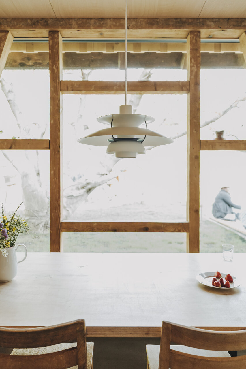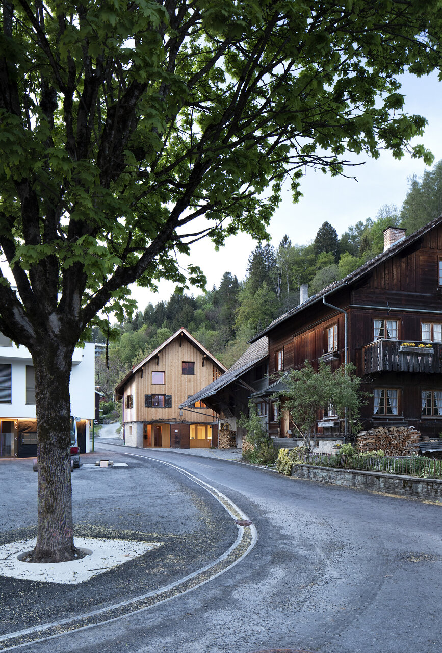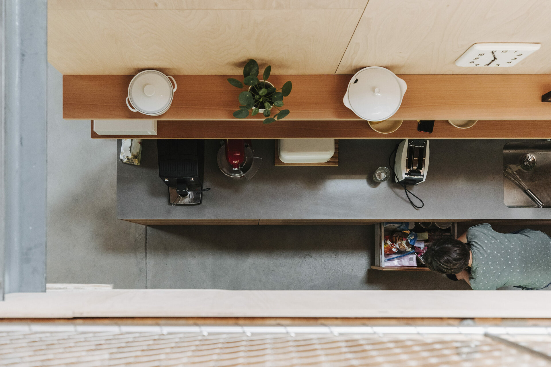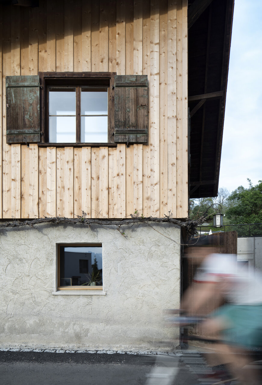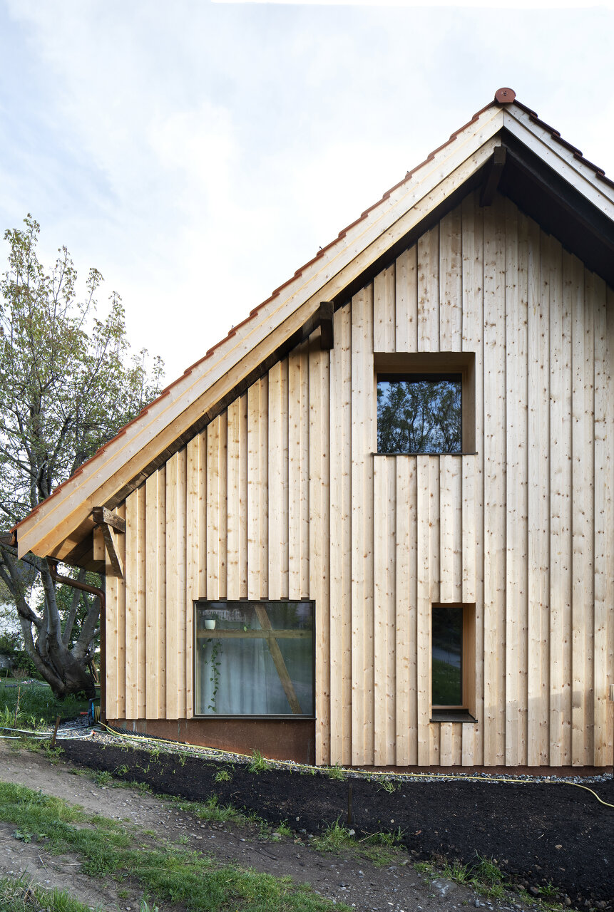 Der große und stützenfreie ehemalige Werkstattraum ist als Wohn-, Koch- und Essbereich offen gestaltet und rund um die zentrale freistehende Küche und den Treppenaufgang organisiert. Die Wohnebene öffnet sich nach oben in den Dachraum und ist geprägt von der ursprünglichen Holzkonstruktion, die fragmentarisch erkennbar ist und nur von nötig gewordenen statischen Ertüchtigungen überlagt wird. Eine kleine Stube, ein Arbeitszimmer und ein Wasch- und WC-Raum werden durch eine Schrankwand abgetrennt. Direkt vor einem großen Fenster mit Blick in den Garten befindet sich der Essplatz. Der Zugang zu Terrasse und Garten ist leicht nach innen versetzt, wodurch ein überdachter Außenraum entsteht.