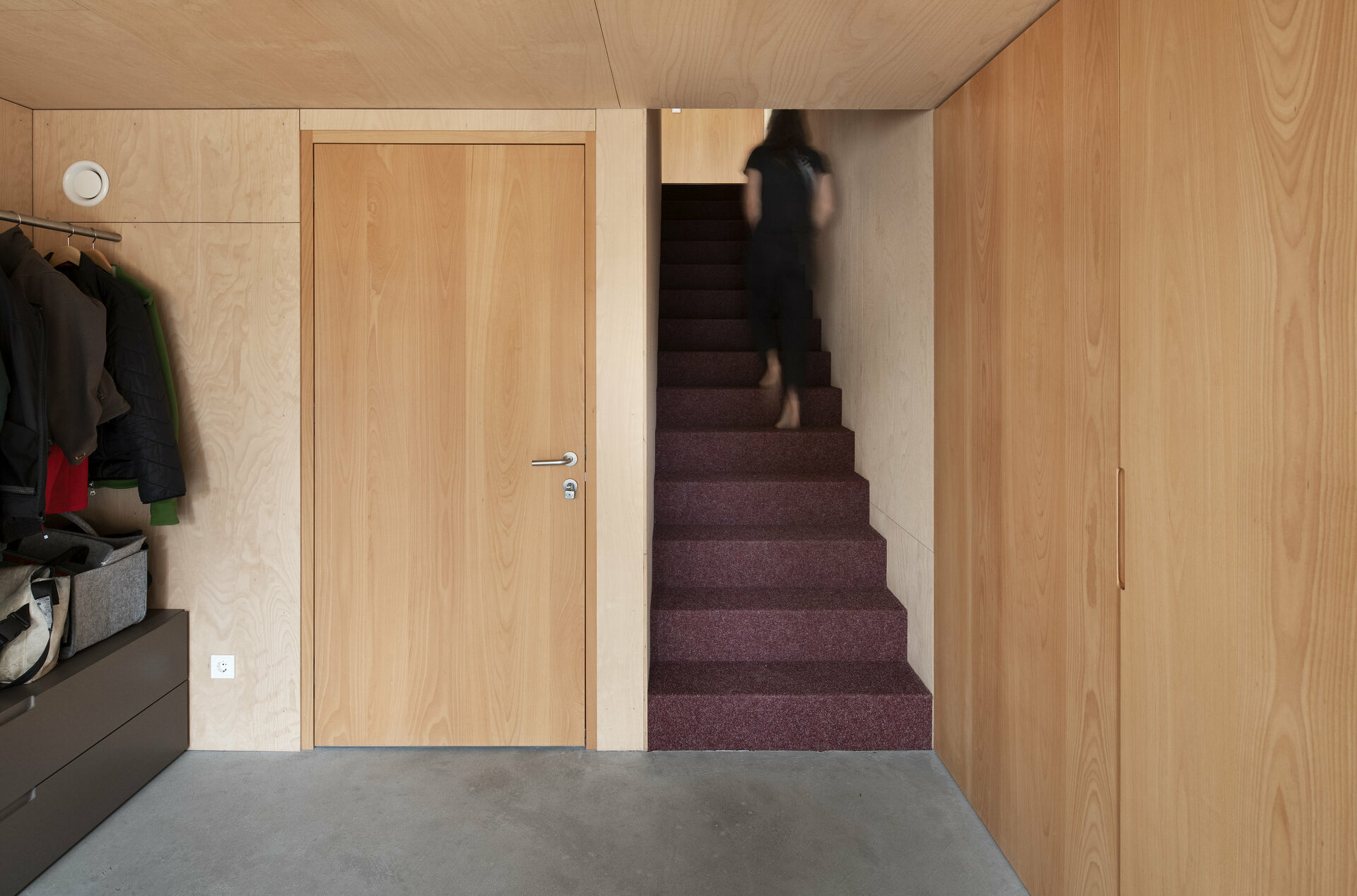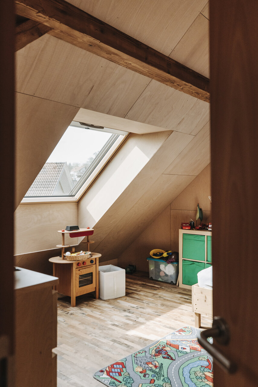 Drei Schlafzimmer und das Bad befinden sich im Obergeschoß unter dem Dach, das in seiner Form und ohne neue Aufbauten erhalten blieb. Dachfenster schaffen punktuell mehr Raumhöhe und lassen viel Tageslicht in die beiden oberen Stockwerke. (Text: Julia Ess, nach einem Text der Architektin)
