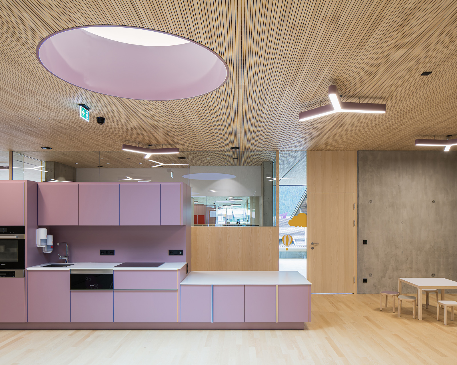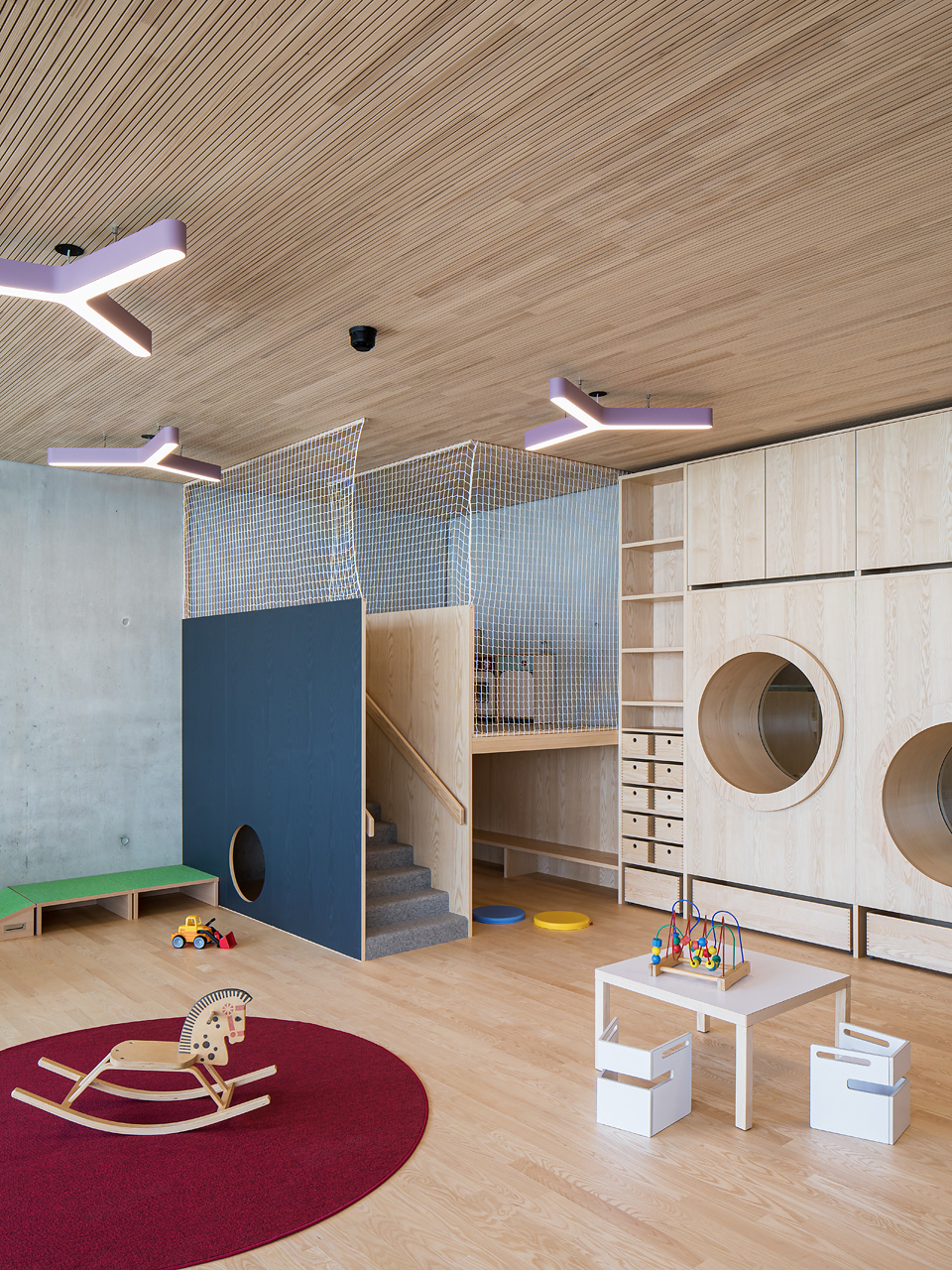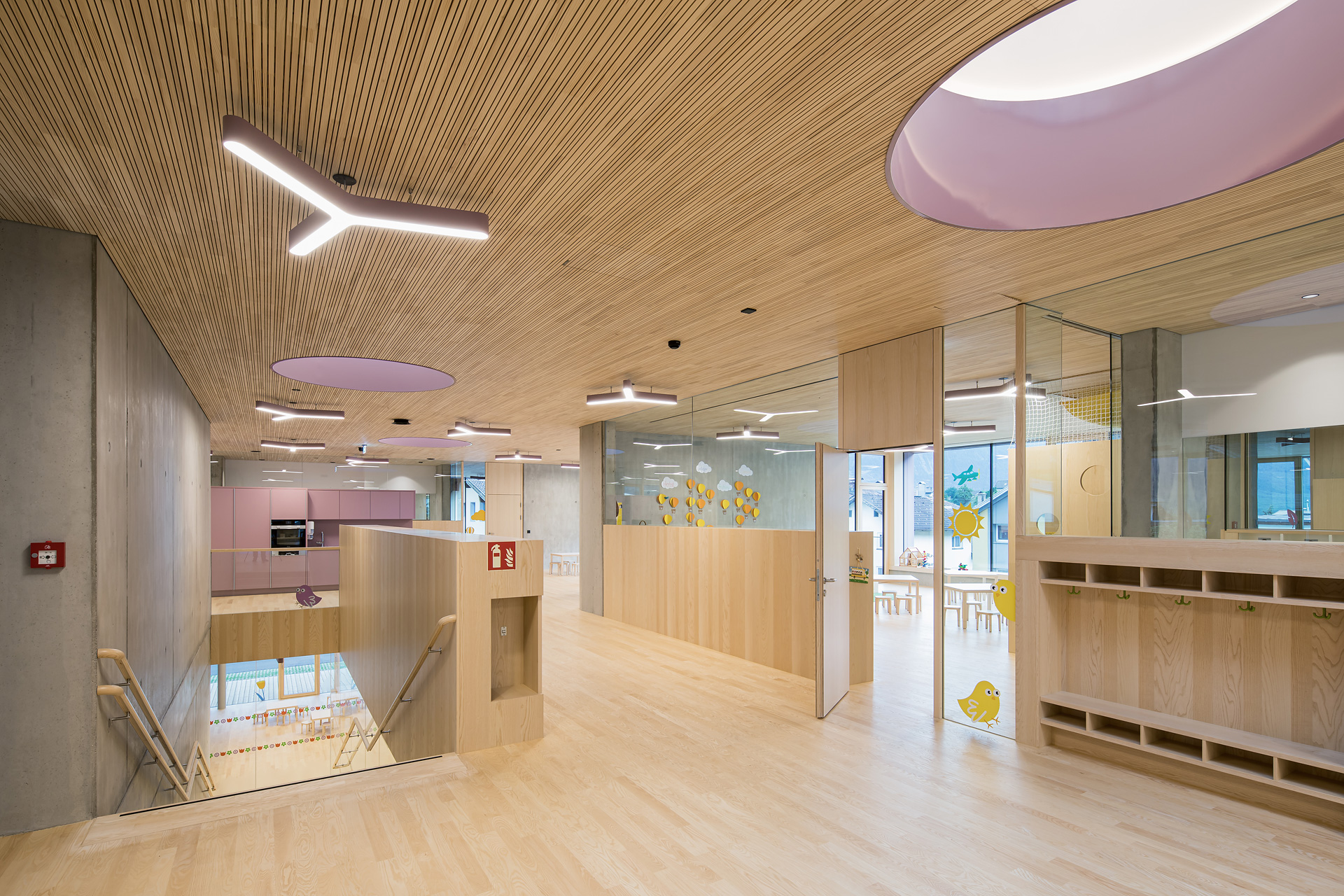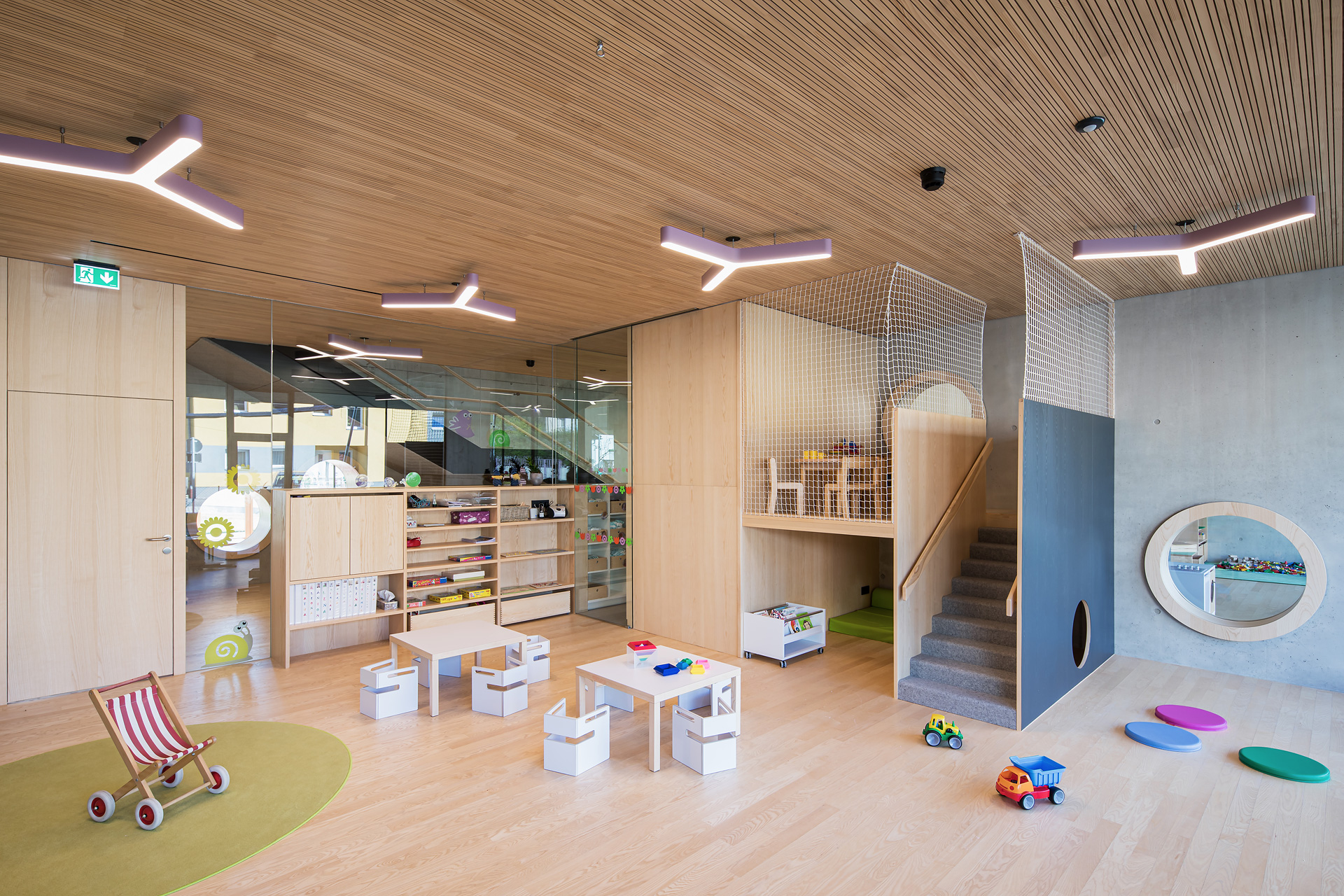 Die Kinderkrippe ist von dem, zusammen mit dem bestehenden Schulgebäude gebildeten, großen Hof im Osten aus erschlossen, hier befinden sich auch die barrierefreien Zugänge zur Tiefgarage und in den Kindergarten. Der Hauptzugang zum Kindergarten liegt im Norden, wo das Obergeschoß aufgrund der Topographie über wenige Stufen erreichbar ist. Beide Geschoßflächen werden durch die großen, entlang des Mittelgangs angeordneten Gruppen- und Bewegungsräume gegliedert, dazwischen bietet ein großzügiges Raumkontinuum genug Platz für Bewegungs- und Begegnungsflächen und ermöglicht dadurch eine offene und übergreifende Pädagogik. Jeder der Gruppenräume von Kinderkrippe und Kindergarten verfügt über einen direkten Zugang ins Freie, im Erdgeschoß zu der rundumlaufenden, vom vorspringenden Obergeschoß überdachten Terrasse, im Obergeschoß zu zwei in den Baukörper eingeschnittenen Terrassen bzw. zu dem im Norden vorgelagerten Außenbereich.