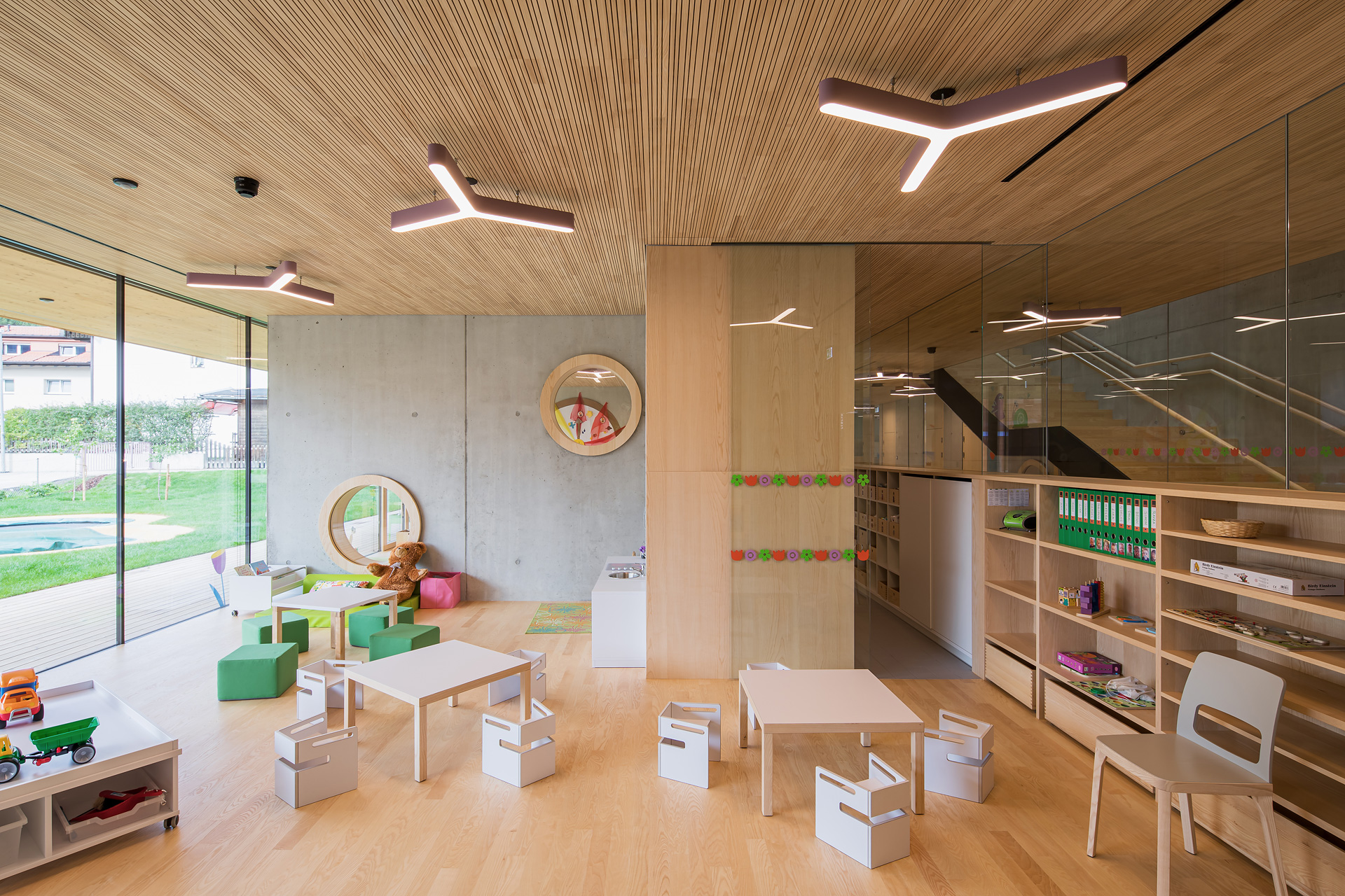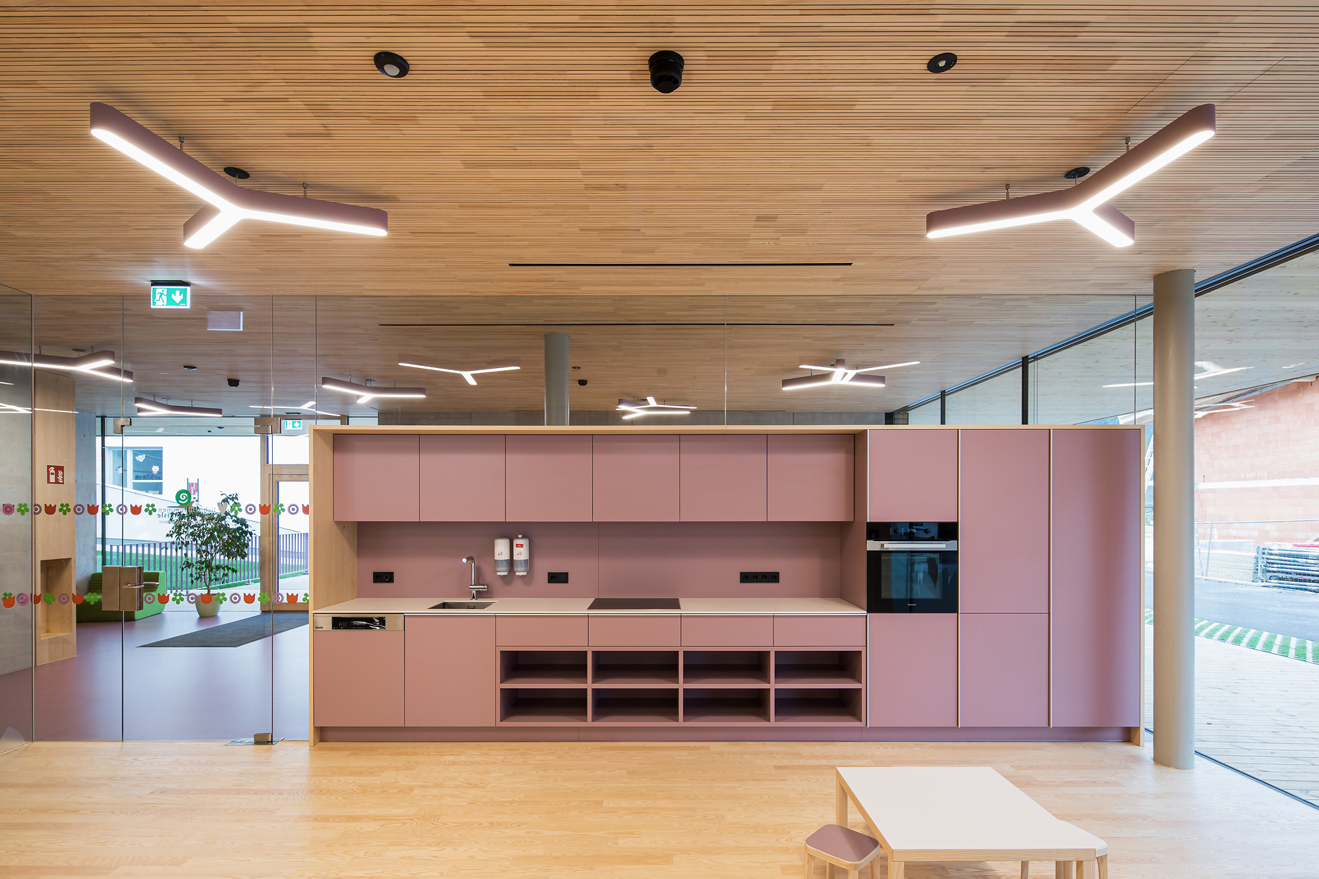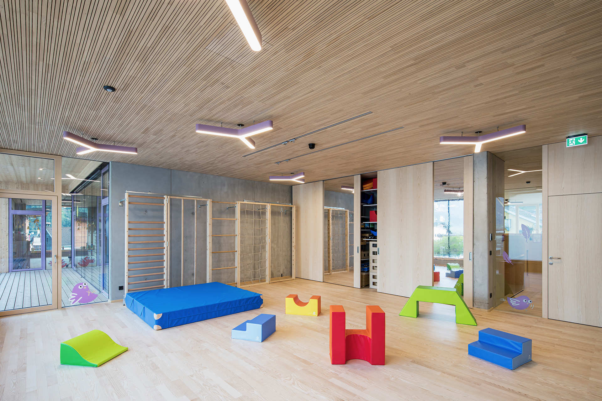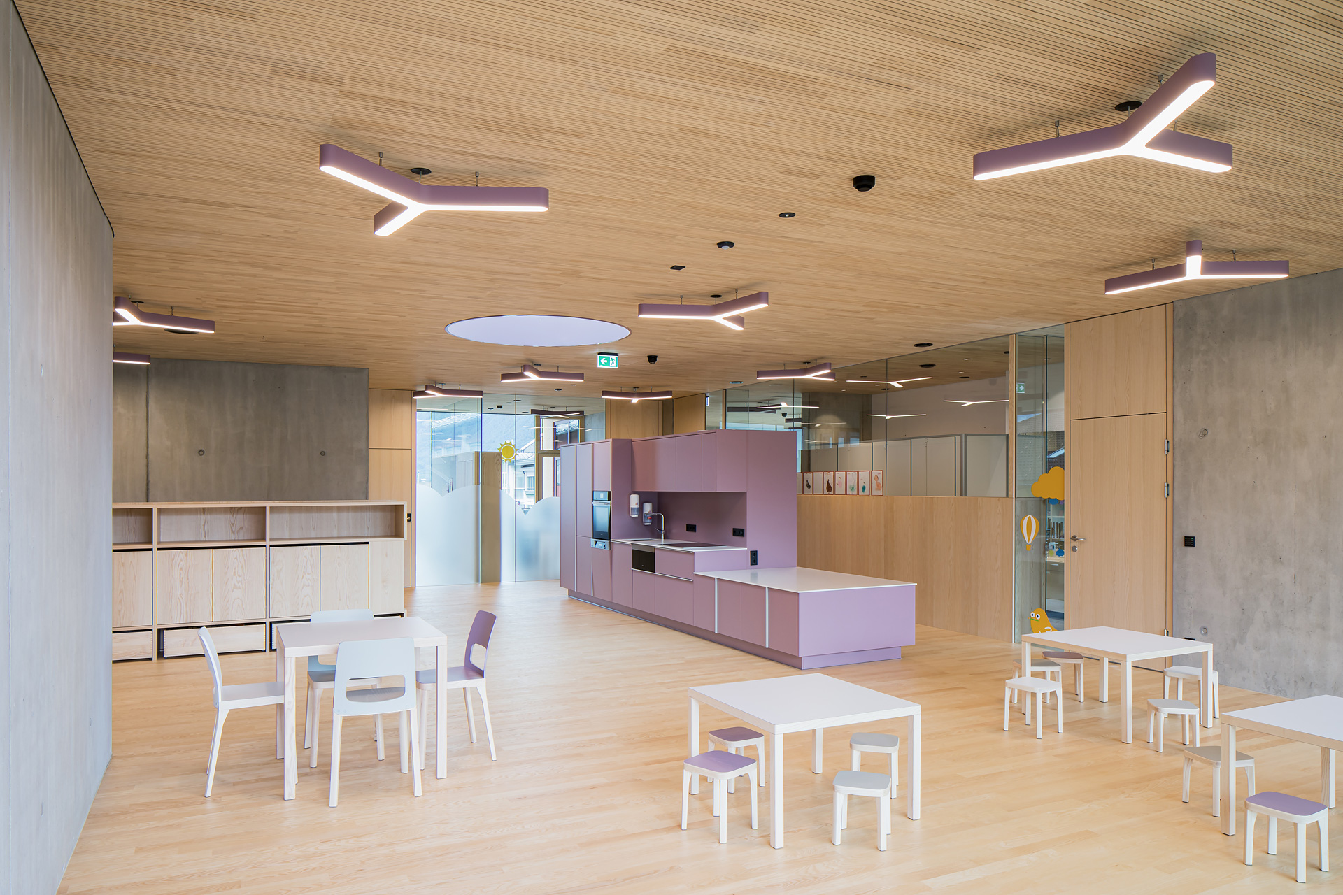 Die Kinderkrippe ist von dem, zusammen mit dem bestehenden Schulgebäude gebildeten, großen Hof im Osten aus erschlossen, hier befinden sich auch die barrierefreien Zugänge zur Tiefgarage und in den Kindergarten. Der Hauptzugang zum Kindergarten liegt im Norden, wo das Obergeschoß aufgrund der Topographie über wenige Stufen erreichbar ist. Beide Geschoßflächen werden durch die großen, entlang des Mittelgangs angeordneten Gruppen- und Bewegungsräume gegliedert, dazwischen bietet ein großzügiges Raumkontinuum genug Platz für Bewegungs- und Begegnungsflächen und ermöglicht dadurch eine offene und übergreifende Pädagogik. Jeder der Gruppenräume von Kinderkrippe und Kindergarten verfügt über einen direkten Zugang ins Freie, im Erdgeschoß zu der rundumlaufenden, vom vorspringenden Obergeschoß überdachten Terrasse, im Obergeschoß zu zwei in den Baukörper eingeschnittenen Terrassen bzw. zu dem im Norden vorgelagerten Außenbereich.