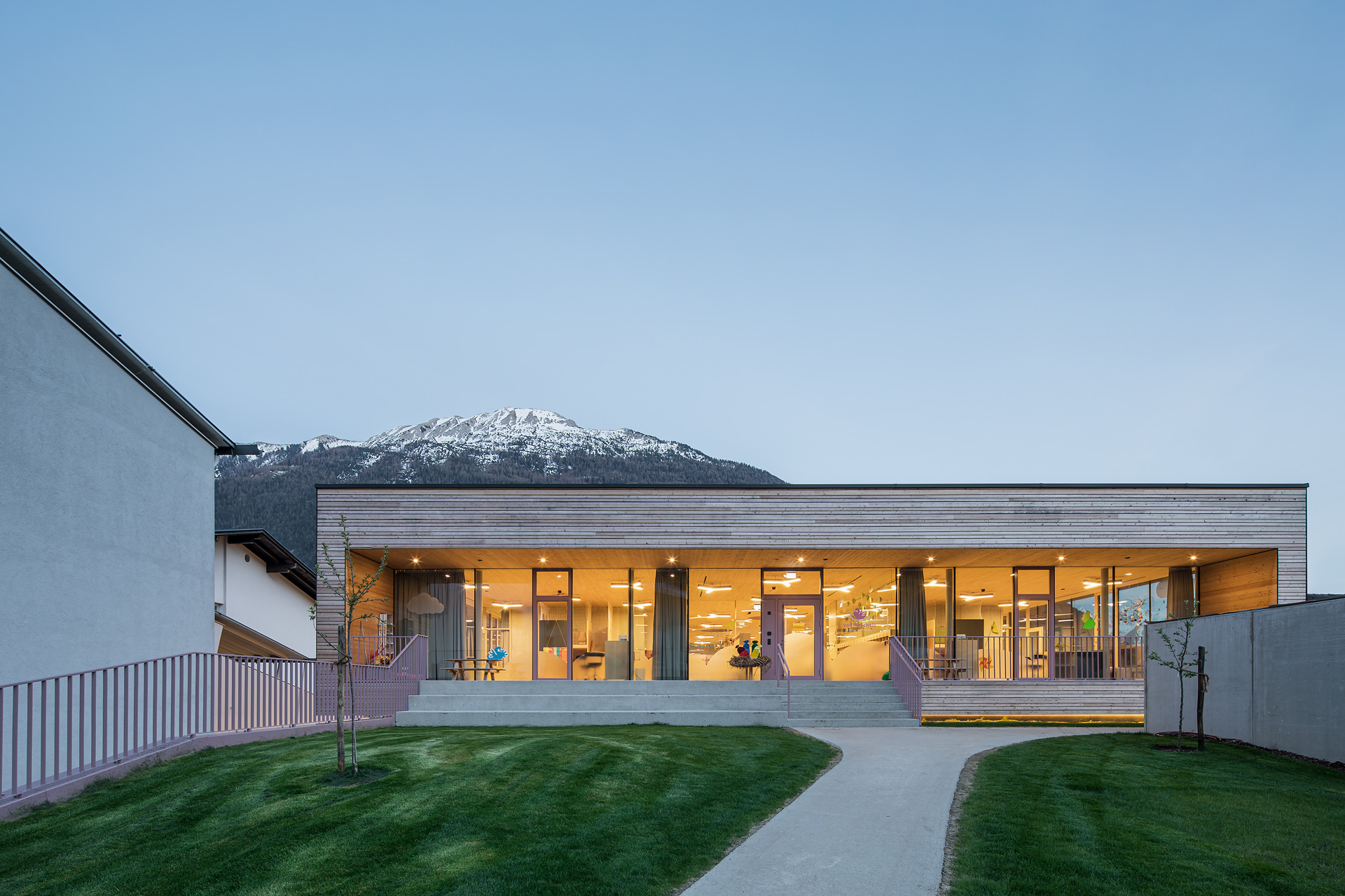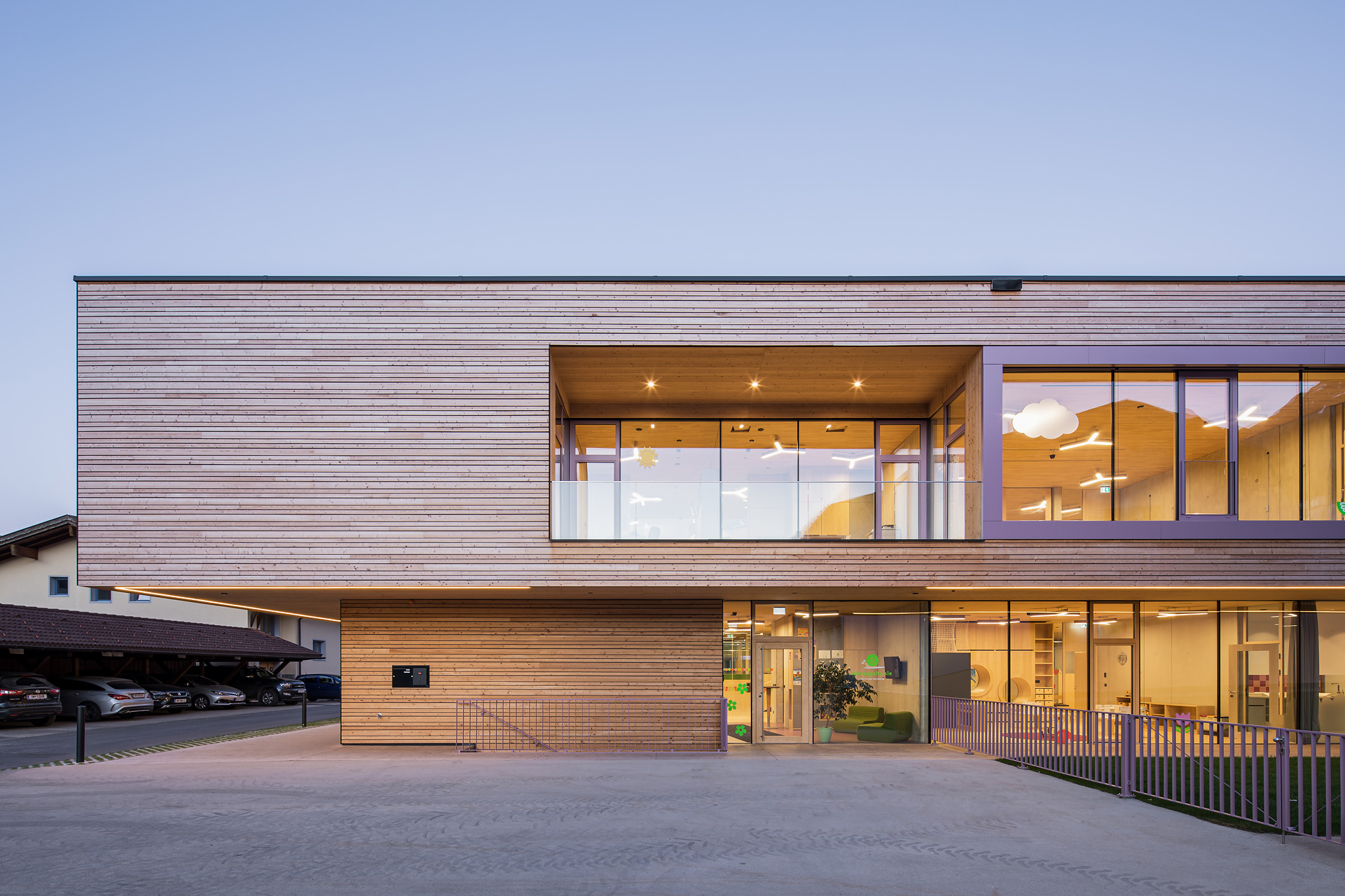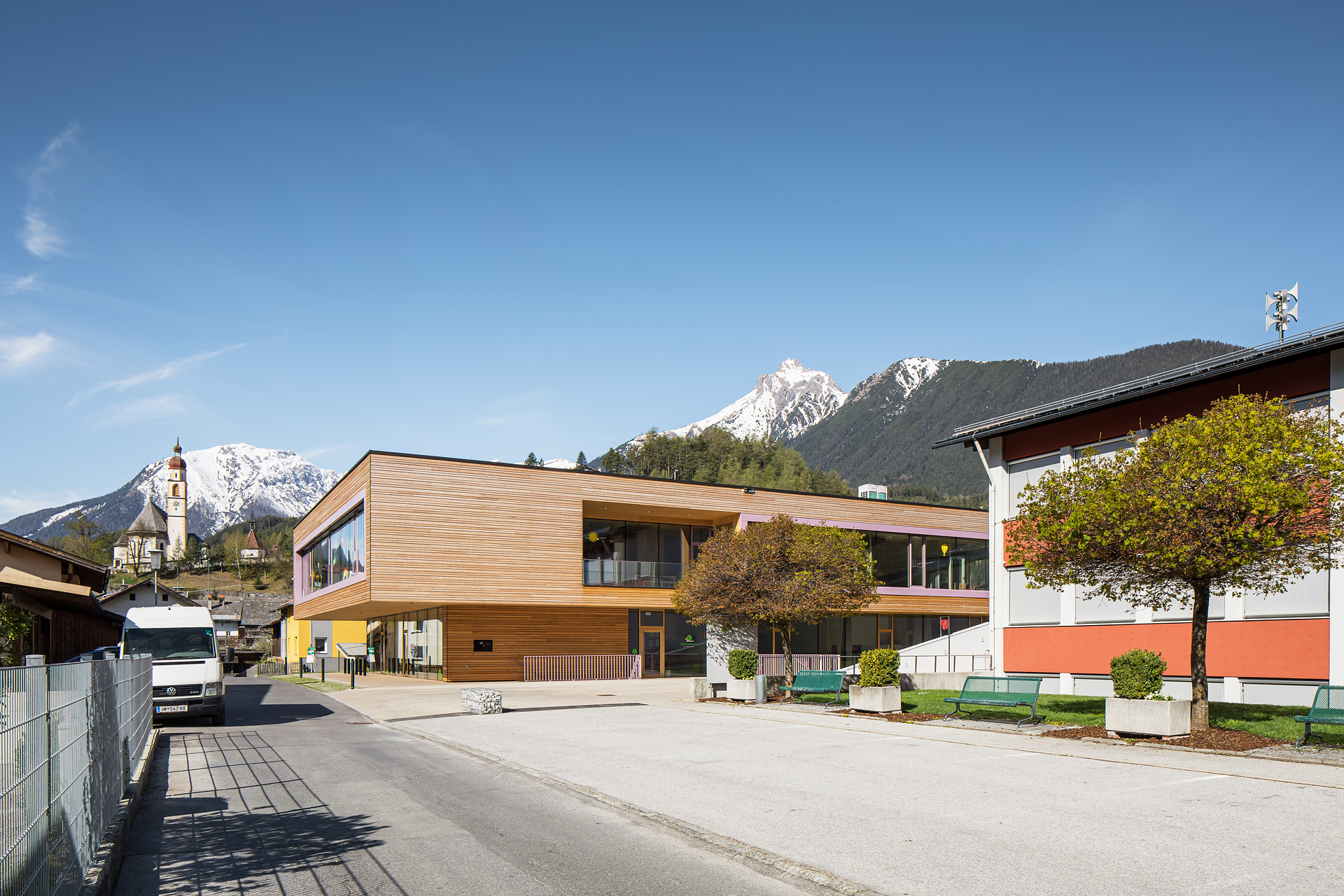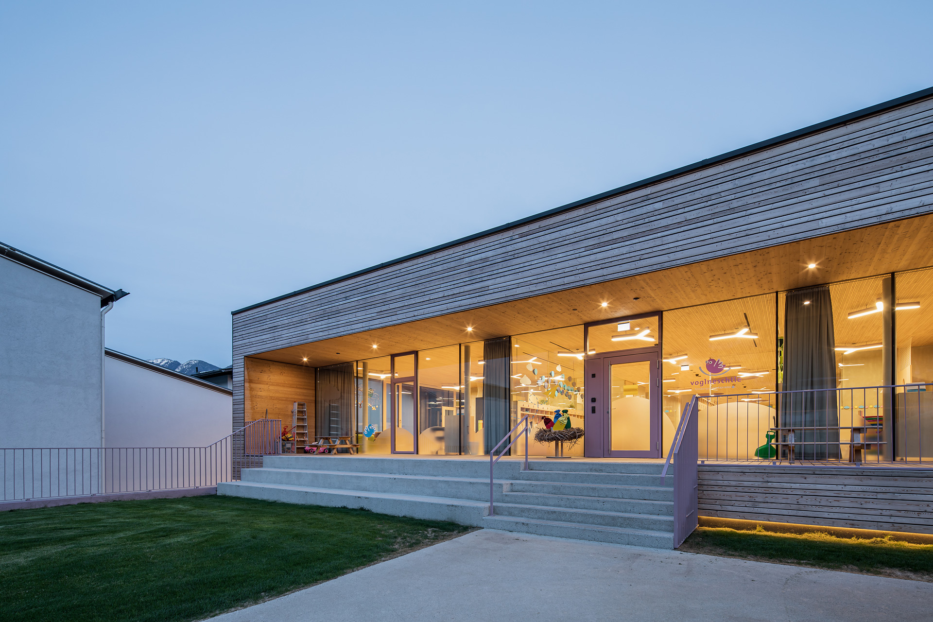 Sie bringen die 4-gruppige Kinderkrippe und den 5-gruppigen Kindergarten in einem sehr klar strukturierten, zweigeschoßigen Baukörper unter, der umgebende Gebäudefluchten aufnimmt und sich so in das bestehende Ensemble aus Schulhaus und Mehrzweckgebäude einfügt. Der flächenmäßig größere Kindergarten liegt im dreiseitig auskragenden Obergeschoß, die Kinderkrippe im zurückversetzen Erdgeschoß, wodurch südseitig auch die Straßenfluchtlinie eingehalten werden konnte. Durch Ausnutzung der Topographie erhielten beide Funktionen ebenerdig vorgelagerte Frei- und Spielbereiche.