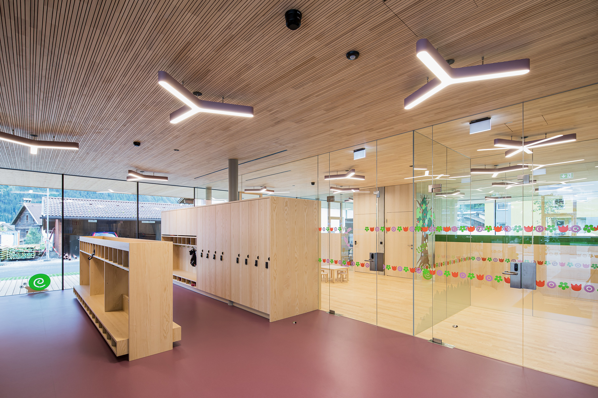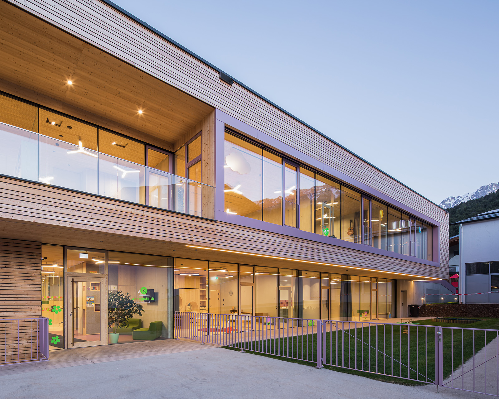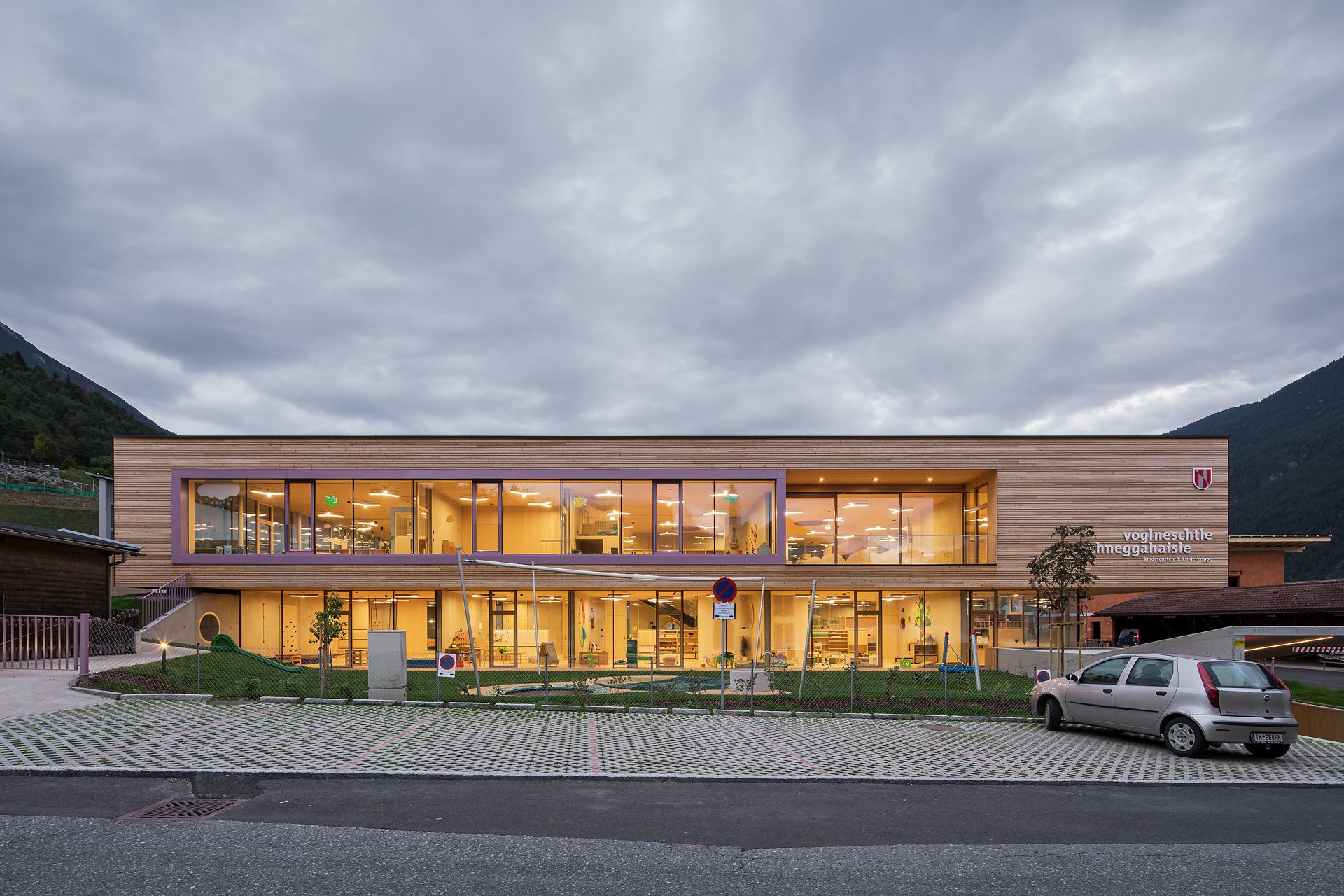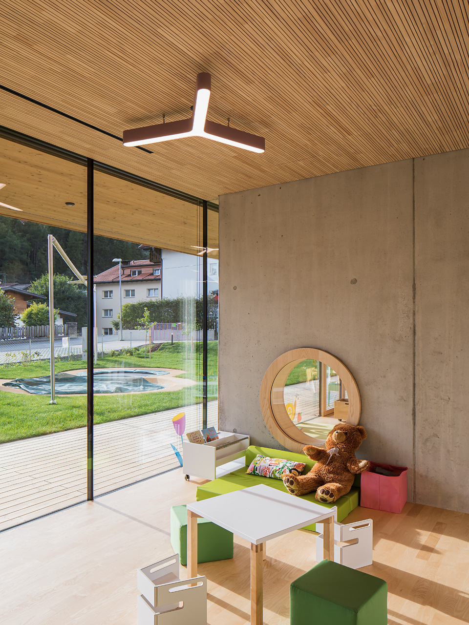 Sie bringen die 4-gruppige Kinderkrippe und den 5-gruppigen Kindergarten in einem sehr klar strukturierten, zweigeschoßigen Baukörper unter, der umgebende Gebäudefluchten aufnimmt und sich so in das bestehende Ensemble aus Schulhaus und Mehrzweckgebäude einfügt. Der flächenmäßig größere Kindergarten liegt im dreiseitig auskragenden Obergeschoß, die Kinderkrippe im zurückversetzen Erdgeschoß, wodurch südseitig auch die Straßenfluchtlinie eingehalten werden konnte. Durch Ausnutzung der Topographie erhielten beide Funktionen ebenerdig vorgelagerte Frei- und Spielbereiche.