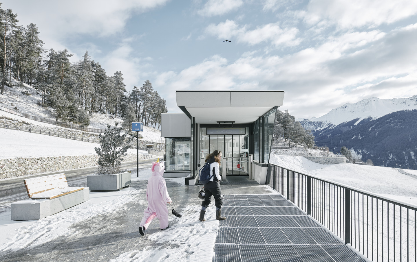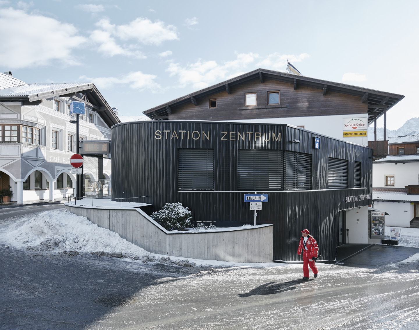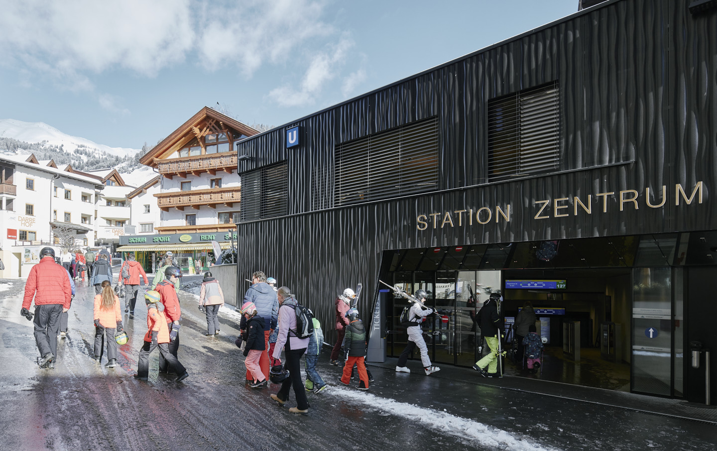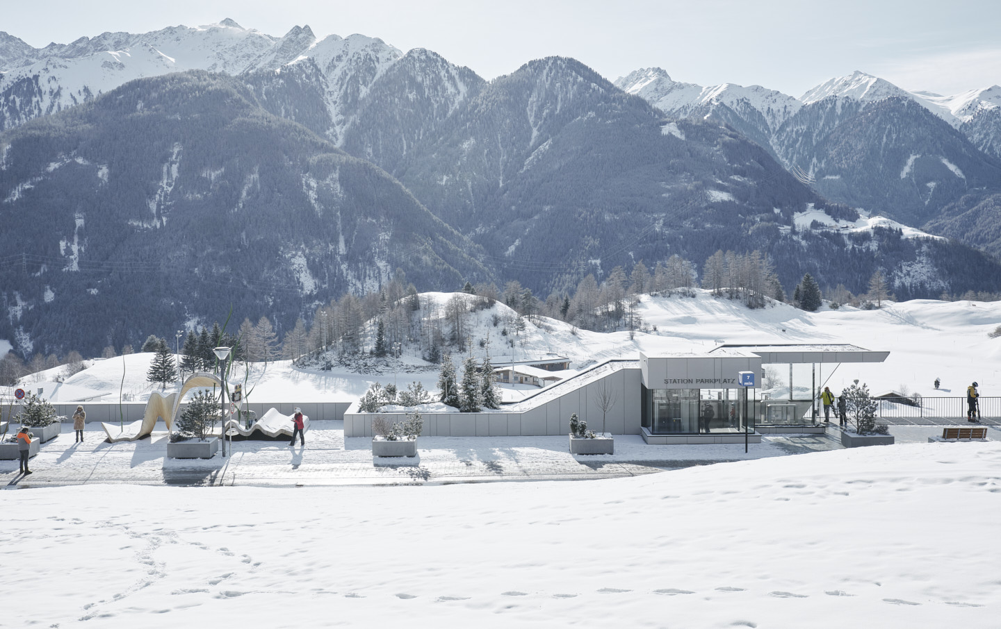 Die 1984/85 im Bergdorf Serfaus errichtete U-Bahn – eine Luftkissenschwebebahn mit Seilantrieb, die in einem 1.280 Meter langem Tunnel unterhalb der Dorfbahnstraße das östliche Dorfende mit den Seilbahnen im Westen verbindet – bedurfte einer Generalüberholung. Im Zuge der Erneuerung der technischen Anlagen sollten auch die vier Stationen an heutige Erfordernisse angepasst und als barrierefreie und familienfreundliche Erlebnis- und Begegnungsorte gestaltet werden. Ausgangspunkt für den Neubau der im Dorfzentrum liegenden Stationen „Kirche“ und „Zentrum“ und den Umbau der beiden Endstationen „Parkplatz“ und „Seilbahn“ war ein neues Licht- und Wegesystem, das zum einen die unterirdischen Bereiche möglichst natürlich belichtet und zum anderen ein intuitives Zurechtfinden gewährleistet.Der Station „Parkplatz“, ein langgezogener, dem Verlauf der Rolltreppe folgender Baukörper, kommt als Entrée zum Dorf besondere Bedeutung zu. Das in offener Bauweise gehaltene Gebäude wurde mit großen Fensterfronten ausgestattet, die viel Tageslicht in alle Bereiche der Station bringen und einen Ausblick in die Bergwelt bieten.