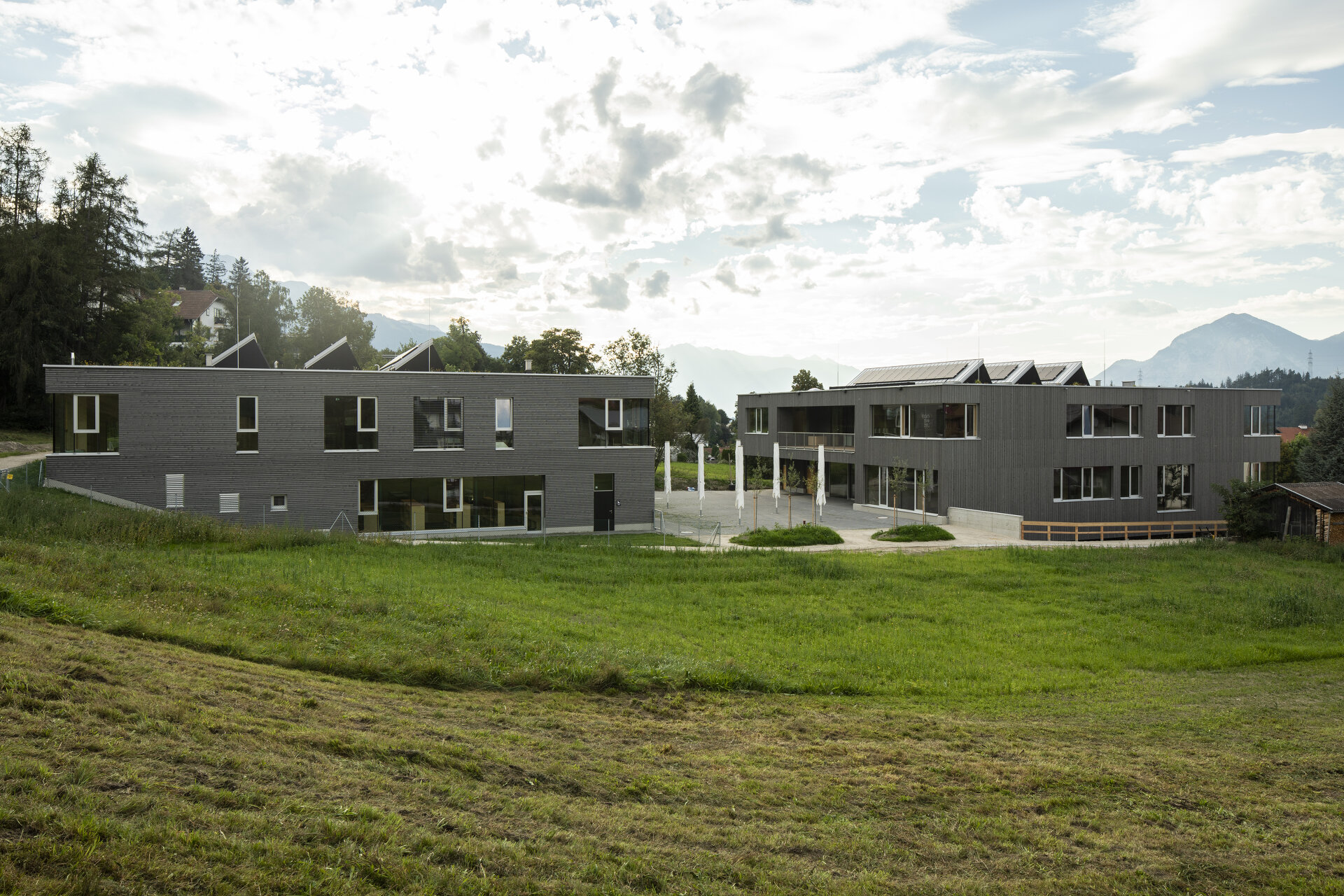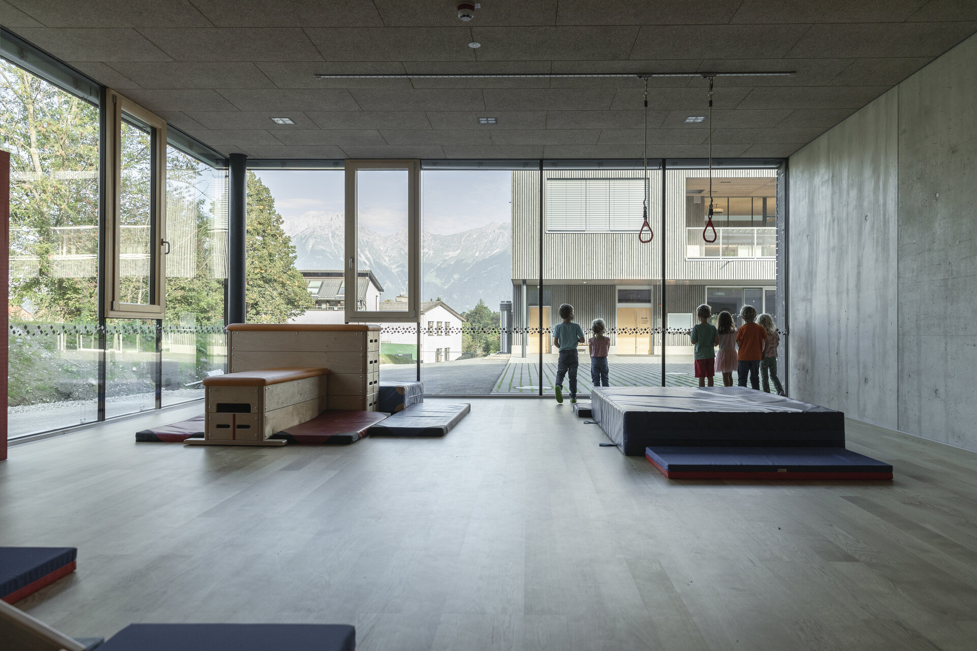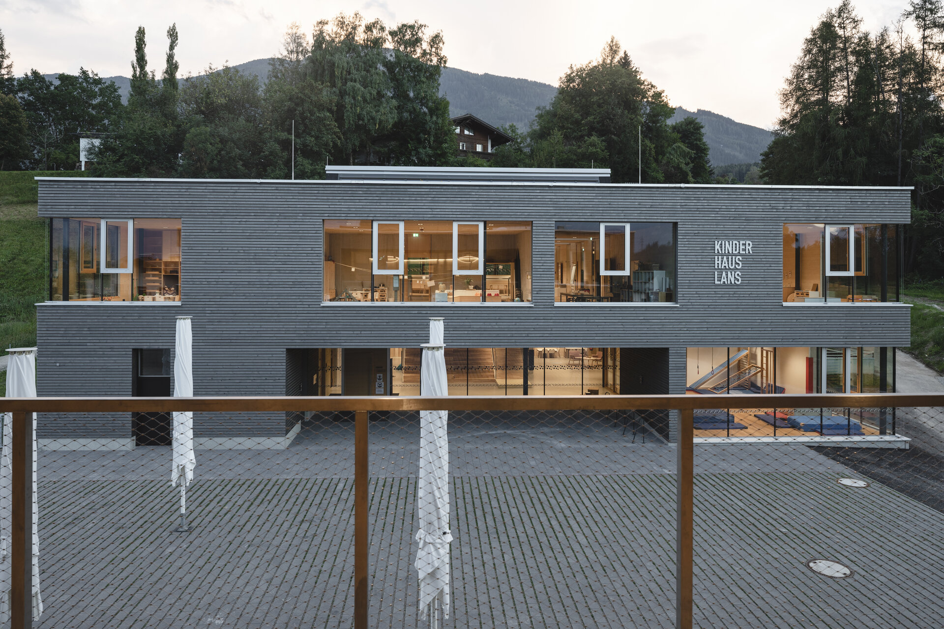 Das aus Volksschule, Kindergarten und Kinderkrippe bestehende neue Kinderbildungszentrum der Gemeinde Lans bietet den drei Bildungseinrichtungen den für eine zeitgemäße Pädagogik notwendigen Raum. Vorher waren diese in einem historisch gewachsenen Gebäudekomplex im Ortszentrum untergebracht. Großer Sanierungsbedarf und erhebliche Mängel führten zur Entscheidung, zwei im Süden angrenzende Grundstücke für den Neubau einer vierklassigen Volksschule, einer zweigruppigen Kinderkrippe und eines dreigruppigen Kindergartens anzukaufen.Schwärzler Architekten, die den EU-weit offenen Realisierungswettbewerb gewinnen konnten, teilten das Raumprogramm in Reaktion auf die umliegende Baustruktur auf zwei, leicht zueinander versetzt angeordnete, kompakte Baukörper auf. Zwischen dem Schulhaus im Norden und dem Kinderhaus im Süden wurde ein gemeinsamer Vorplatz geschaffen, der Mittelpunkt der Anlage und Treffpunkt für alle Altersstufen ist. Zu diesem zentralen Bindeglied orientieren sich die gedeckten Eingangszonen der annähernd quadratischen Gebäude, in deren Zentrum sich jeweils große, von je drei Oberlichten mit natürlichem Licht versorgte Atrien befinden, die zueinander in Blickbeziehung treten.