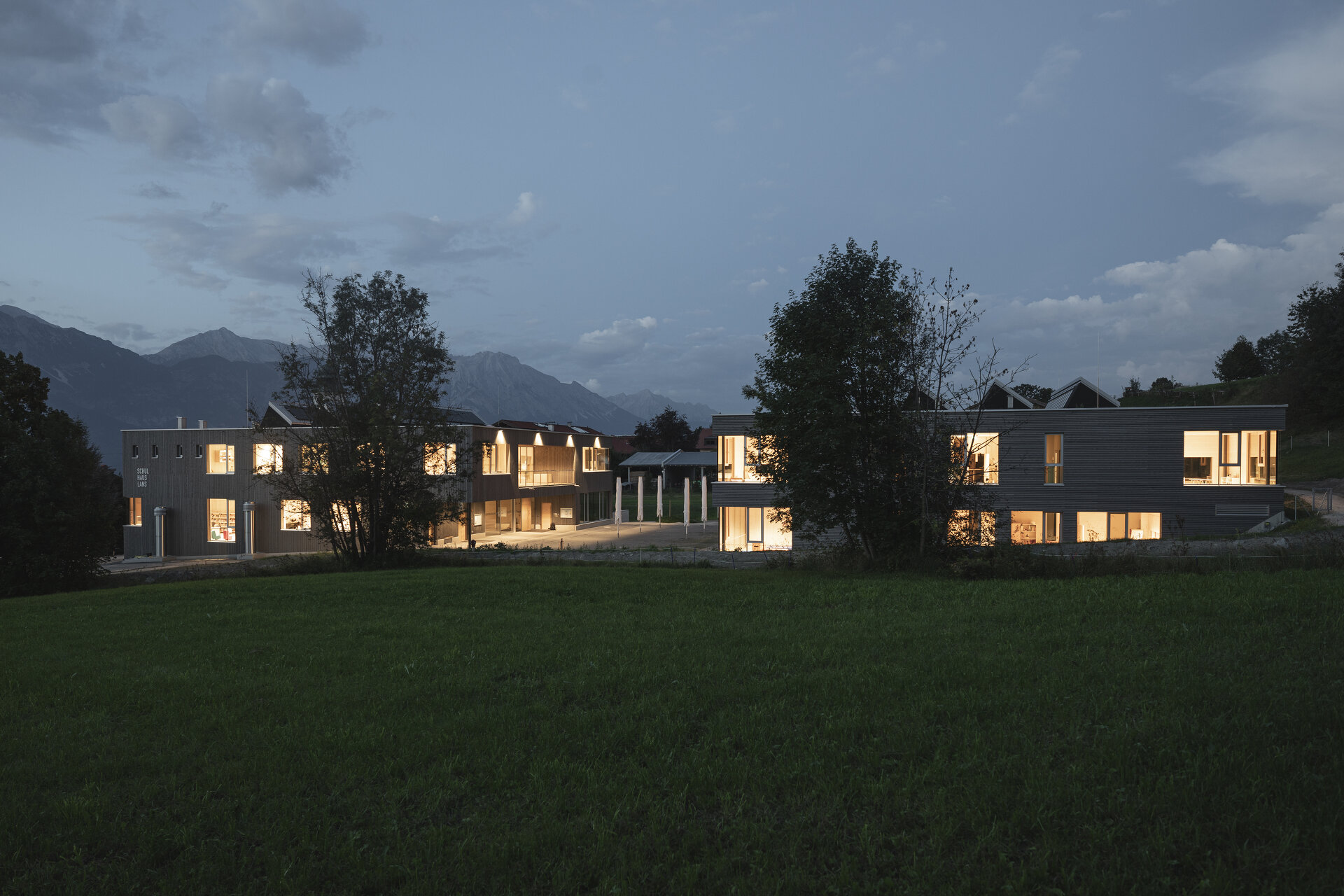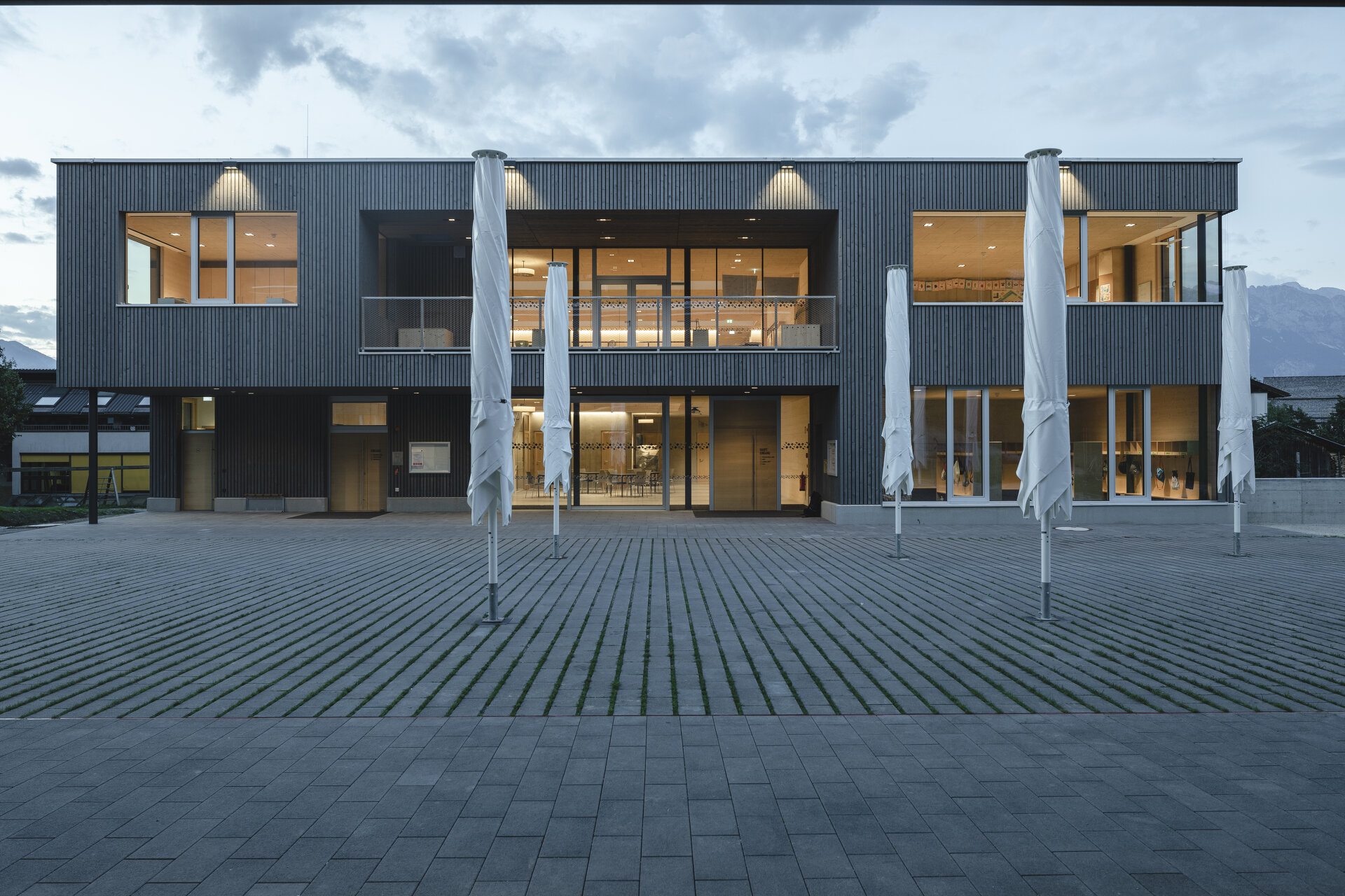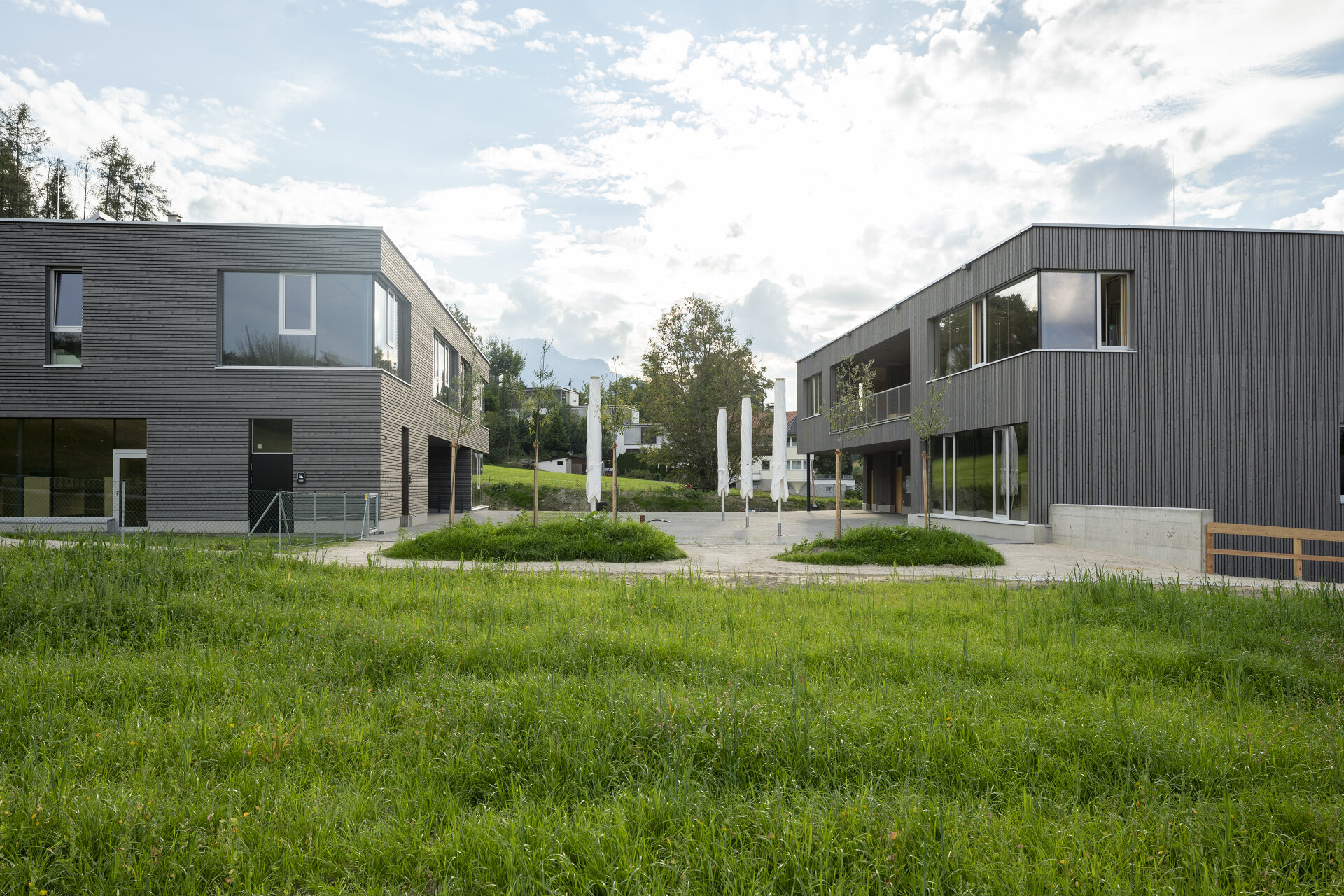 Das aus Volksschule, Kindergarten und Kinderkrippe bestehende neue Kinderbildungszentrum der Gemeinde Lans bietet den drei Bildungseinrichtungen den für eine zeitgemäße Pädagogik notwendigen Raum. Vorher waren diese in einem historisch gewachsenen Gebäudekomplex im Ortszentrum untergebracht. Großer Sanierungsbedarf und erhebliche Mängel führten zur Entscheidung, zwei im Süden angrenzende Grundstücke für den Neubau einer vierklassigen Volksschule, einer zweigruppigen Kinderkrippe und eines dreigruppigen Kindergartens anzukaufen.Schwärzler Architekten, die den EU-weit offenen Realisierungswettbewerb gewinnen konnten, teilten das Raumprogramm in Reaktion auf die umliegende Baustruktur auf zwei, leicht zueinander versetzt angeordnete, kompakte Baukörper auf. Zwischen dem Schulhaus im Norden und dem Kinderhaus im Süden wurde ein gemeinsamer Vorplatz geschaffen, der Mittelpunkt der Anlage und Treffpunkt für alle Altersstufen ist. Zu diesem zentralen Bindeglied orientieren sich die gedeckten Eingangszonen der annähernd quadratischen Gebäude, in deren Zentrum sich jeweils große, von je drei Oberlichten mit natürlichem Licht versorgte Atrien befinden, die zueinander in Blickbeziehung treten.