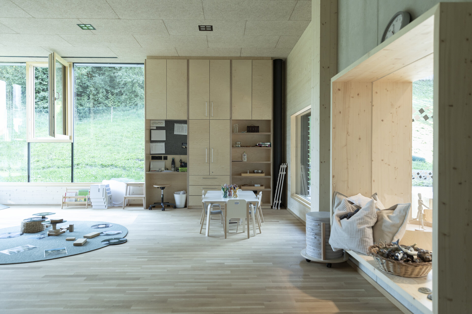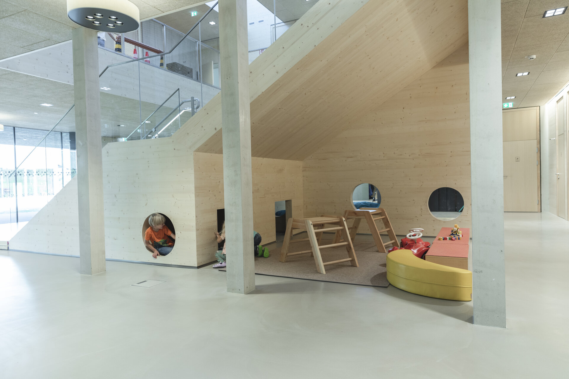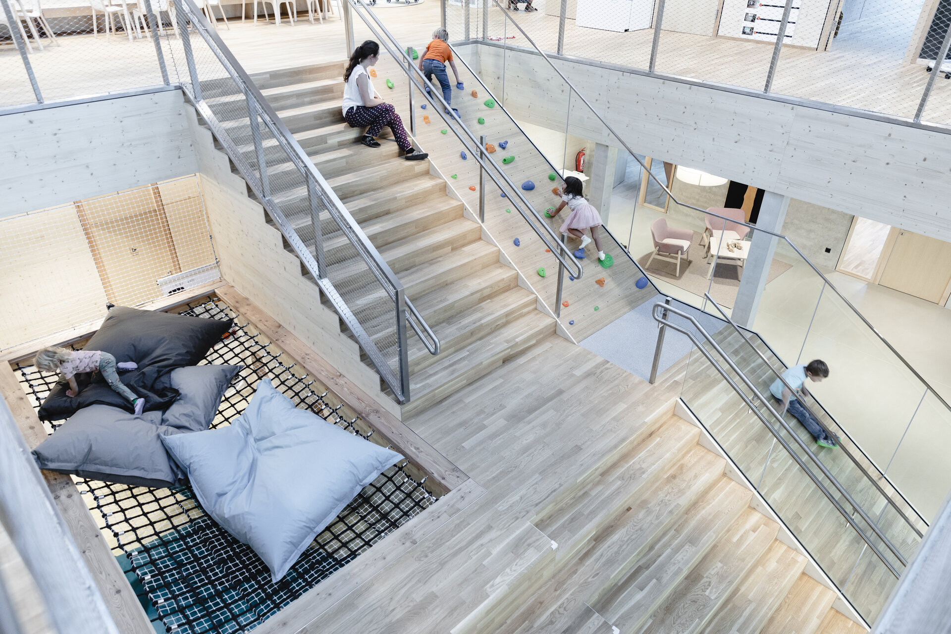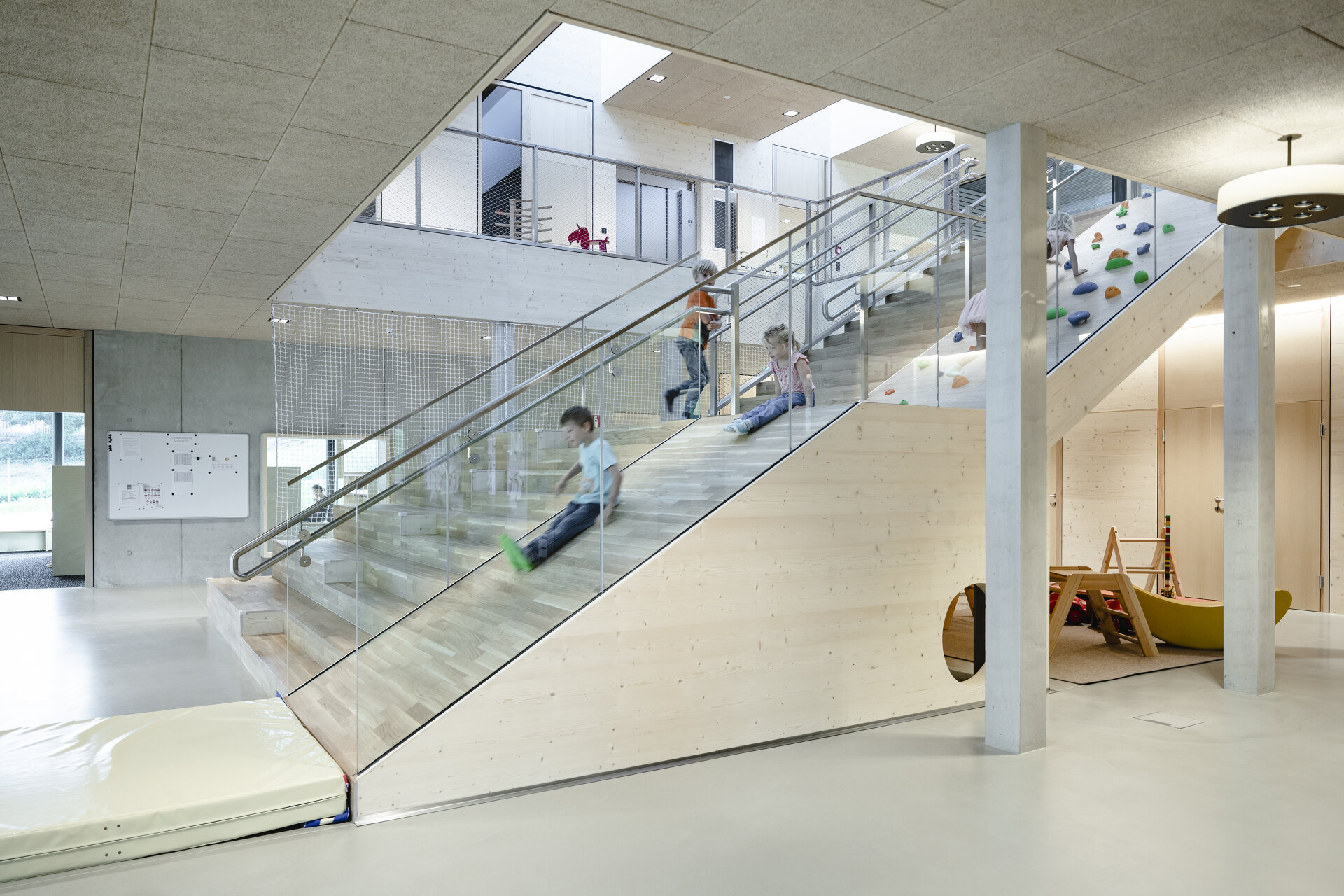 Auch im Kinderhaus befinden sich die Gruppenräume von Kindergarten und Kinderkrippe im Obergeschoß, eine große, überdeckte Spielterrasse schließt aufgrund der Hanglage ebenerdig an das angrenzende Gelände. Erschlossen wird das Obergeschoß über eine zentral in der Aula situierte Stufenanlage, die mit einer Kletter- und Rutschstrecke, einem Liege- und Sitznetz auf halber Höhe und einem Rückzugsbereich unter der Treppe über interessante Details verfügt. Rund um die Aula im Erdgeschoß angeordnet sind der Bewegungsraum, die Verwaltung- und Nebenräume sowie die Zentralgarderobe.