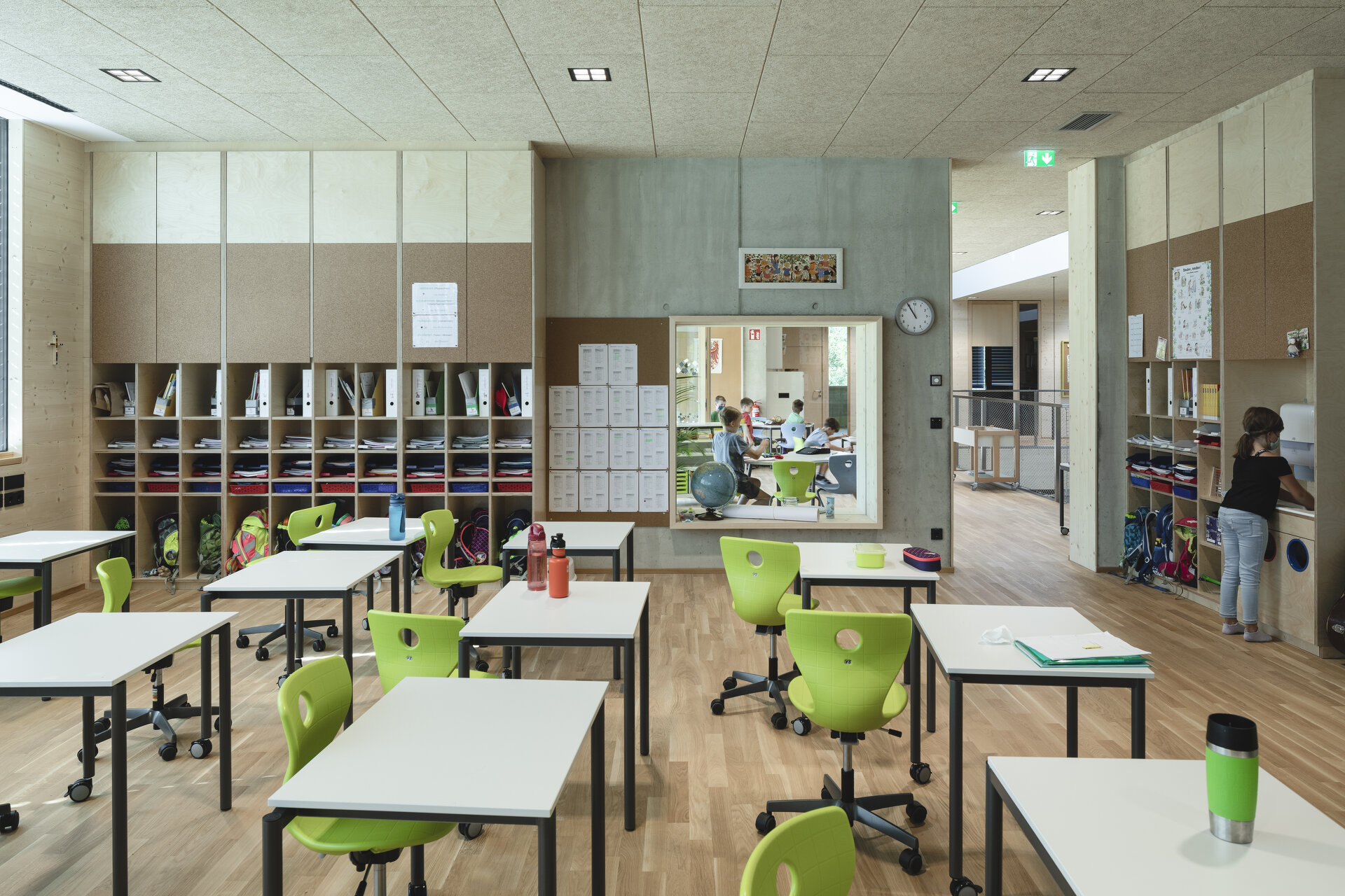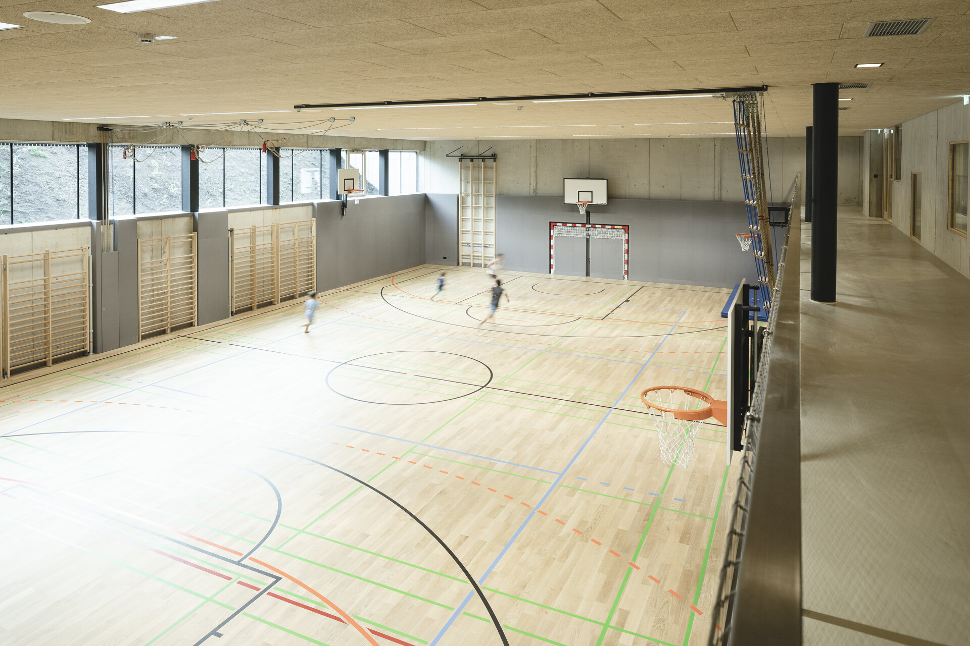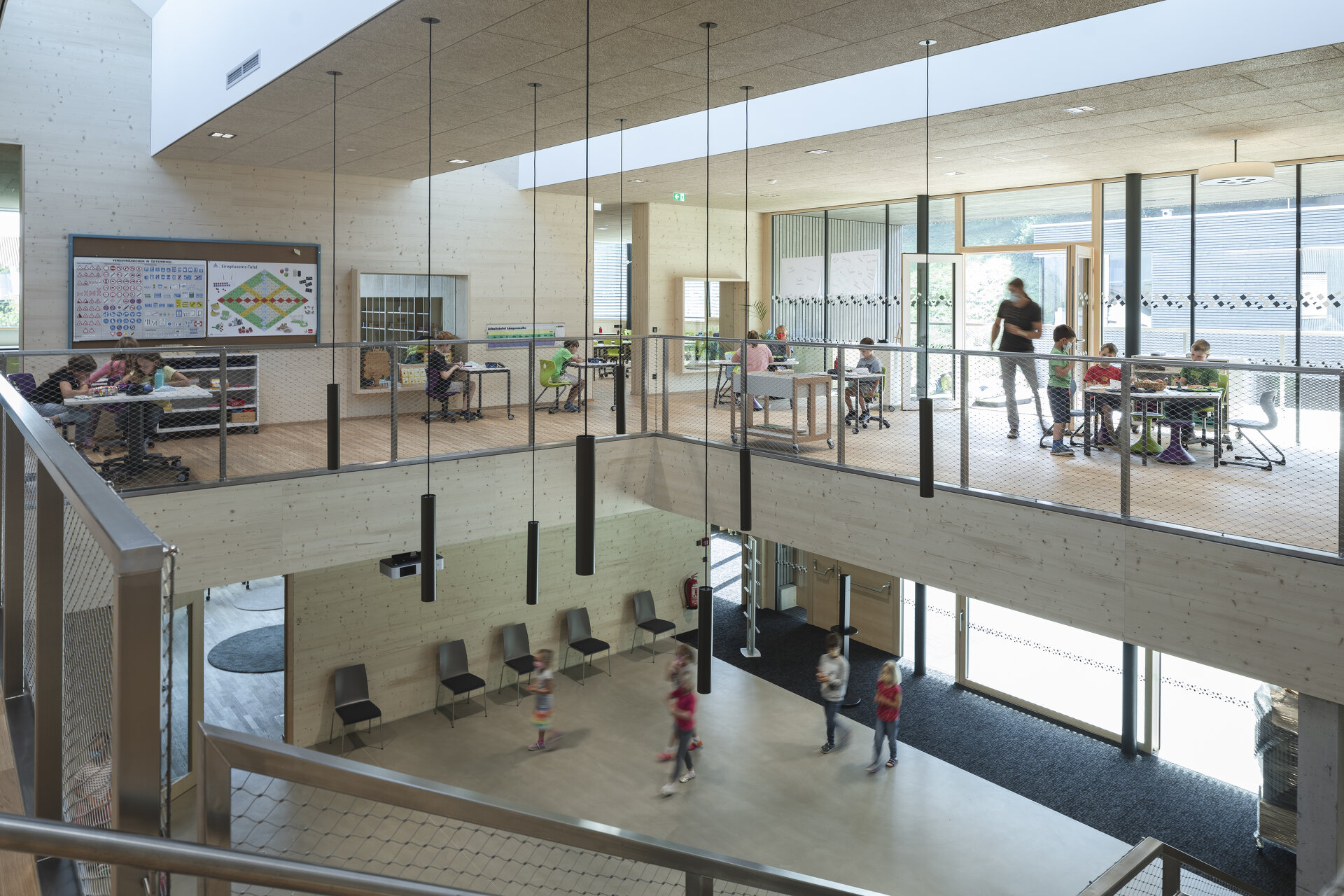 Im Erdgeschoß des Schulhauses liegen rund um die zentrale Aula die Sonderunterrichtsräume, die Bibliothek, der Hort für die Nachmittagsbetreuung und die Räume für die Musikschule. Die Turn- und Mehrzweckhalle ist großteils im Gelände eingegraben und wird talseitig über ein Oberlichtband belichtet. Das Obergeschoß besteht aus einer rund um den Luftraum angeordneten offenen Lernlandschaft, an die die vier Klassenräume sowie eine überdachte Terrasse grenzen.