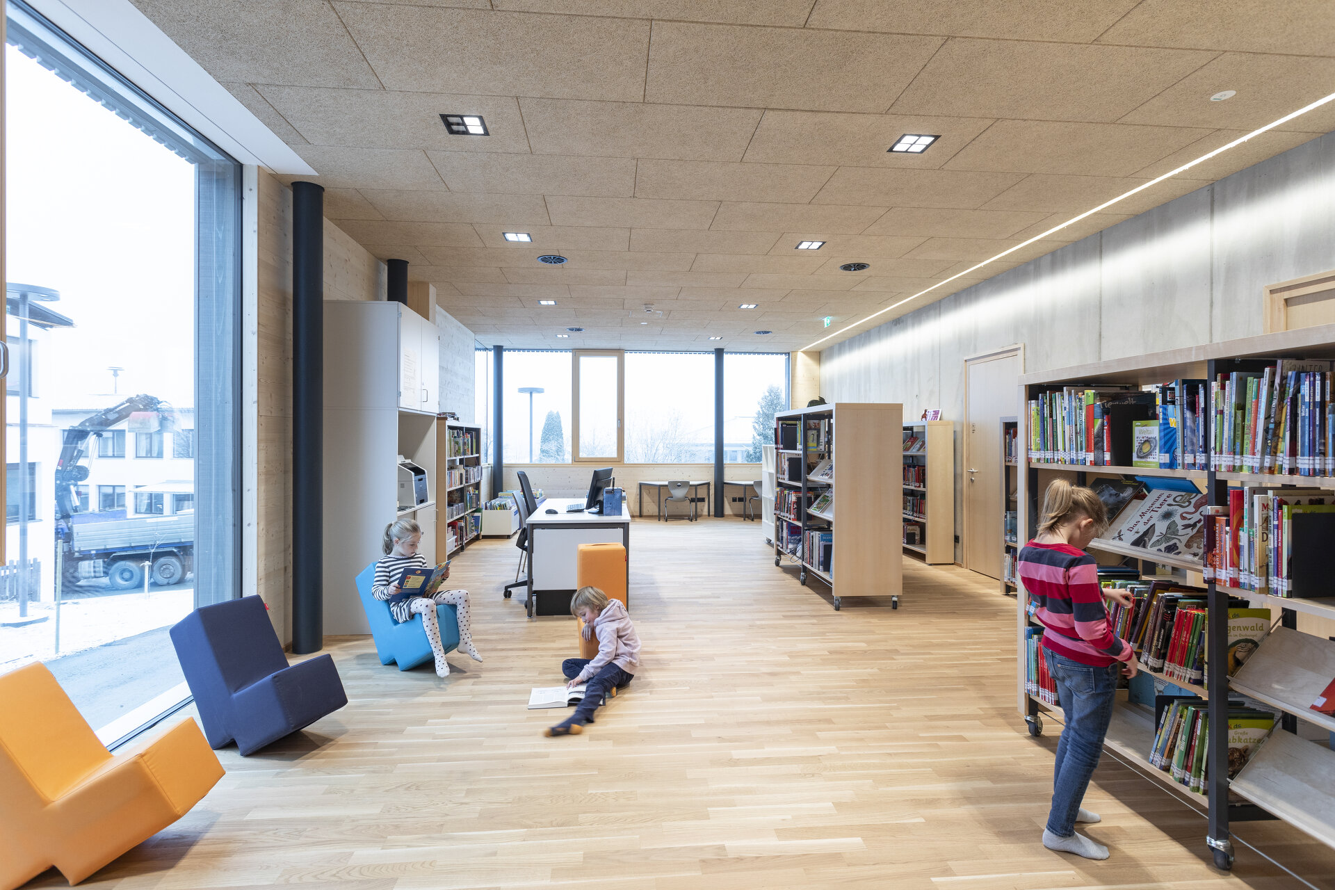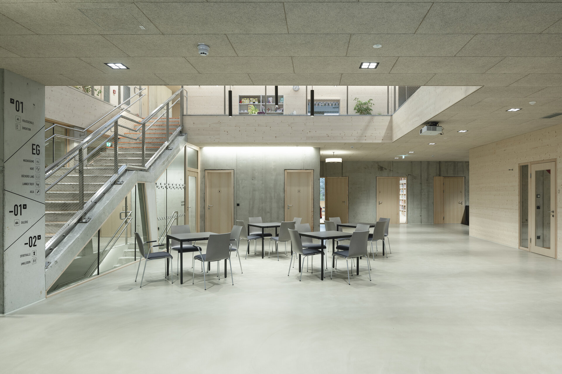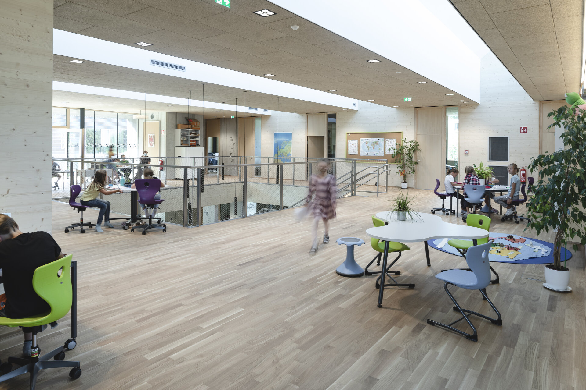 Insgesamt zeichnet sich das neue, in Holzmassiv-Bauweise mit hinterlüfteter Holzfassade ausgeführte Bildungszentrum durch seine offene Raumstruktur mit flexibel nutzbaren Räumen aus, die dem Prinzip des offenen Lernens folgen. Abgehängte Heradesigndecken und Wandverkleidungen in Holz tragen in Kombination mit Sichtbeton zu einer wohnlichen und akustisch angenehmen Atmosphäre bei. (Text: Claudia Wedekind)