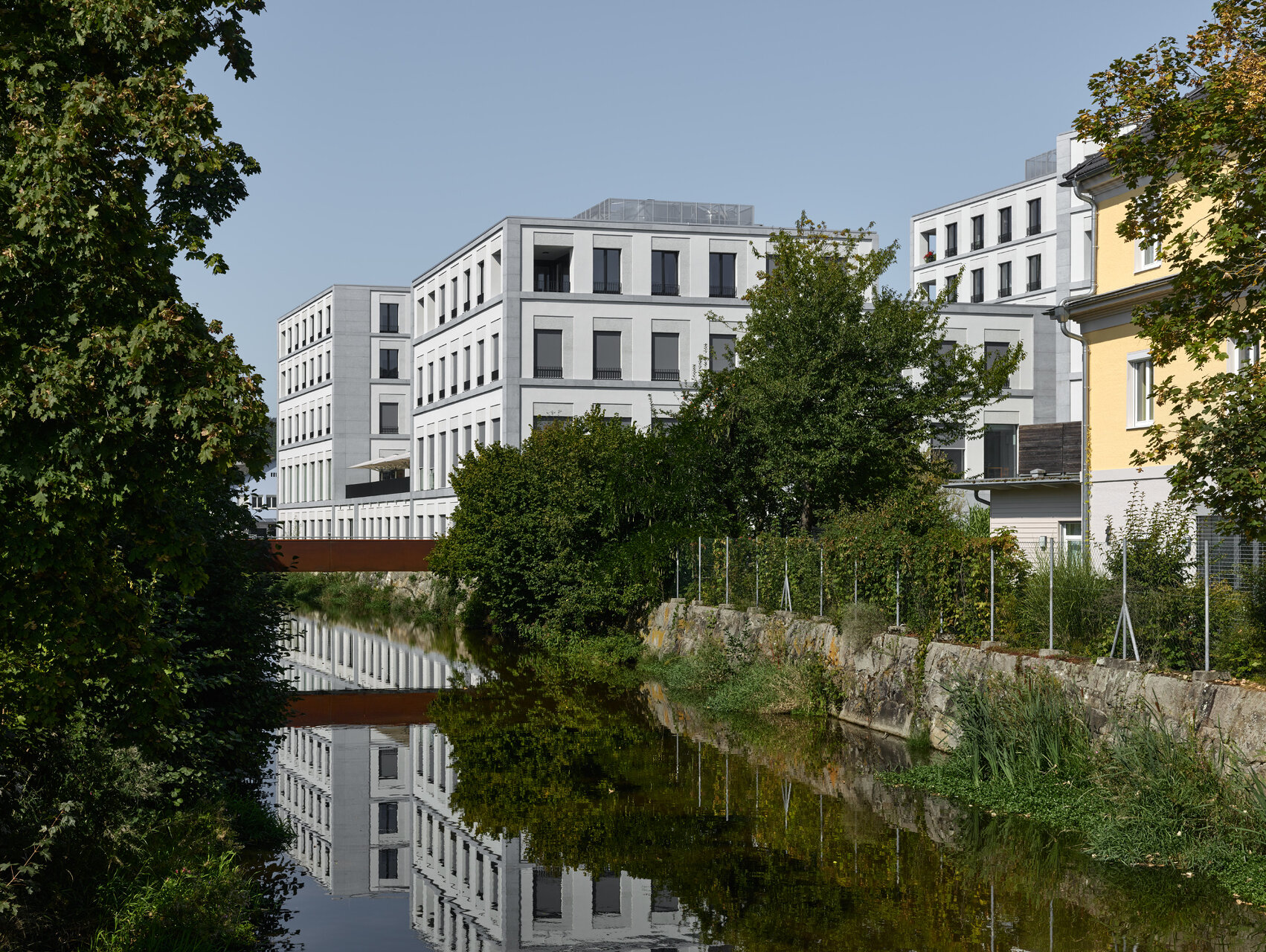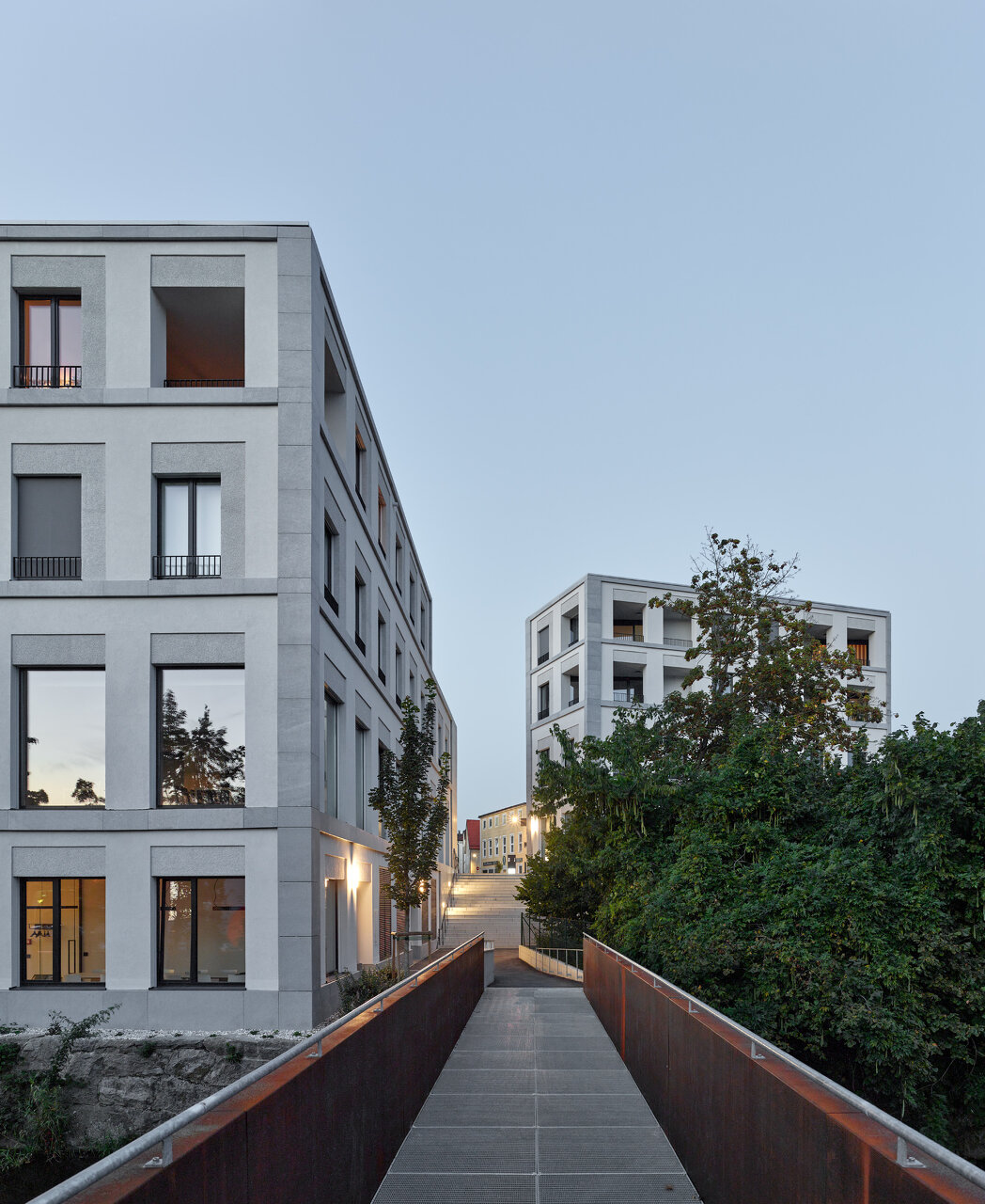 Durch die Anordnung und Orientierung der Baukörper können fast alle Wohnungen von Südlage und Ausblick profitieren. Die Gastronomie- und Einkaufsflächen im Erdgeschoß orientieren sich im Wechselspiel von überdachten und offenen Räumen entlang der Wegeverbindungen. Im ersten Geschoß bilden frei unterteilbare Büro- und Praxisflächen einen räumlichen Puffer zu den Wohnnutzungen darüber. Der öffentliche Charakter des Areals wird, neben den Fußwegen, durch das Parkdeck auf der unteren Platzebene gestärkt. (Text: Architekten)