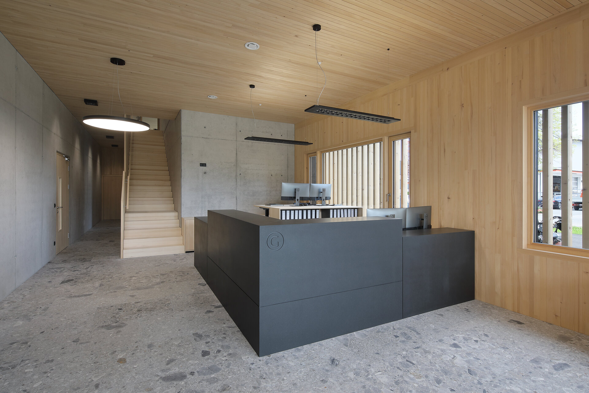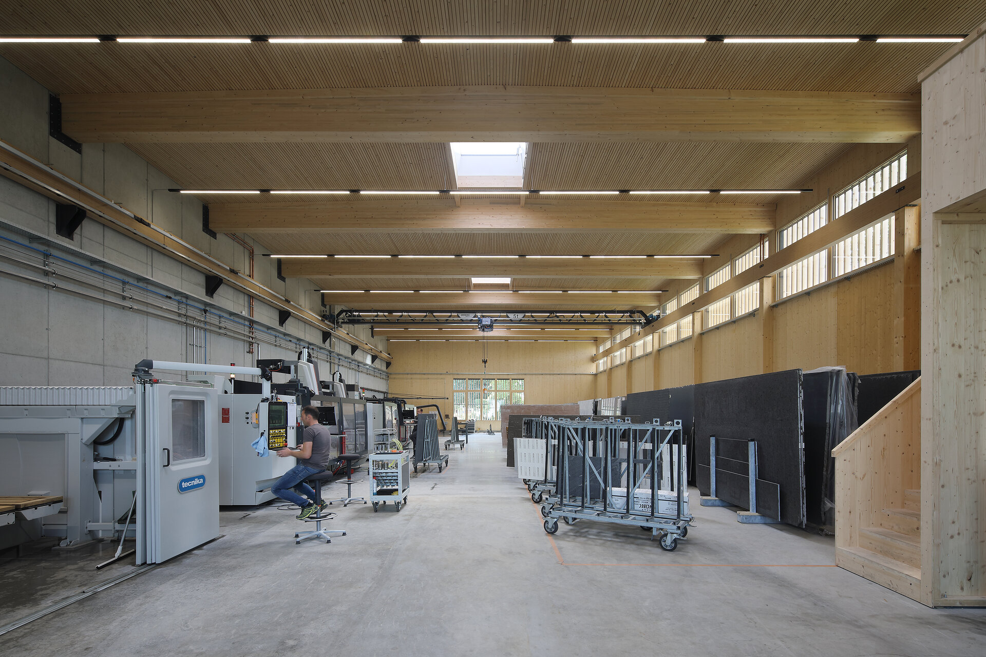 Das Gebäude selbst gliedert sich in eine lichtdurchflutete Produktions- und Lagerhalle sowie in einen zweigeschossigen Büro- und Ausstellungsbereich. Bodenplatte, Trennwand zur Halle sowie ein Erschließungskern sind in Stahlbeton ausgeführt. Der Rest des Gebäudes ist als reiner Holzbau konzipiert. Die Massivholzdecken im Büro sowie in der Produktionshalle sind akustisch schallschluckend ausgeführt. Die Außenwände sind mit Zellulose gedämmt.